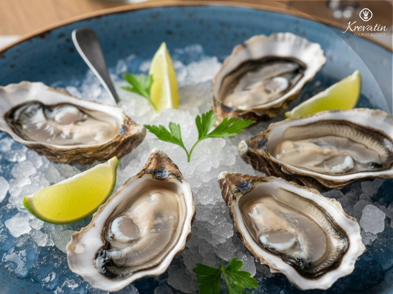 Jela uključuju dagnje na buzari, rižote i tjesteninu s morskim plodovima, jakobove kapice pečene u pećnici i suvremene opcije poput carpaccia od dagnji ili dagnji uparenih s istarskim tartufima.