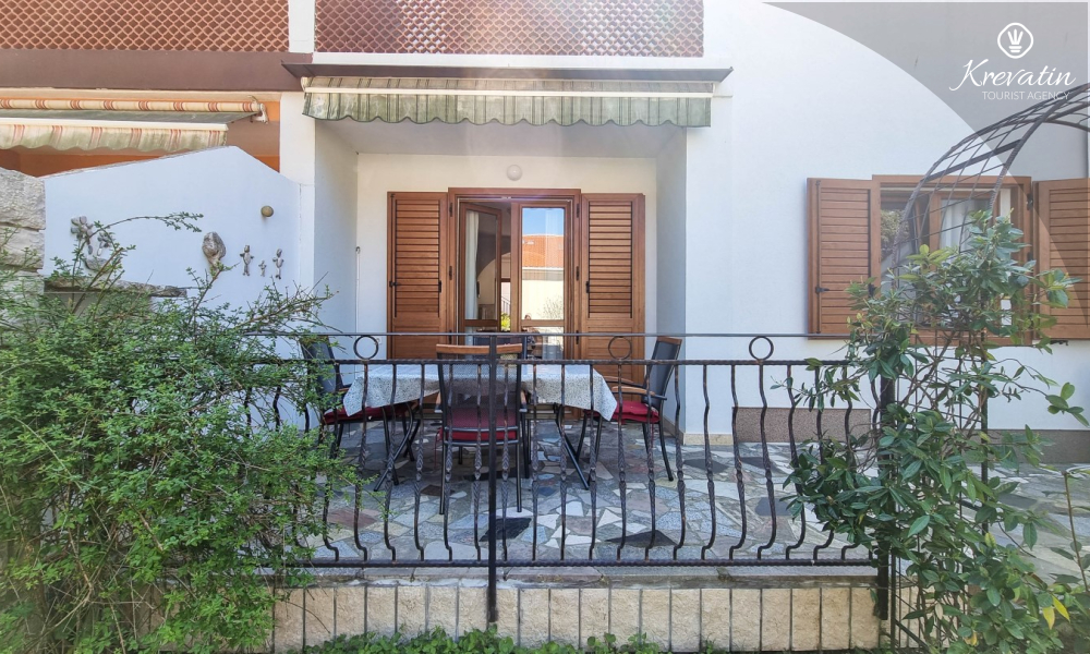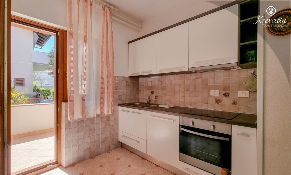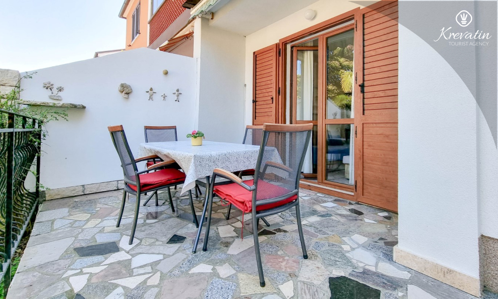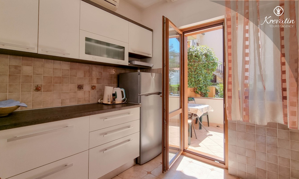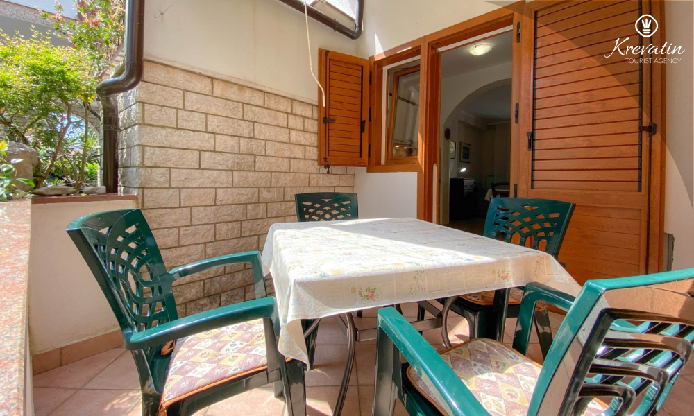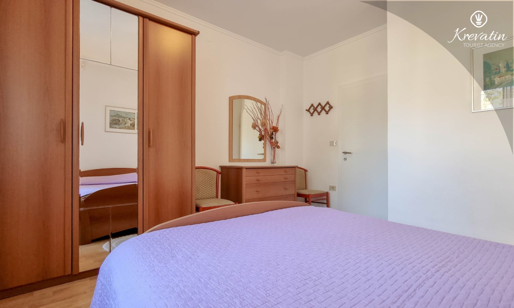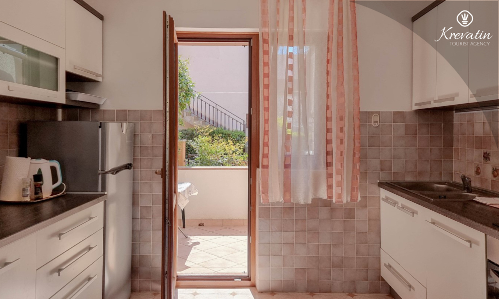 Sastoji se od spavaće sobe s bračnim krevetom, te dnevnog boravka s kaučem na razvlačenje, za dodatne dvije osobe. Blagovaonica je u sklopu kuhinje koja raspolaže osnovnim stvarima za pripremu oborka. Kupaonice je opremljena tušem i WC-om. Na terasi s vrtnim namještajem možete uživati u prvoj jutarnjoj kavi ili opuštenim večerima nakon dana provedenog na plaži i suncu.