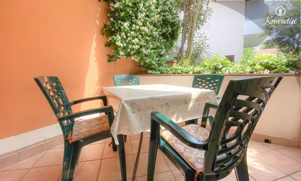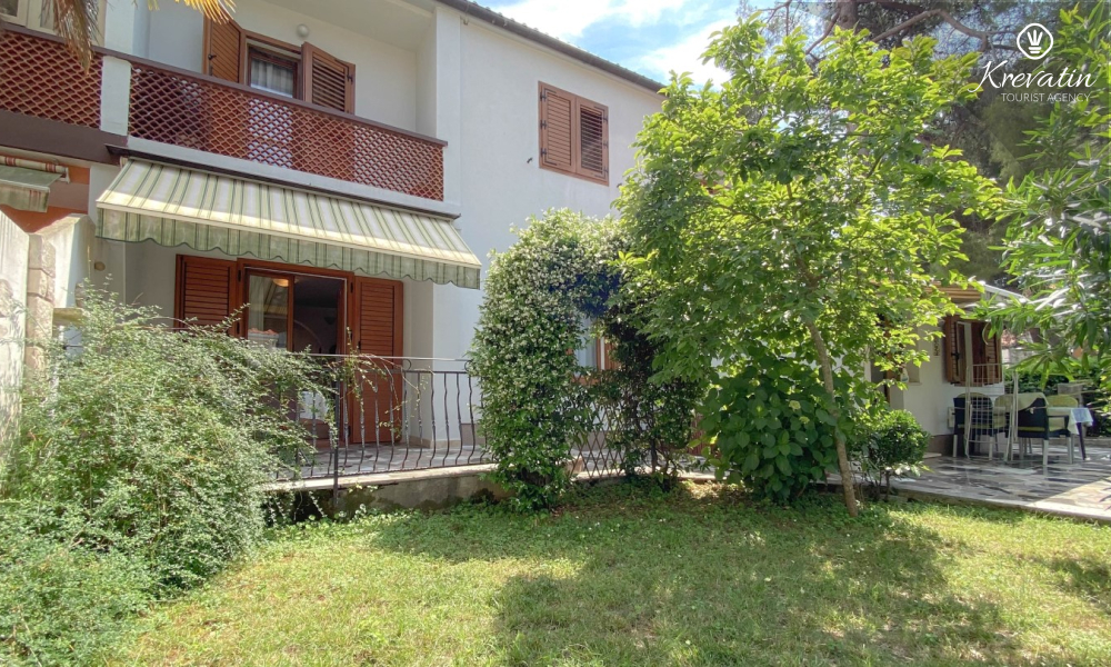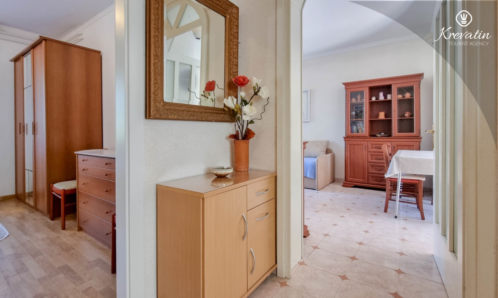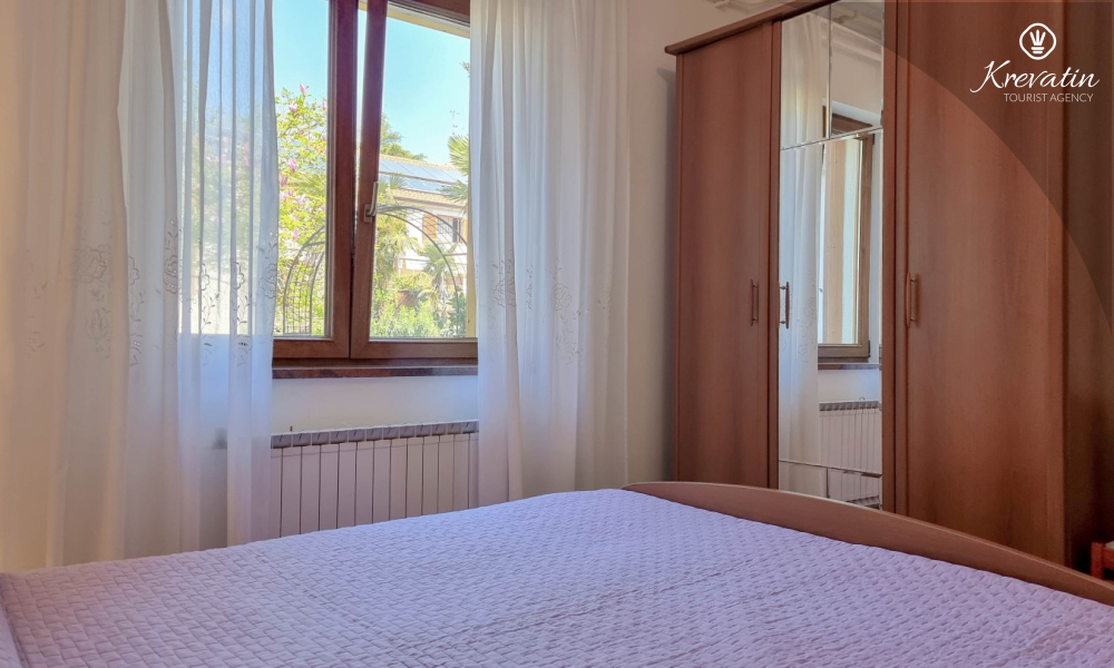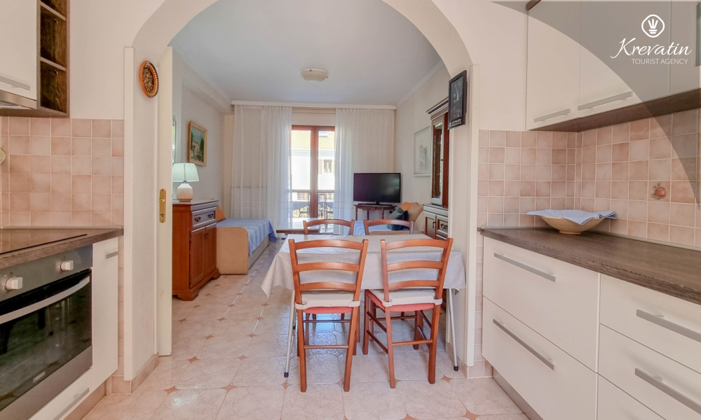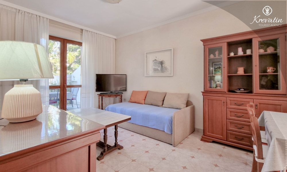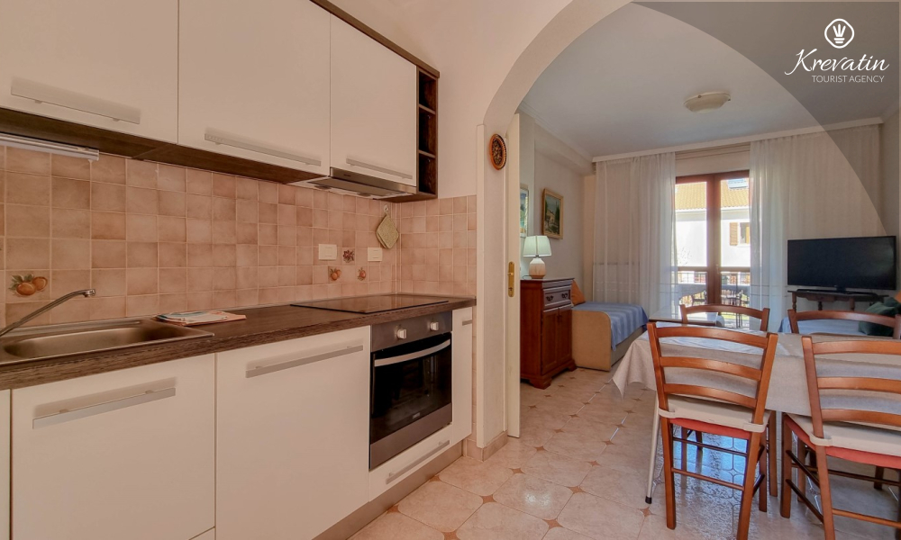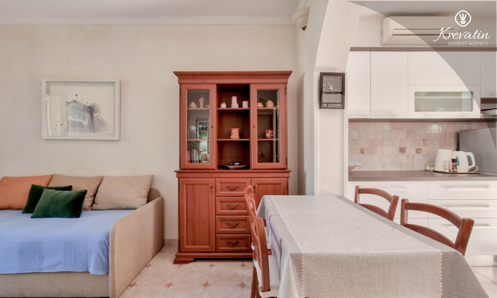 Sastoji se od spavaće sobe s bračnim krevetom, te dnevnog boravka s kaučem na razvlačenje, za dodatne dvije osobe. Blagovaonica je u sklopu kuhinje koja raspolaže osnovnim stvarima za pripremu oborka. Kupaonice je opremljena tušem i WC-om. Na terasi s vrtnim namještajem možete uživati u prvoj jutarnjoj kavi ili opuštenim večerima nakon dana provedenog na plaži i suncu.