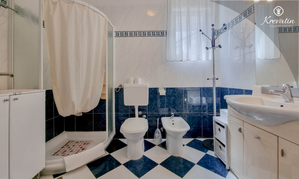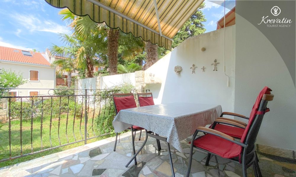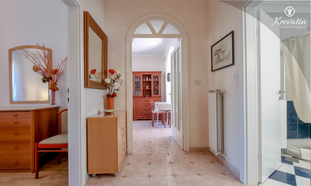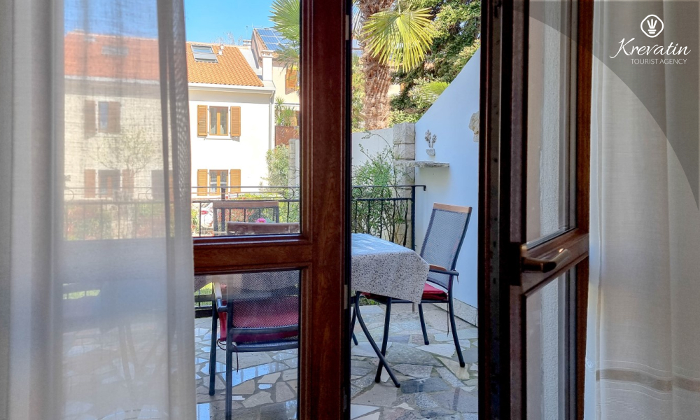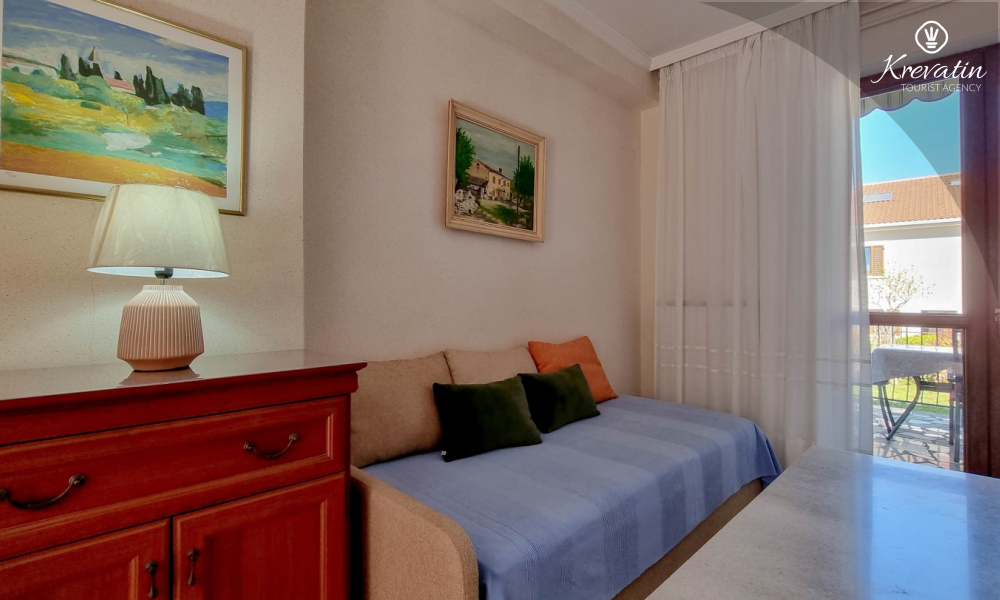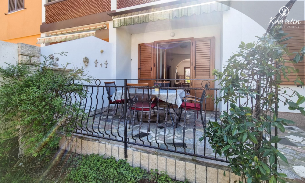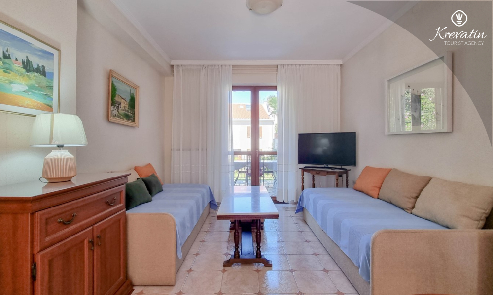 Sastoji se od spavaće sobe s bračnim krevetom, te dnevnog boravka s kaučem na razvlačenje, za dodatne dvije osobe. Blagovaonica je u sklopu kuhinje koja raspolaže osnovnim stvarima za pripremu oborka. Kupaonice je opremljena tušem i WC-om. Na terasi s vrtnim namještajem možete uživati u prvoj jutarnjoj kavi ili opuštenim večerima nakon dana provedenog na plaži i suncu.