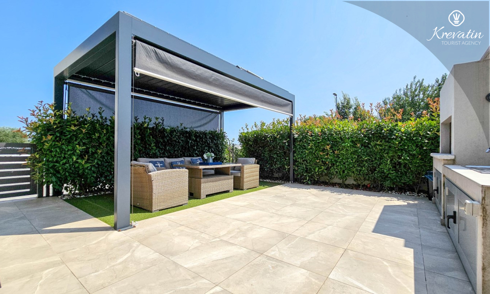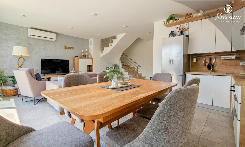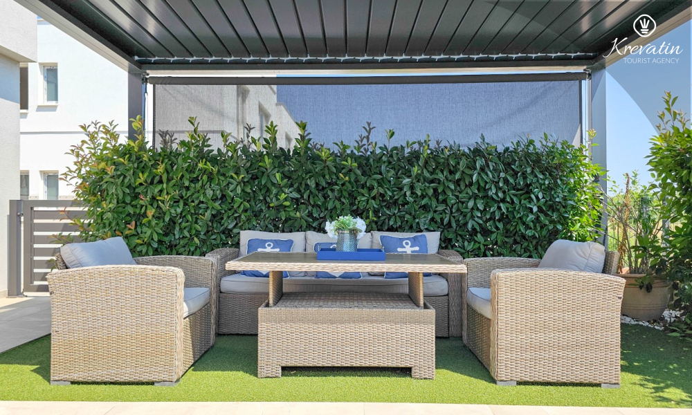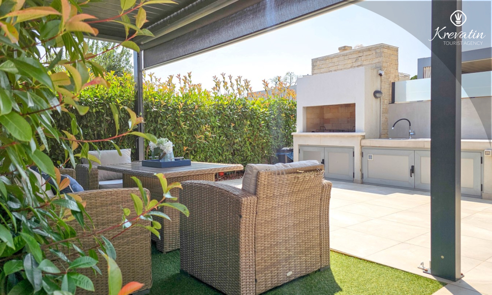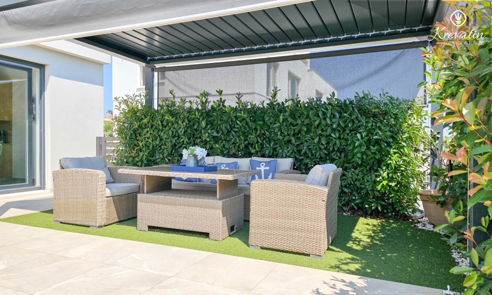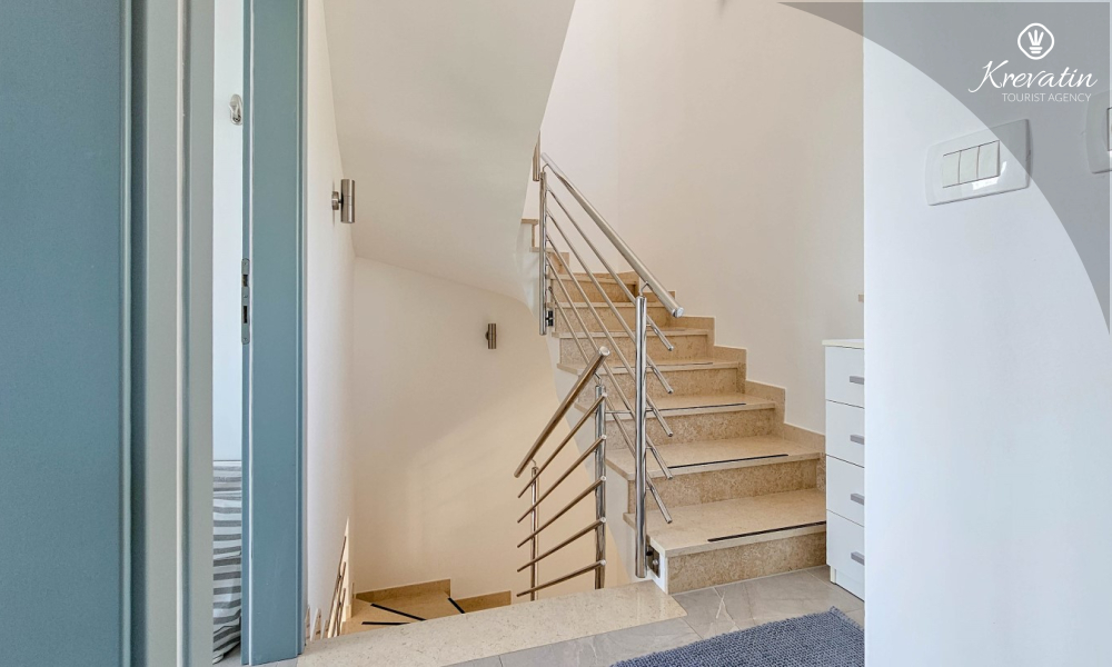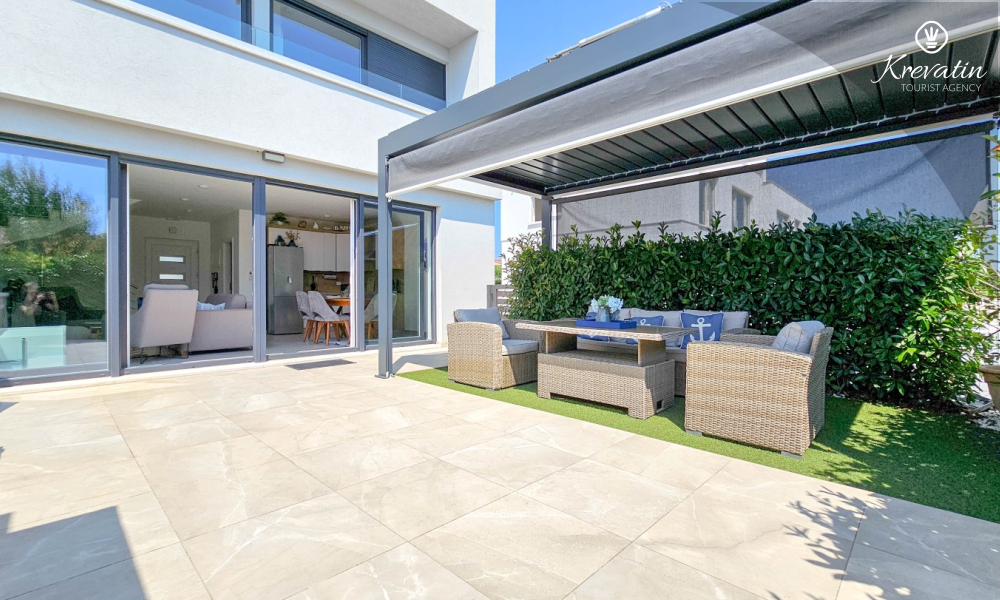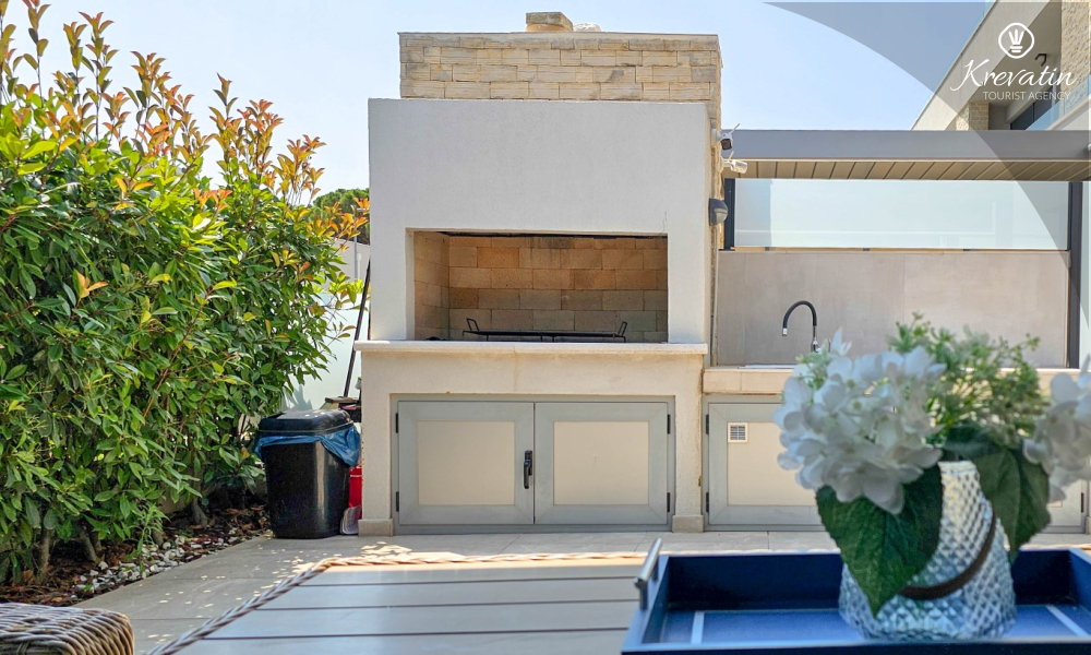 Kuća se proteže na dvije etaže, i raspolaže s dvije prostrane terase. Krovna terasa s garniturom za sjedenje i panoramskim pogledom na marinu i stari grad, a prizemna terasa je opremljena vrtnom garniturom i roštiljem - idealna za druženje na otvorenom.