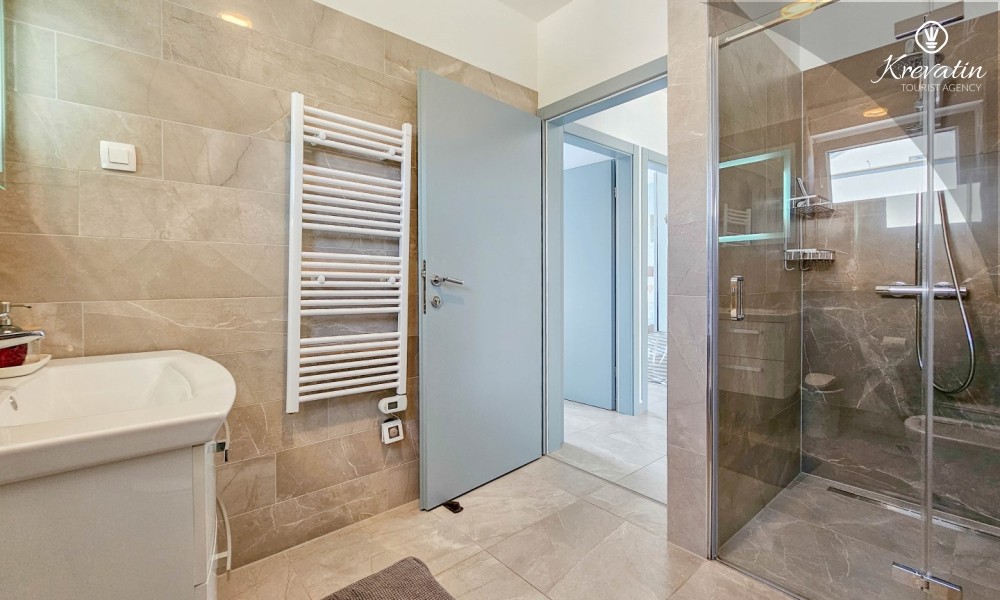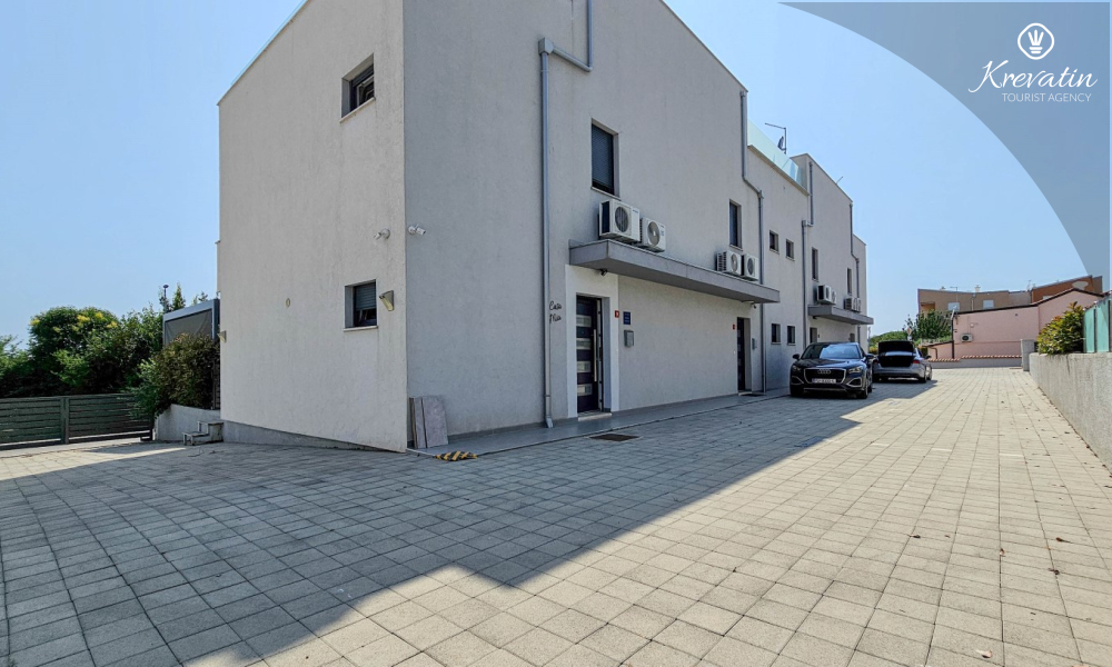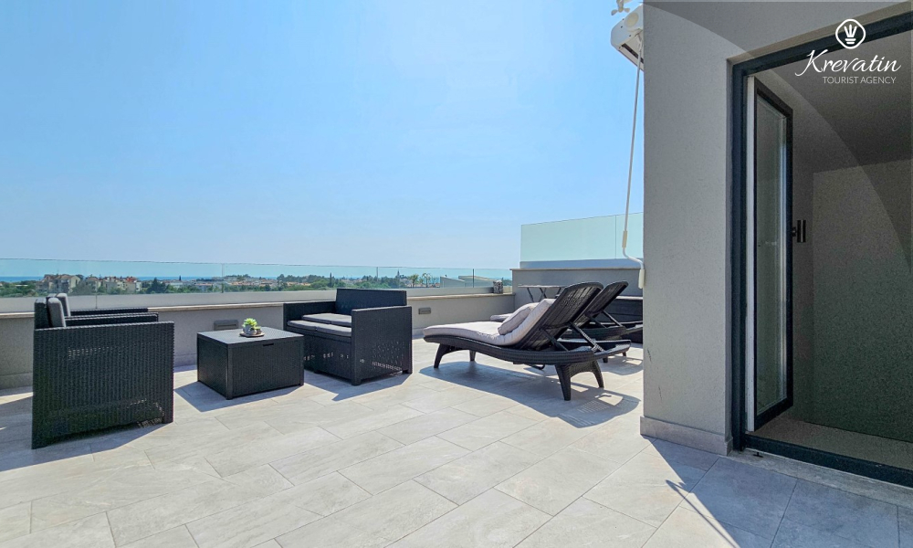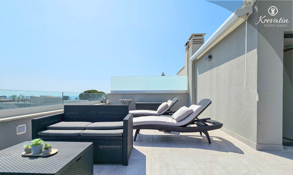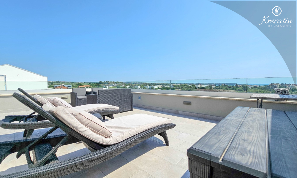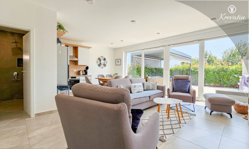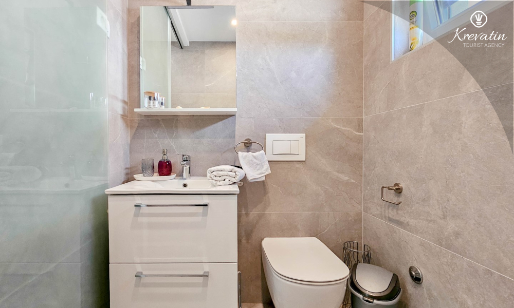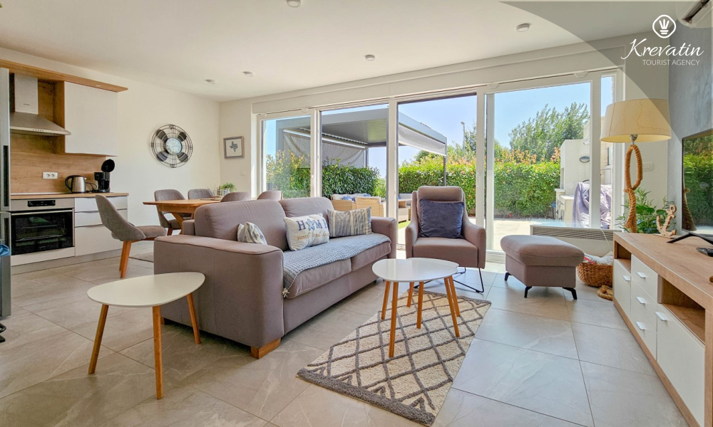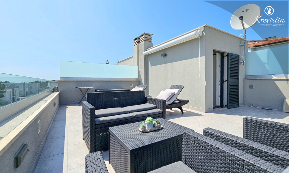 Kuća se proteže na dvije etaže, i raspolaže s dvije prostrane terase. Krovna terasa s garniturom za sjedenje i panoramskim pogledom na marinu i stari grad, a prizemna terasa je opremljena vrtnom garniturom i roštiljem - idealna za druženje na otvorenom.