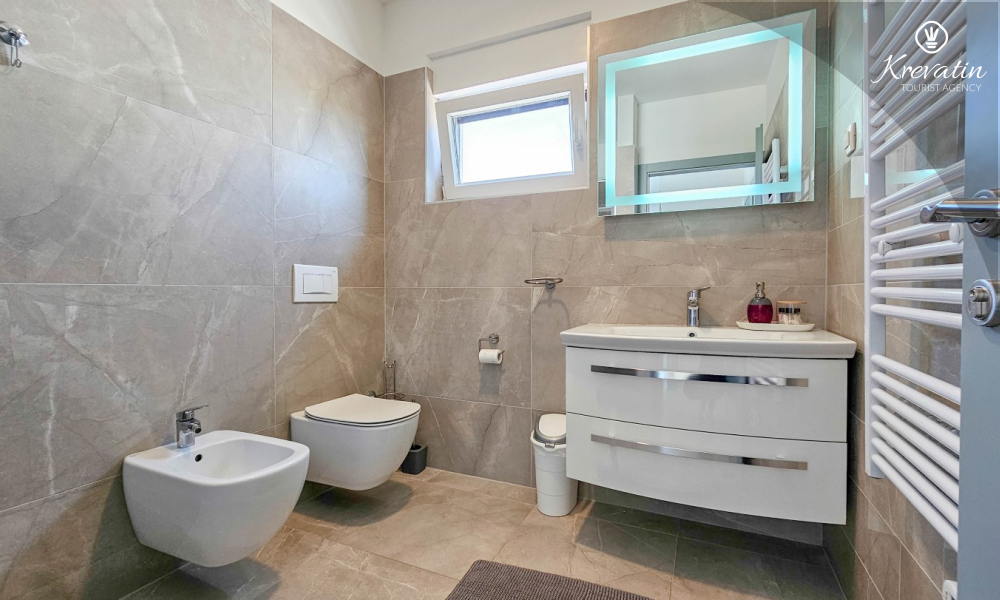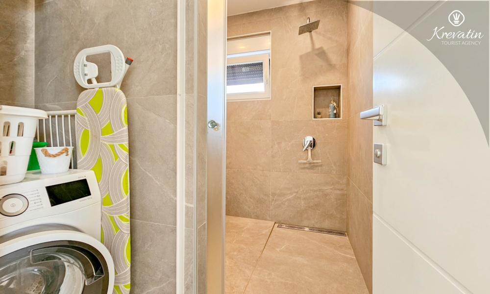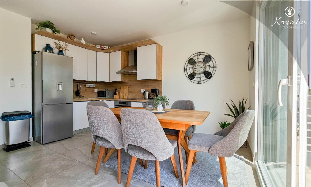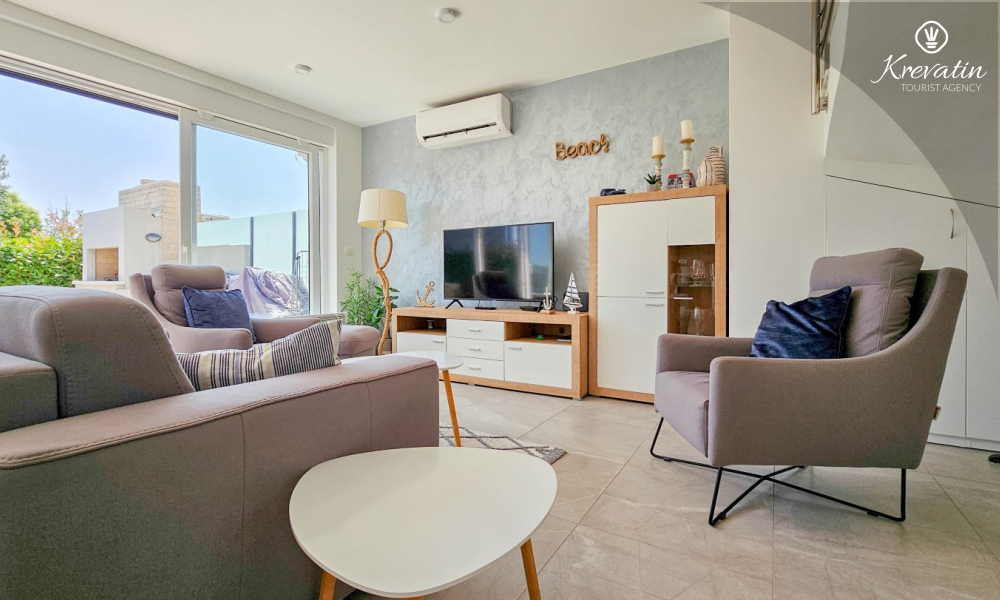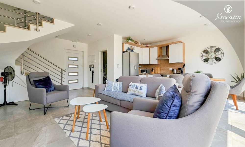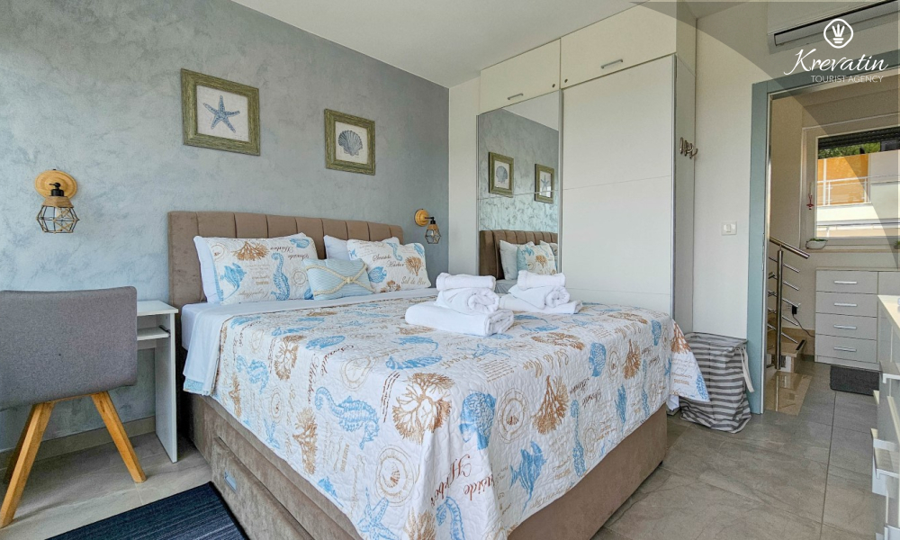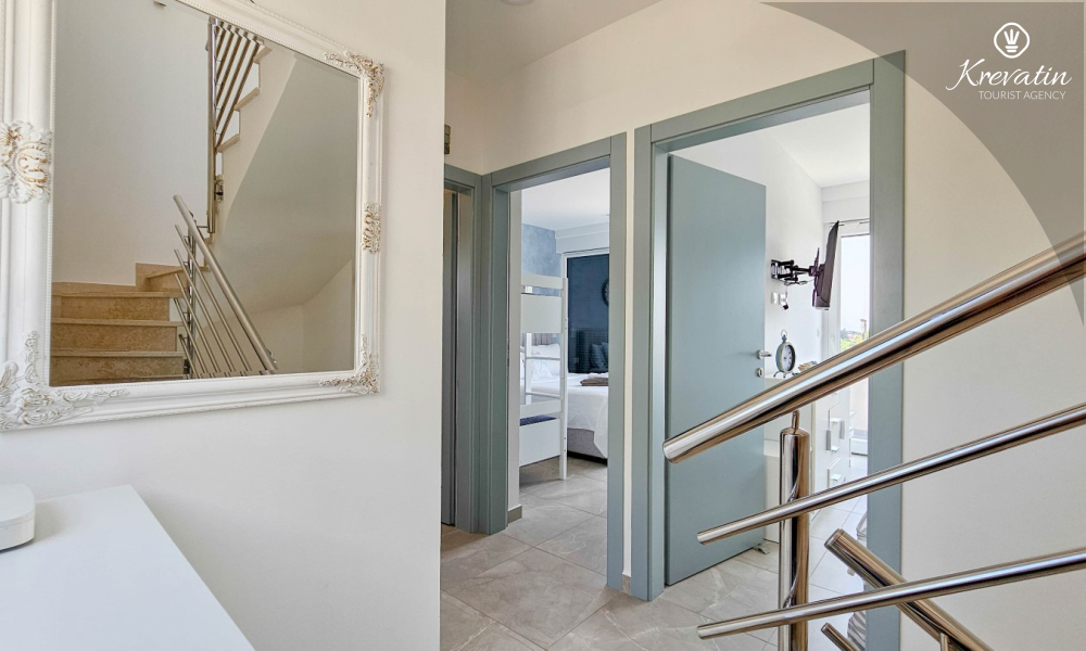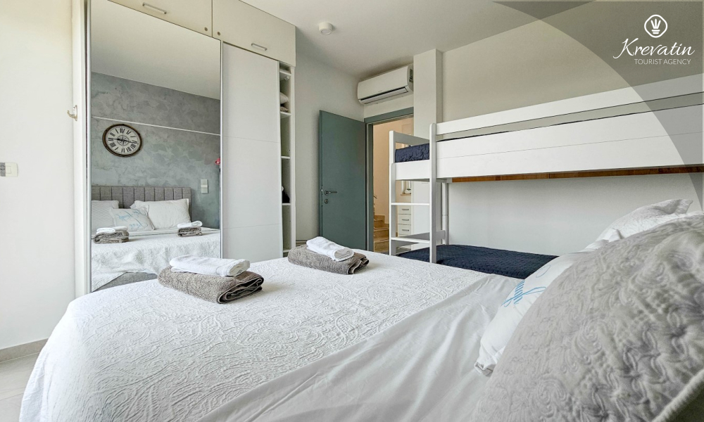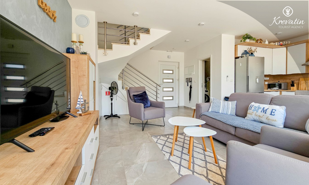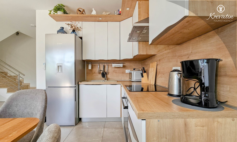 U prizemlju kuće nalazi se moderno opremljena kuhinja s blagovaonicom, prostrani dnevni boravak s kaučem na razvlačenje za 2 dodatne osobe, jedna kupaonica i vešeraj. Na prvom katu nalaze se dvije udobne spavaće sobe s bračnim krevetom te dodatna kupaonica.