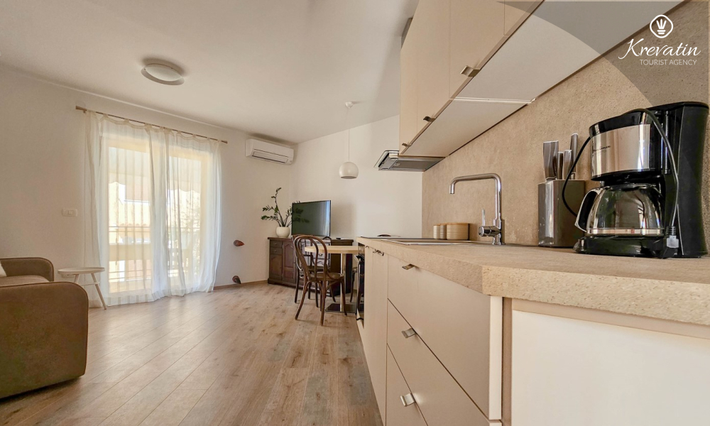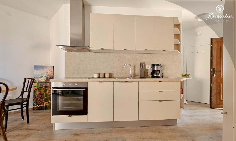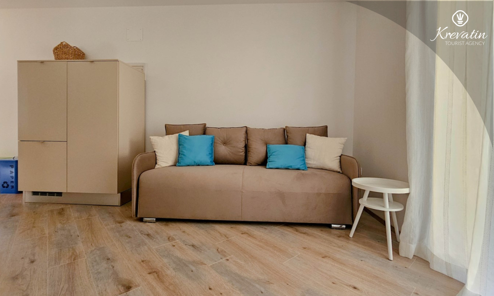 Unutar apartmana nalazi se spavaća soba s bračnim krevetom te dnevni boravak s kuhinjom opremljenom osnovnim stvarima za pripremu obroka. Na raspolaganju je kupaonica opremljena tušem i WC-om te balkon idealan za opuštanje na svježem zraku.