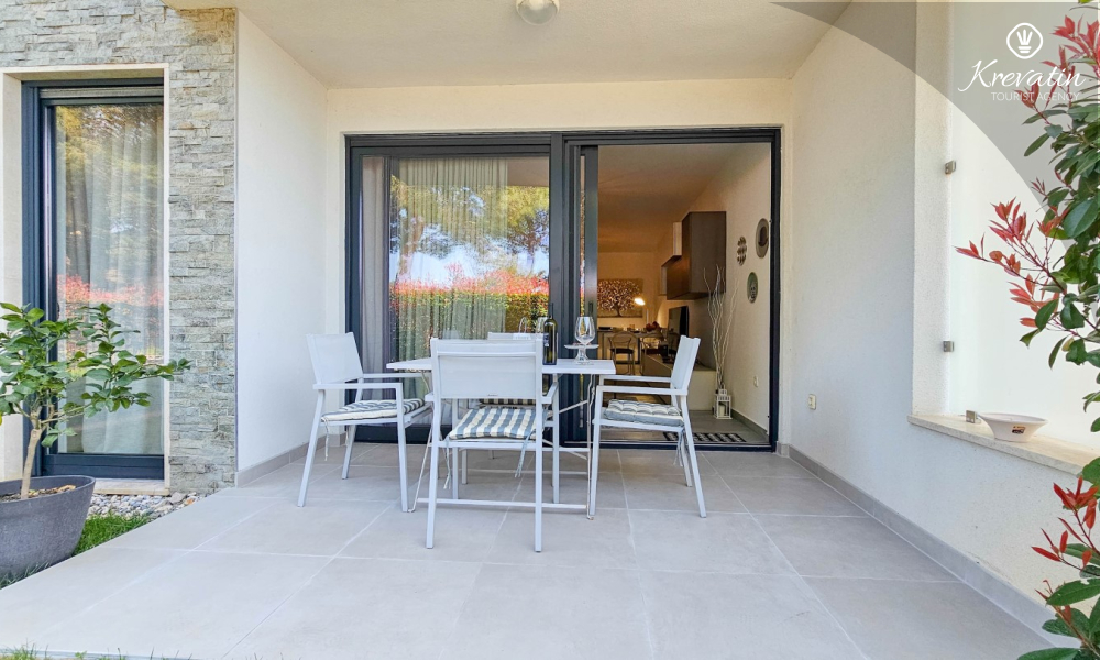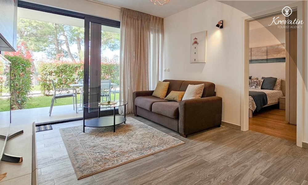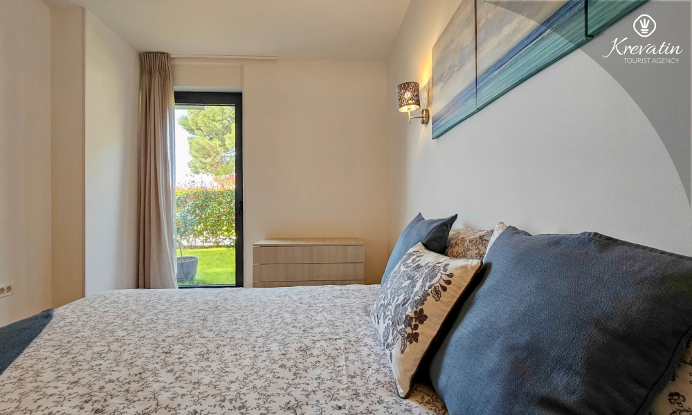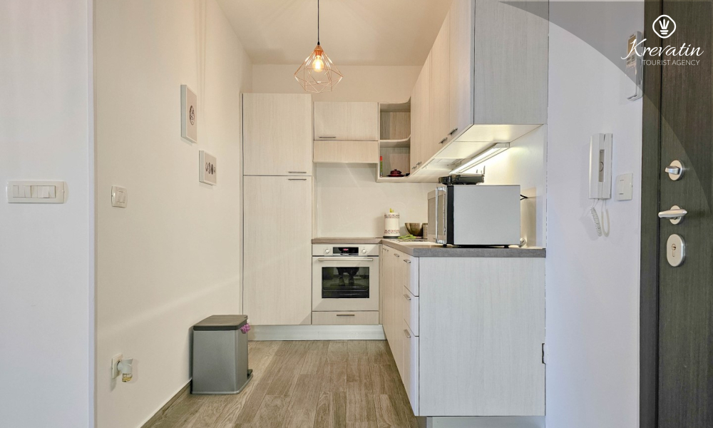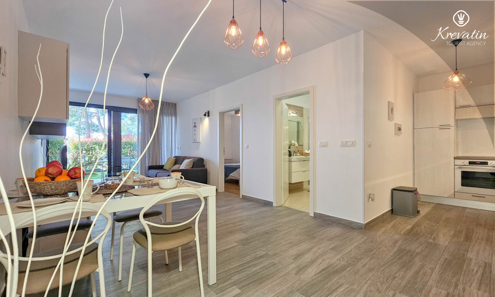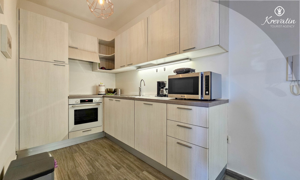 Sastoji se od spavaće sobe s bračnim krevetom, dnevnog boravka s kuhinjom i blagovaonicom te kupaonice tušem i WC-om. Kuhinja je opremljena svim osnovnim stvarima za pripremu obroka, a u dnevnom boravku je kauč za dodatnu osobu. Na raspolagnaju je terasa s malim vrtom - idealni za boravak na otvorenom.