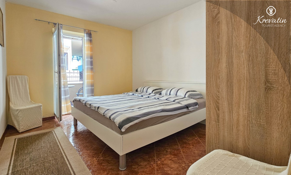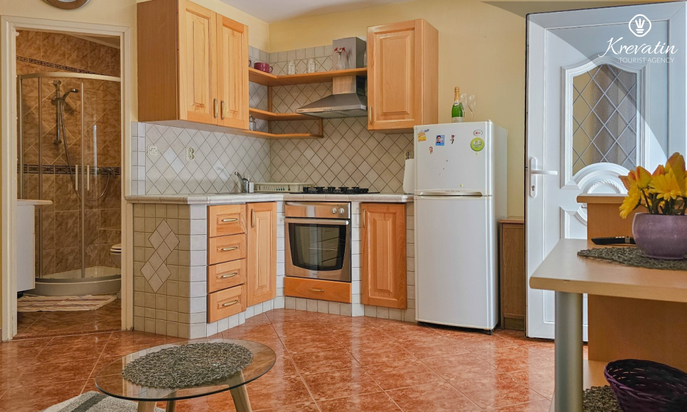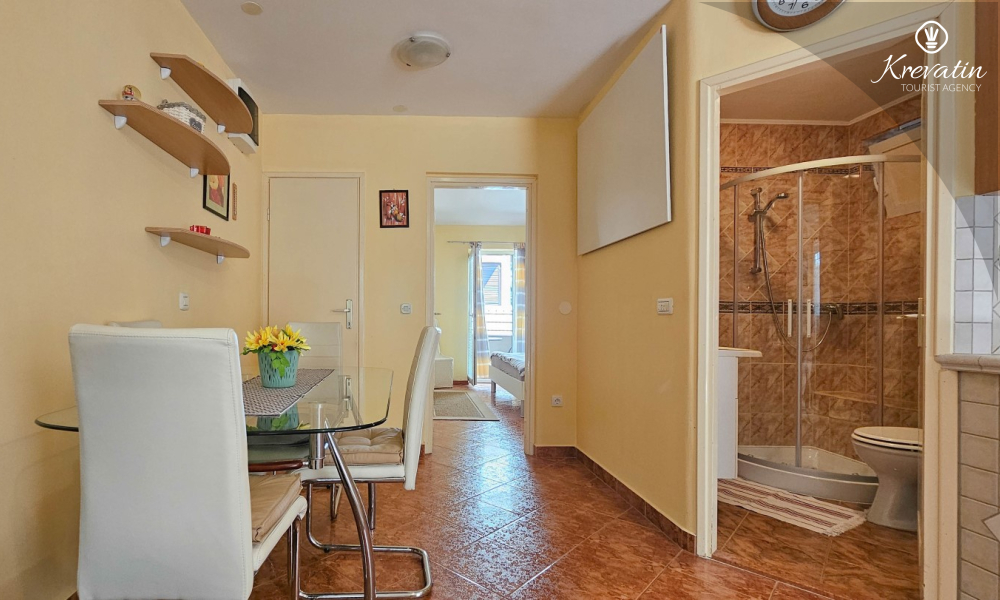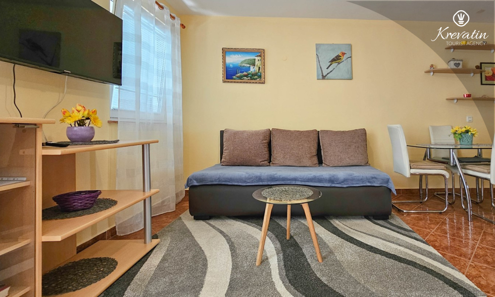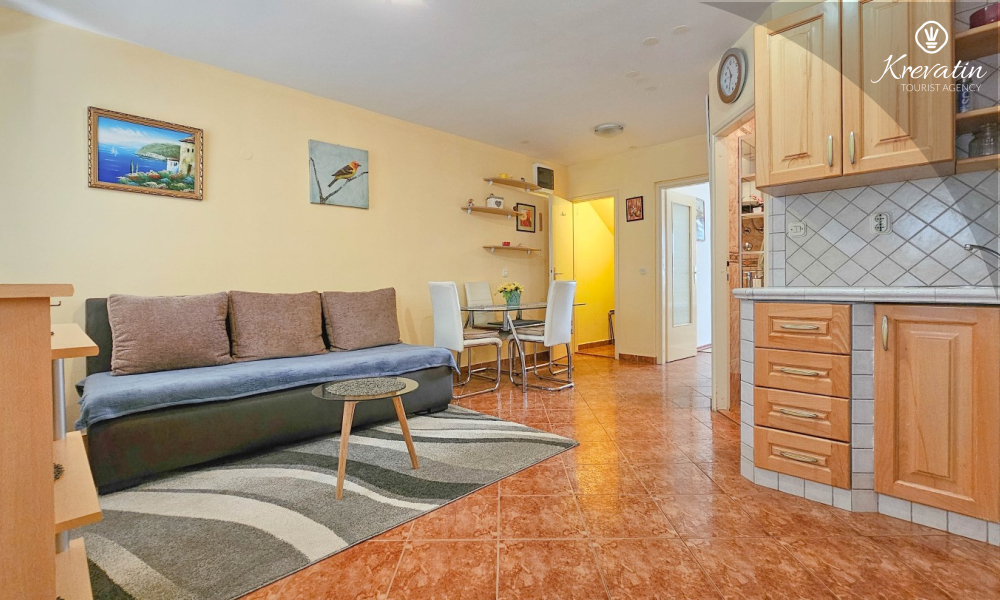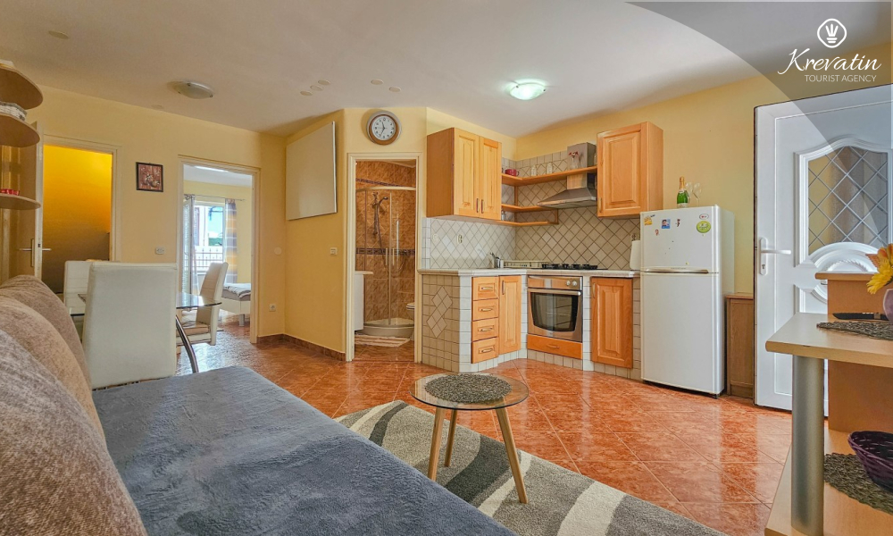 Apartman se sastoji od spavaće sobe, udobnog dnevnog boravka s kuhinjom i blagovaonicom, te lijepe terase. Dva dodatna gosta mogu udobno spavati u dnevnoj sobi. Kuhinja je opremljena osnovnim stvarima za pripremu jednostavnih obroka, a praktična kupaonica uključuje tuš, WC i perilicu rublja za vašu udobnost. Opustite se na terasi opremljenoj stolom i stolicama, savršenoj za jutarnju kavu ili večernja druženja. Apartman je opremljen TV-om, klimom, internetom, a posteljina i ručnici dostupni su bez dodatnih troškova za bezbrižan boravak.