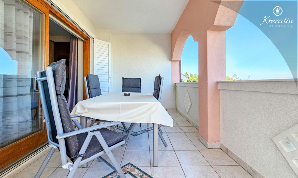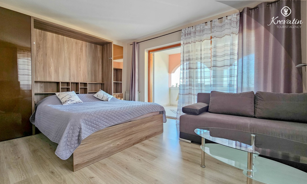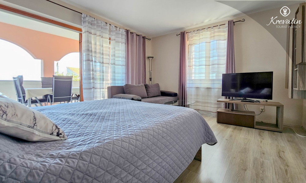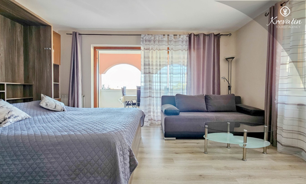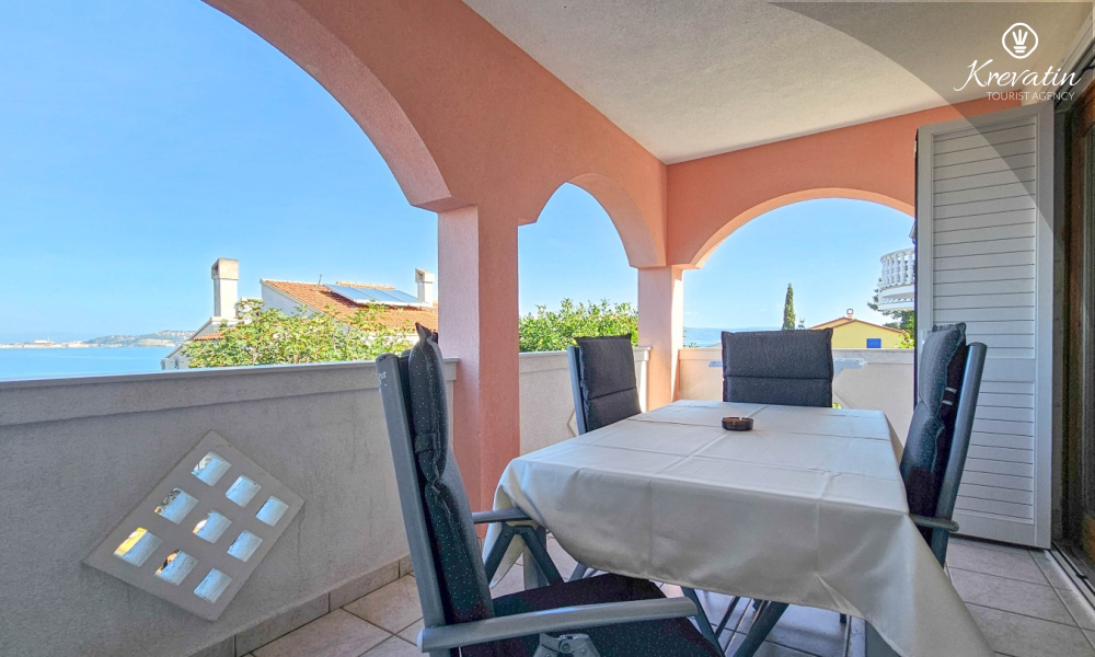 Prostrana spavaća soba s bračnim krevetom, ormarom i prostorom za opuštanje vodi vas na prekrasan balkon s udobnim namještajem i očaravajućim pogledom na more. Kuhinja s blagovaonicom opremljena je osnovnim stvarima za pripremu obroka, a kupaonica s tušem pruža dodatnu udobnost. Apartman je opremljen klimom, besplatnim internetom i satelitskom televizijom, a posteljina i ručnici su uključeni u cijenu.
