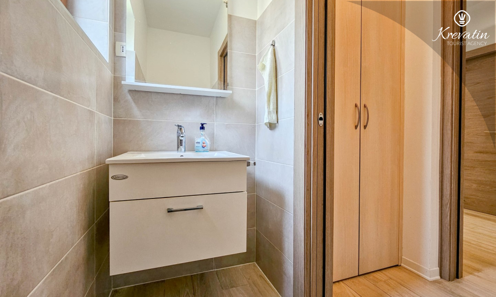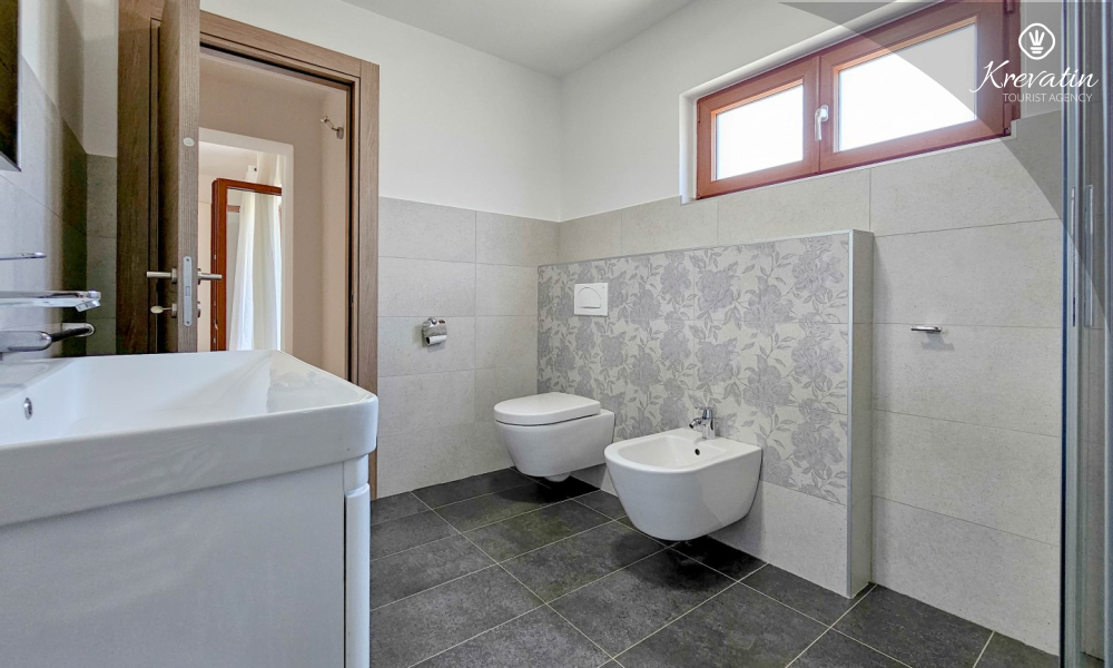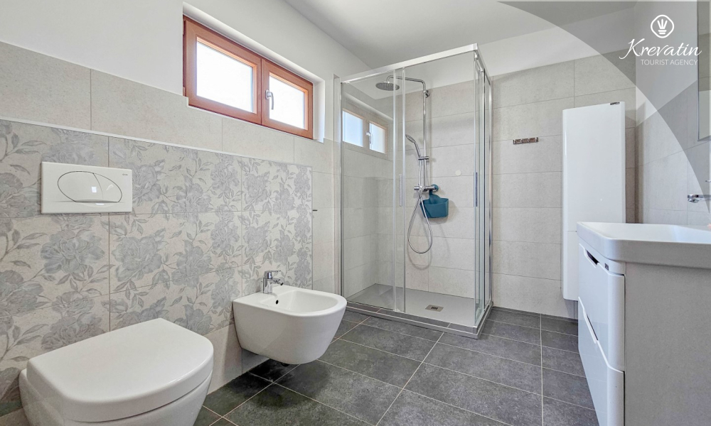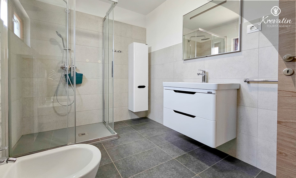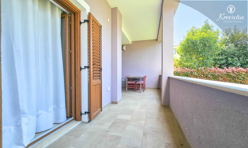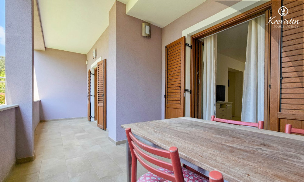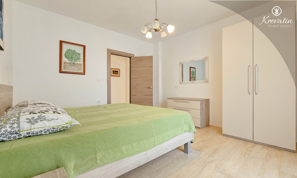 Apartman ima jednu spavaću sobu s bračnim krevetom, vlastitom kupaonicom i izlazom na terasu — savršeno mjesto za uživanje na otvorenom. Tu je i dnevni boravak s blagovaonicom i dobro opremljenom kuhinjom a dodatne dvije osobe mogu ugodno spavati na pomoćnom ležaju. Na raspolaganju je i dodatna kupaonica s WC-om i lavandinom te terasa sa stolom i stolicama. U vrtu se može roštiljati i uživati u zajedničkom prostoru s gostima iz druga dva apartmana, idealno za zajednička druženja.