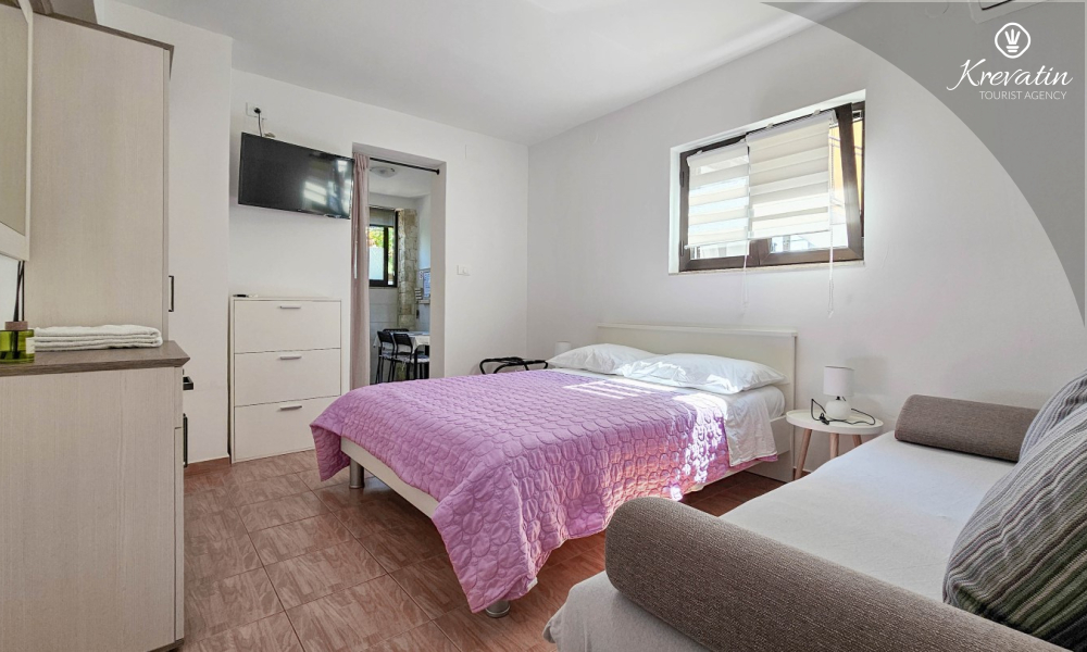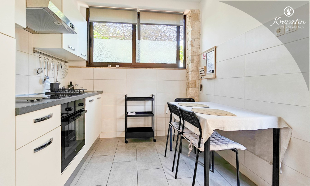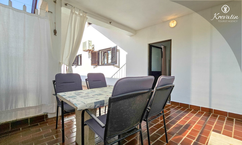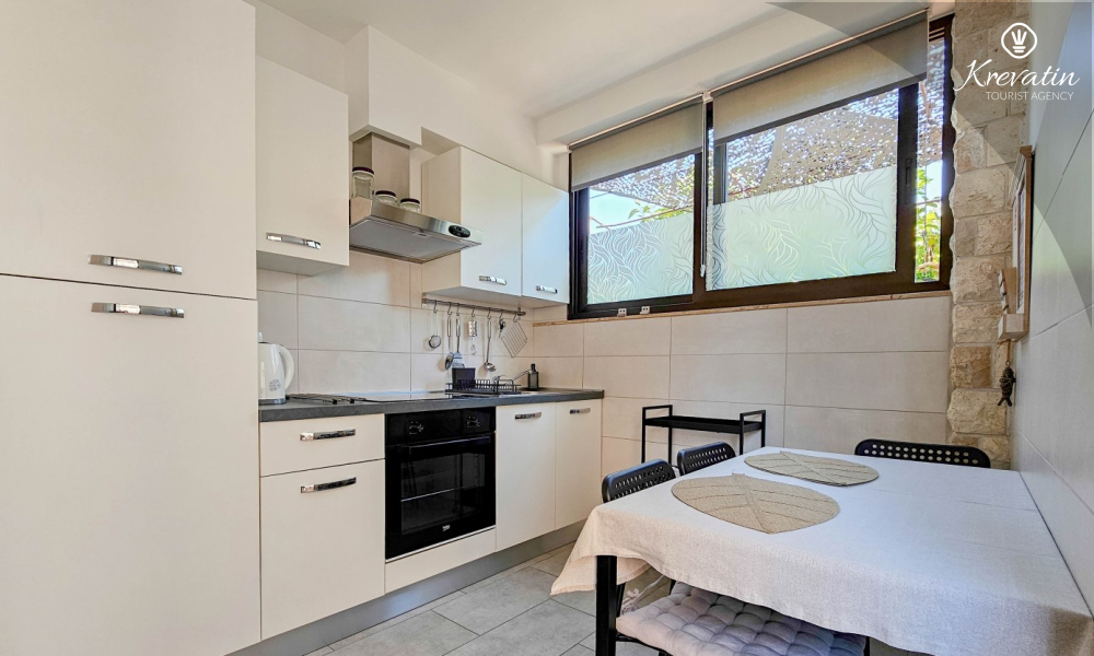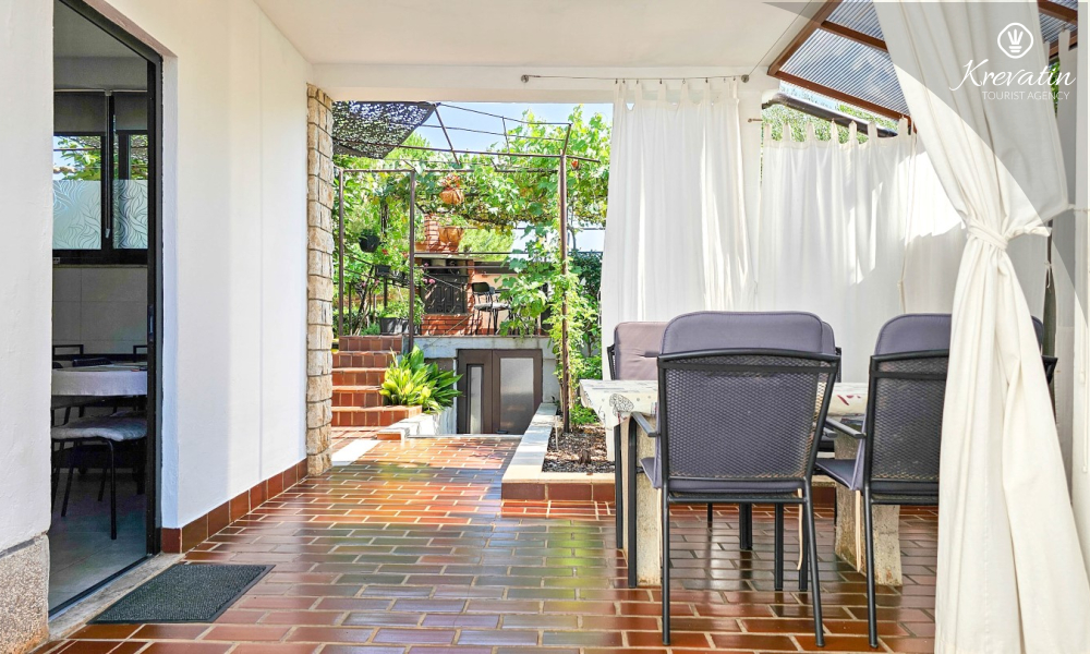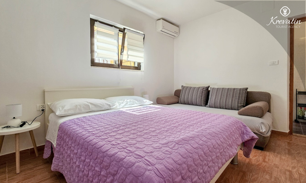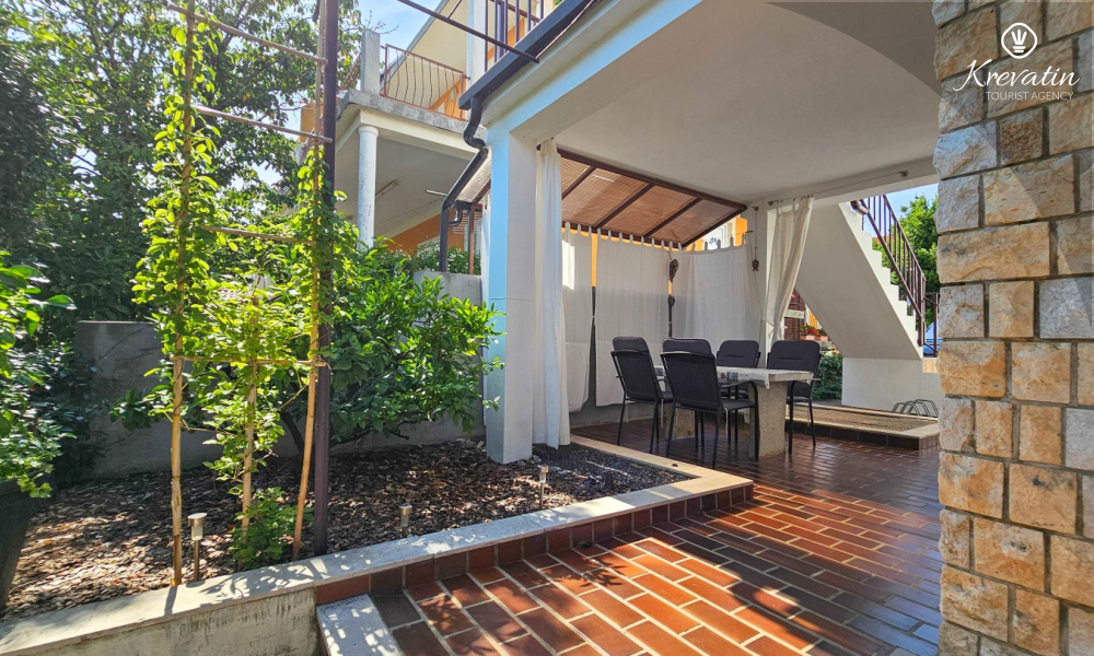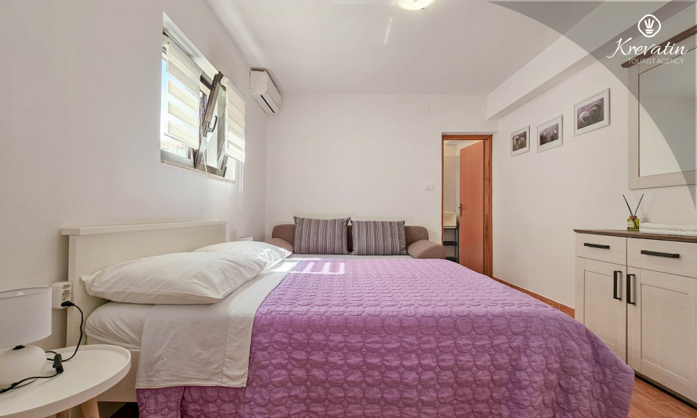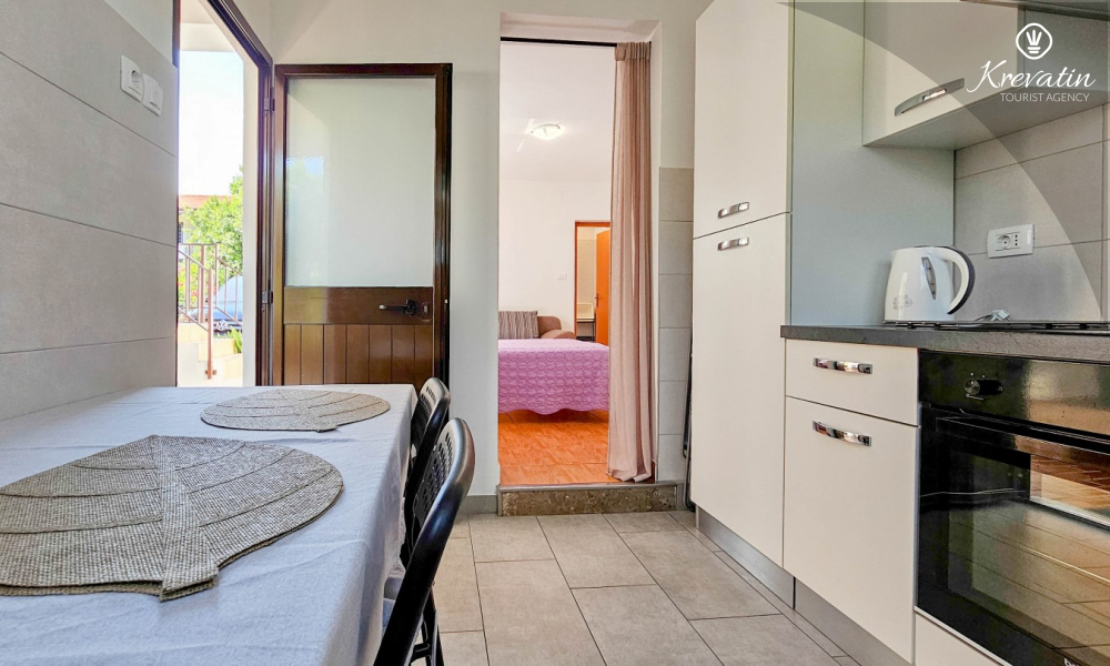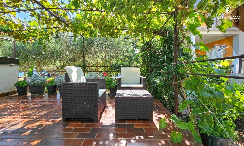 Nalazi se u prizemlju obiteljske kuće i nudi sve što vam treba za bezbrižan odmor: kuhinju s blagovaonskim stolom, spavaću sobu s bračnim krevetom te kupaonicu s tuš kabinom. Ono što ovaj apartman čini posebnim su dvije privatne terase – idealne za uživanje u jutarnjoj kavi, večernjem vinu ili jednostavno – za predah u hladu uz šum mora.