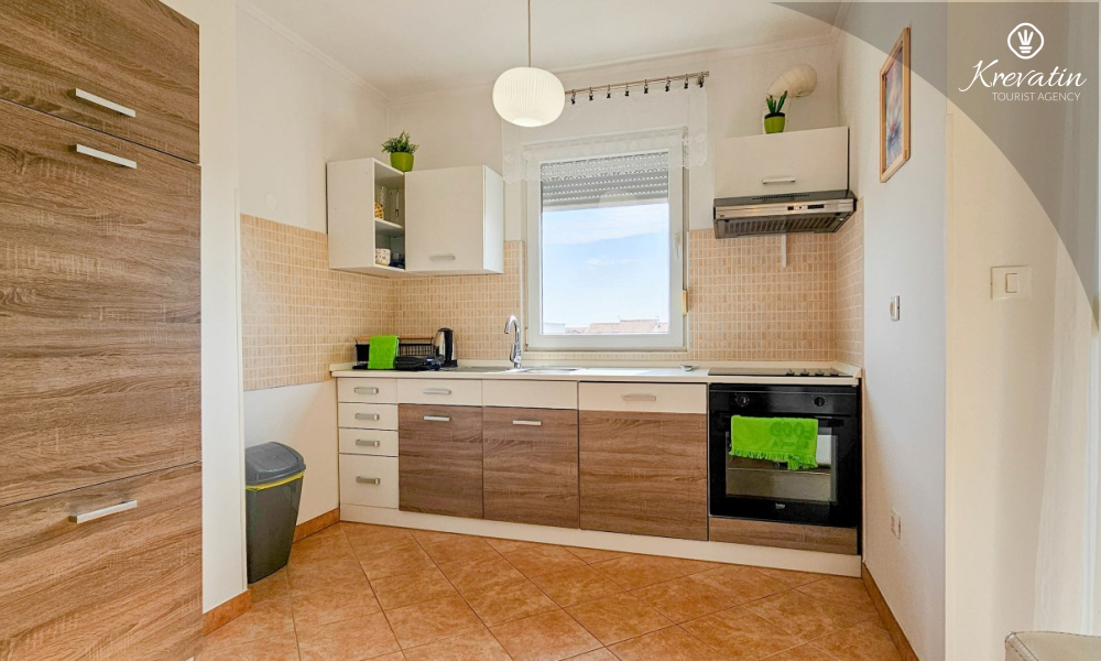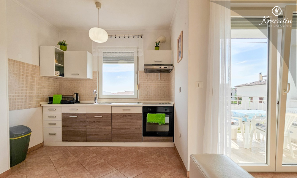 Apartman se sastoji od praktično uređenog dnevnog boravka s kuhinjom, spavaće sobe s bračnim krevetom te kupaonice s tuš kabinom. Iz dnevnog boravka izlazi se na balkon - idealno mjesto za jutarnju kavu ili večernju čašu vina.