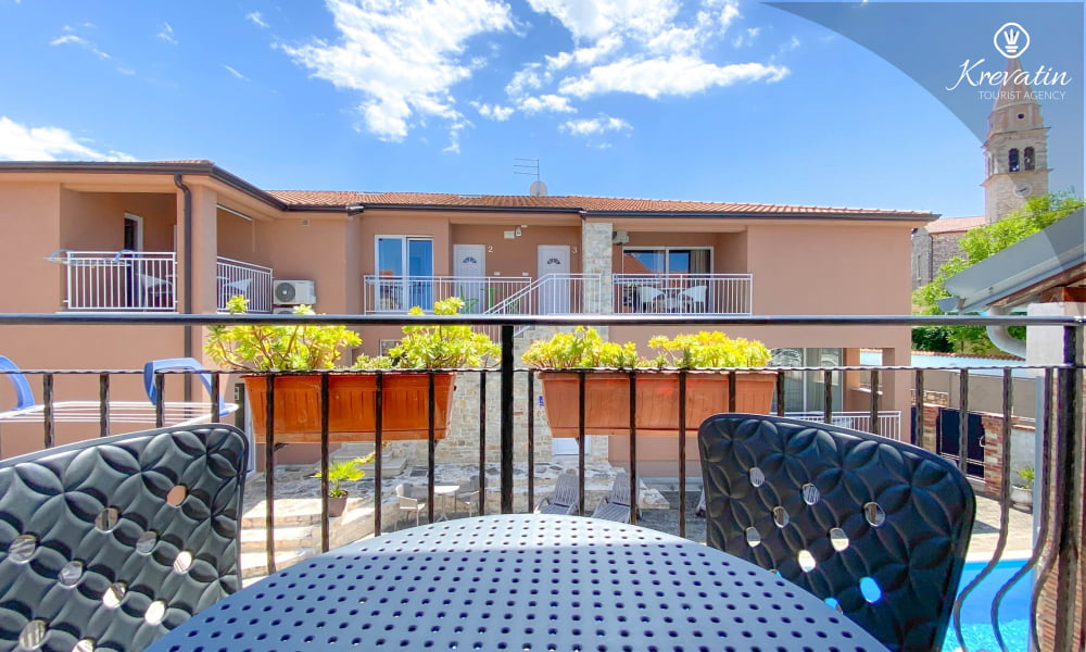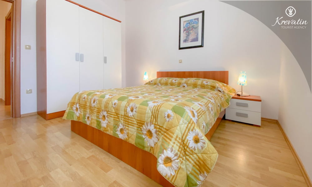 Ovaj apartman za 2 do 4 osobe smješten je na prvom katu i sastoji se od jedne spavaće sobe, dnevnog boravka s kaučem za spavanje za 2 osobe te kuhinje s blagovaonom. Kuhinja je opremljena sa električnim štednjakom, mikrovalnom, hladnjakom i aparatom za kavu. Nadalje tu je jedna kupaonica s tuš kabinom i WC-om te terasa sa stolom i stolicama. Na raspolaganju je i bazen na zajedničko korišenje. SAT-TV, klima, WLAN, posteljina i ručnici su uključeni u cijenu. Kućni ljubimci nisu dozvoljeni.