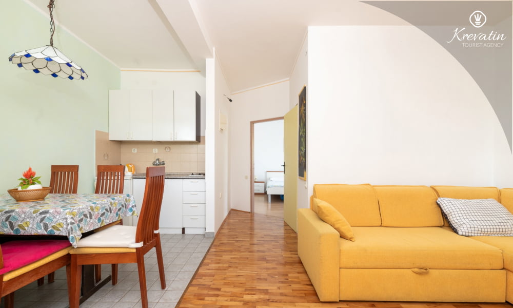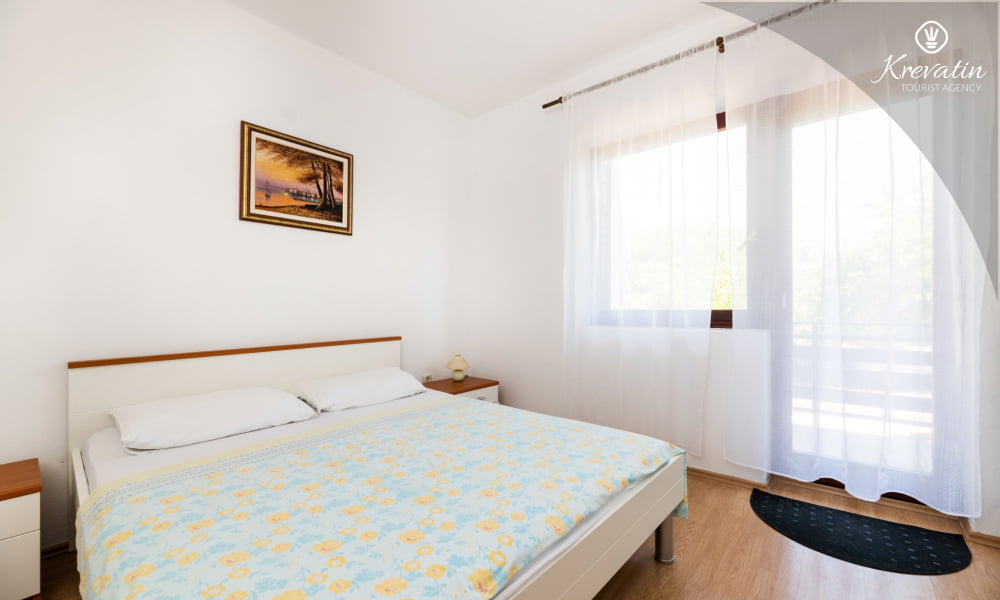 Ovaj apartman za 4 osobe, smješten je u prizemlju obiteljske kuće i sastoji se od jedne spavaće sobe s bračnim krevetom, dnevnog boravka s kaučem (za dvije osobe), te kuhinje s blagovaonicom. Kuhinja je opremljena sa električnim štednjakom, hladnjakom i aparatom za kavu. Nadalje tu je kupaonica s tušem i WC-om te balkon sa stolom i stolicama. SAT-TV, klima, WLAN, posteljina i ručnici su uključeni u cijenu. Kućni ljubimci su dozvoljeni uz nadoplatu.