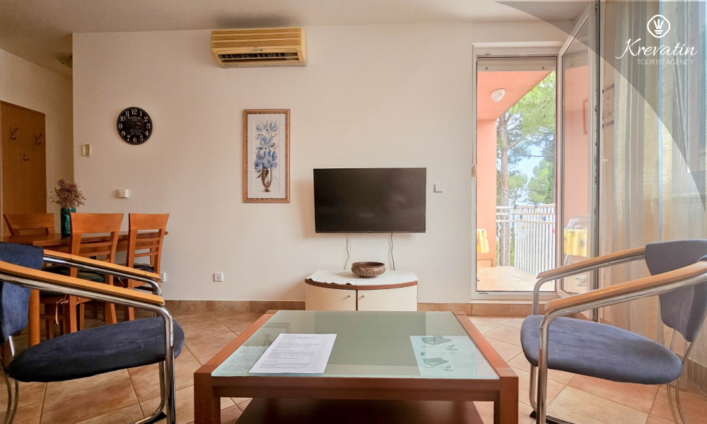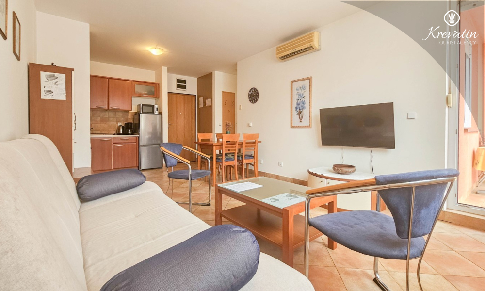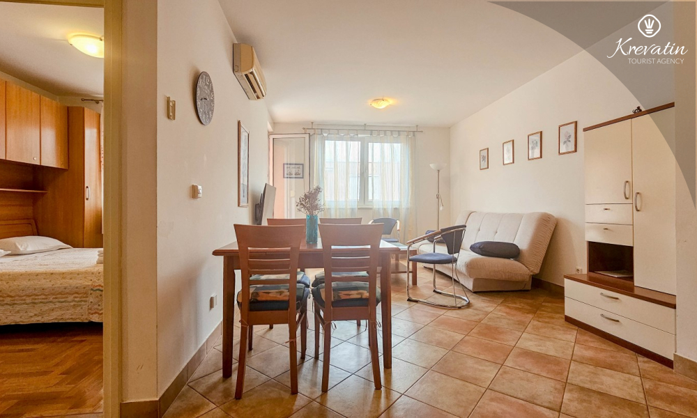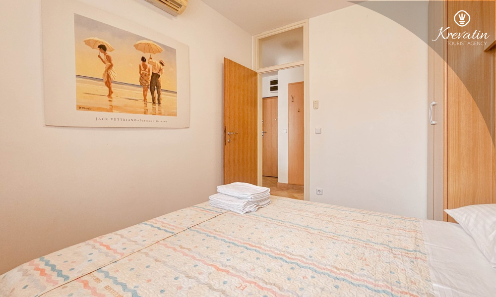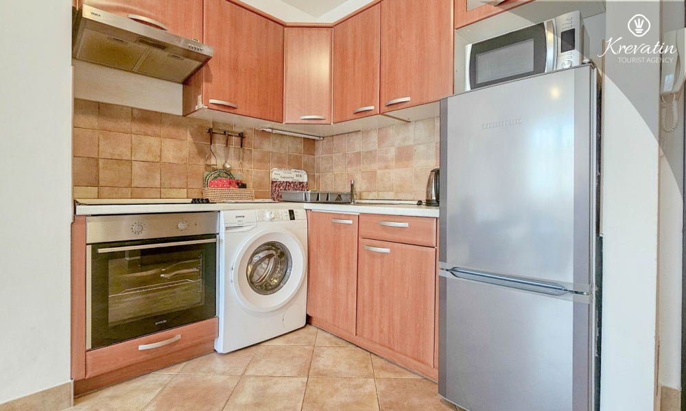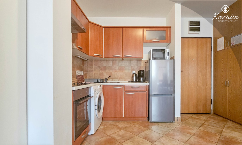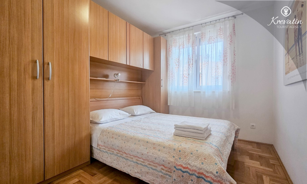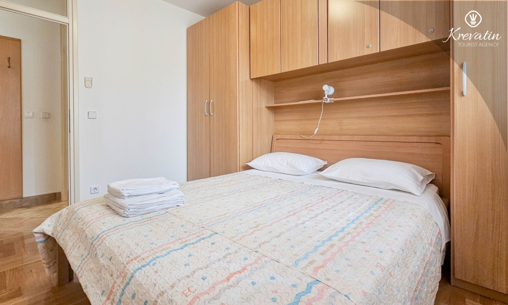 Sastoji se od spavaće sobe, dnevnog boravka s kaučem na razvlačenje, kuhinje opremljene osnovnim stvarima te praktične kupaonice tušem i WC-om. Na raspolaganju je i balkon s pogledom na more idealan za jutarnju kavu ili uživanje u ljetnim večerima