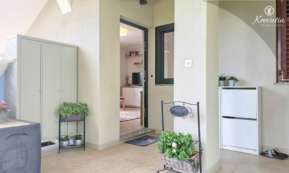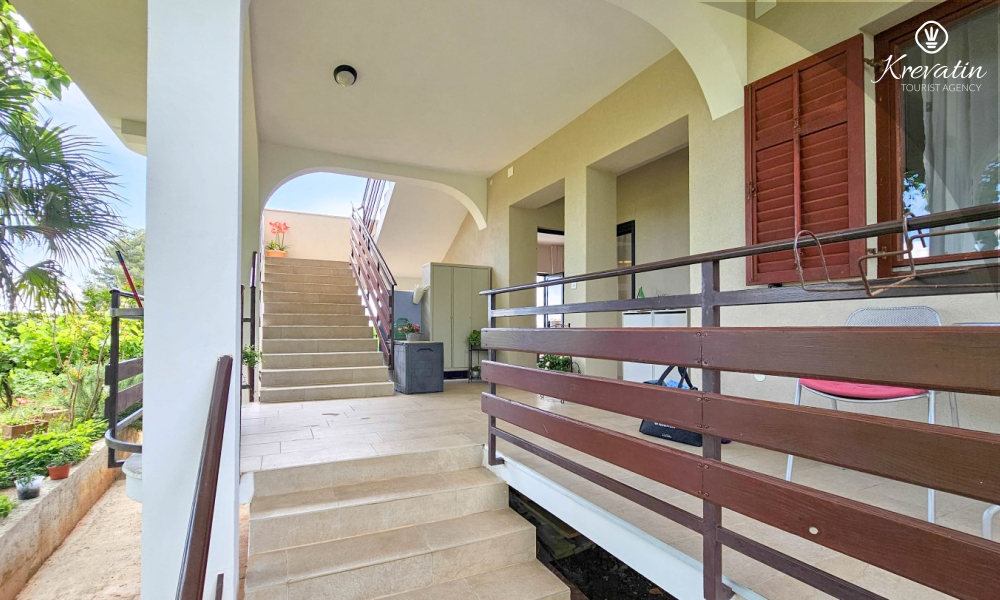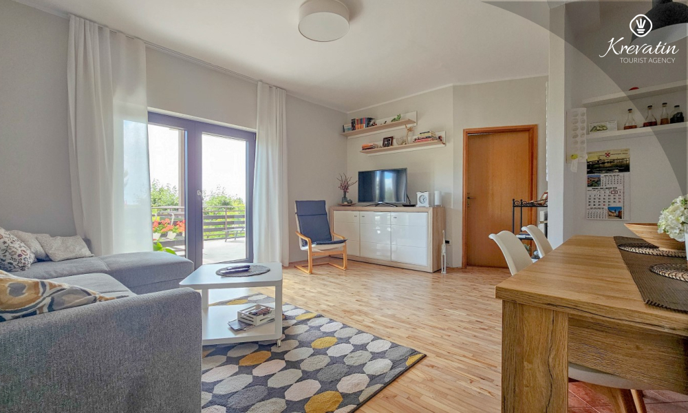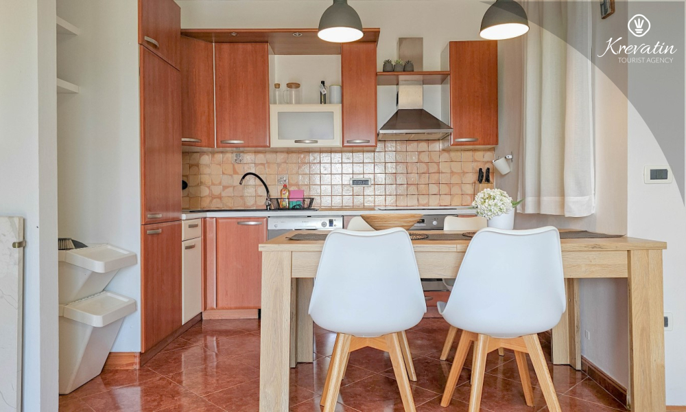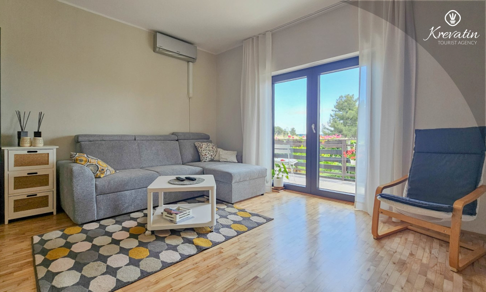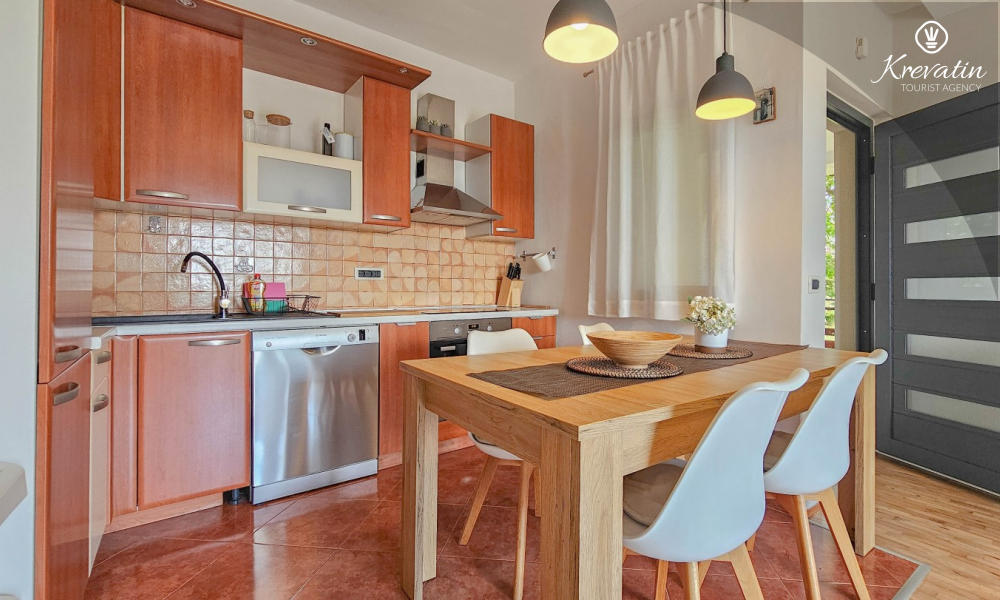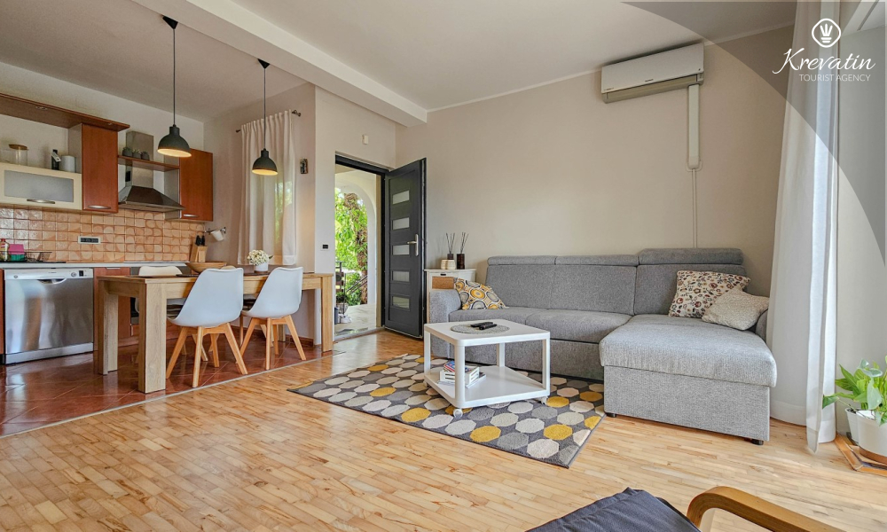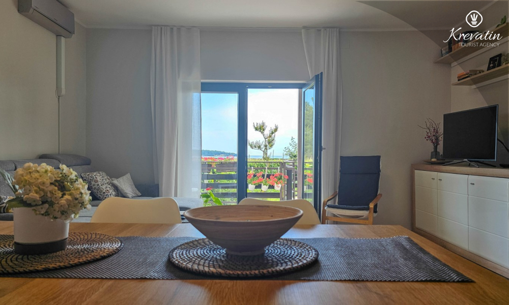 Apartman se nalazi u prizemlju obiteljske kuće i sastoji se od spavaće sobe s bračnim krevetom, dnevnog boravka s kaučem na razvlačenje te kuhinje s blagovaonicom, opremljene osnovnim stvarima. Kupaonica ima kadu i WC, a prostrana terasa s pogledom na more poziva na opuštanje uz jutarnju kavu ili večernje čašice vina.