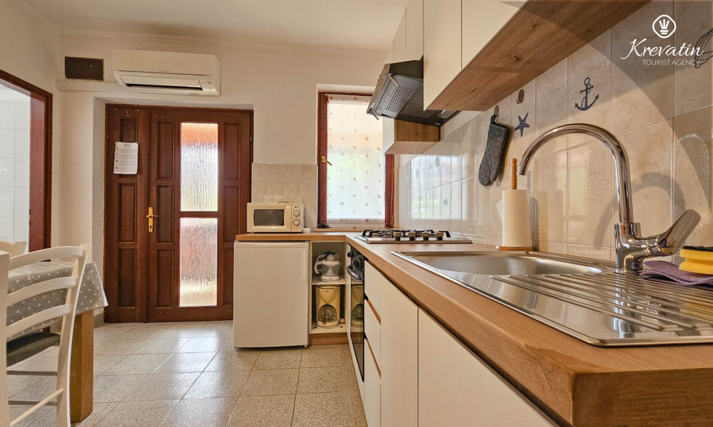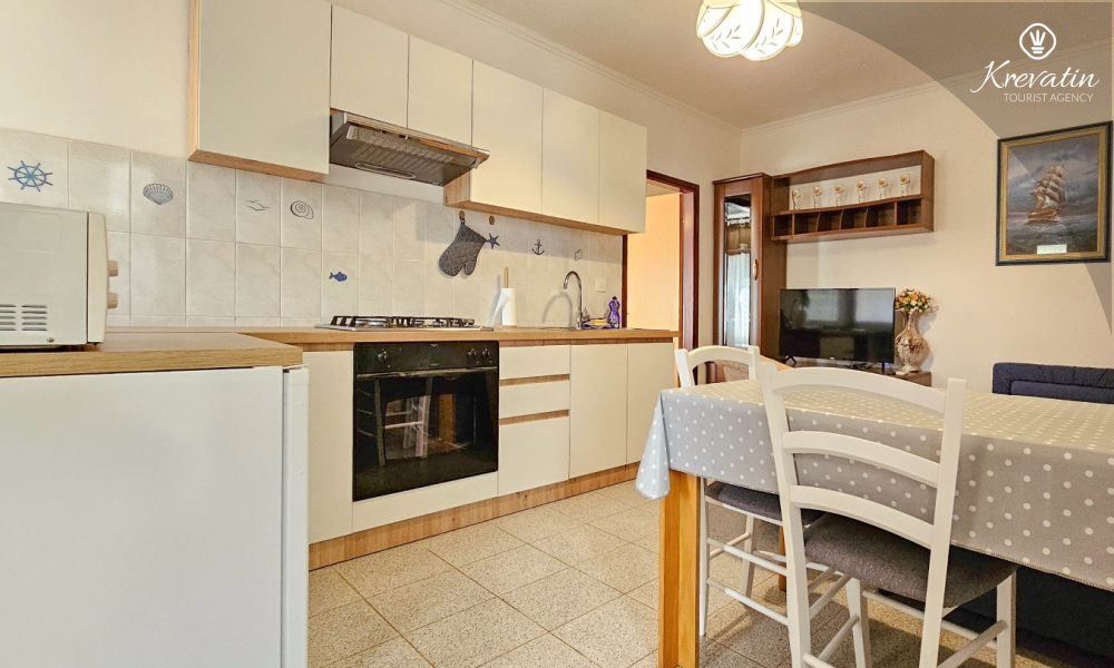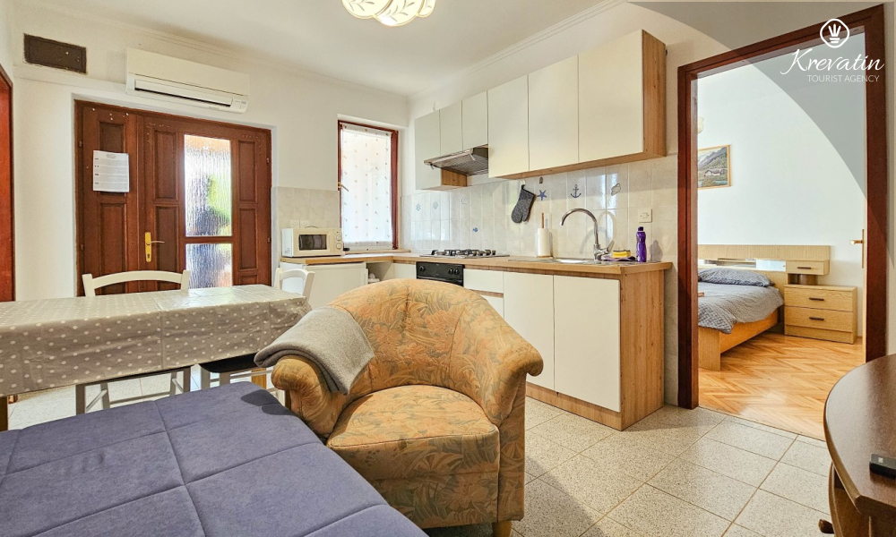 Apartman se sastoji od spavaće sobe s bračnim krevetom, funkcionalne kuhinje opremljene osnovnim stvarima, kupaonice s tušem i WC-om te terase sa stolom i stolicama – savršenim mjestom za jutarnju kavu ili večernje druženje.