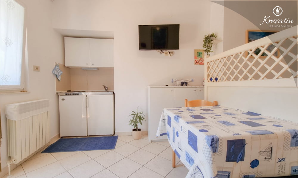 U apartmanu se nalazi spavaća soba s bračnim krevetom, kuhinja opremljena osnovnim stvarima, praktična kupaonica s tuš kabinom i WC-om, te šarmantna terasa opremljena stolom i stolicama, idealna za opuštajuće trenutke uz jutarnju kavu ili večernje druženje.