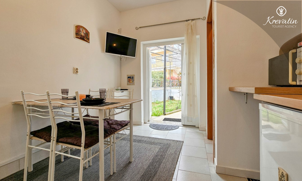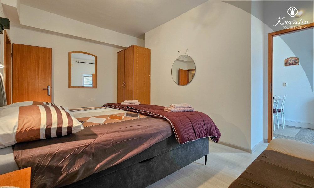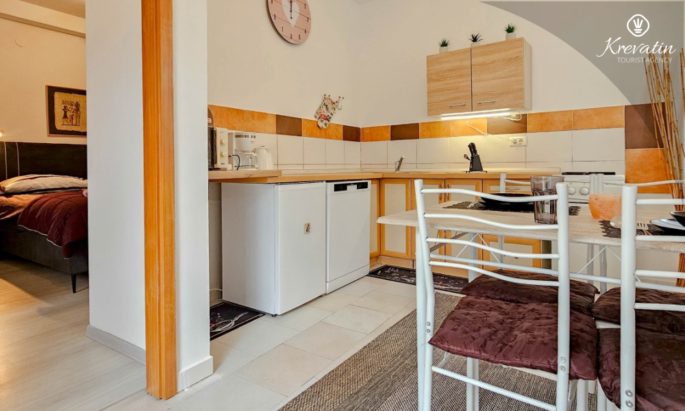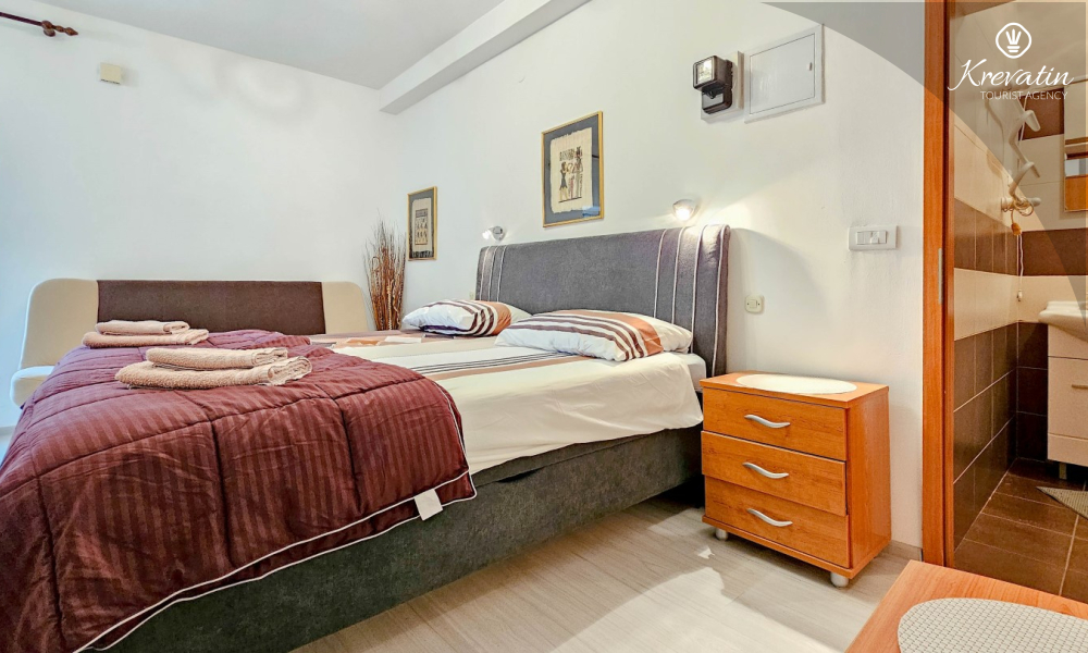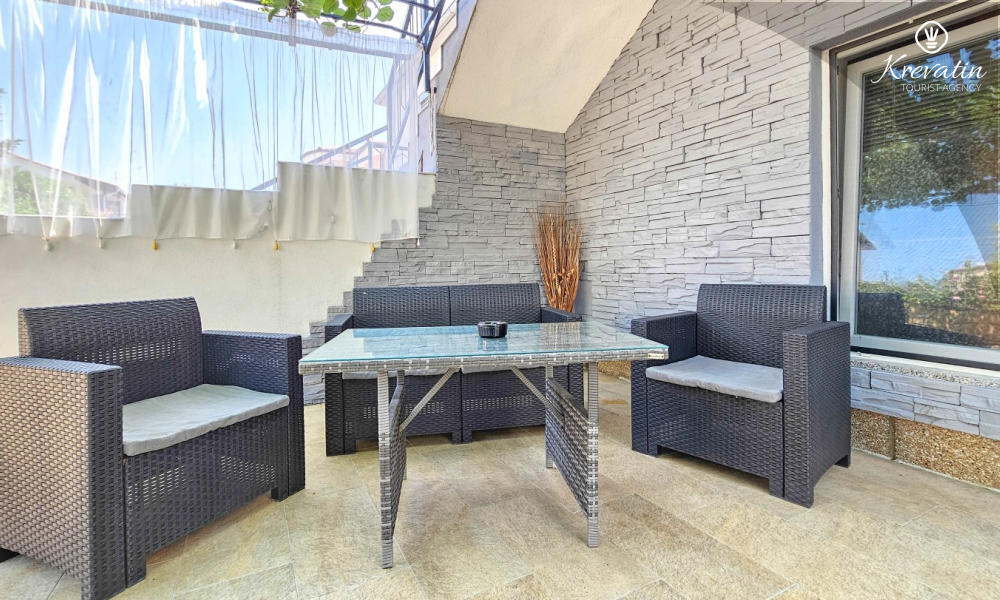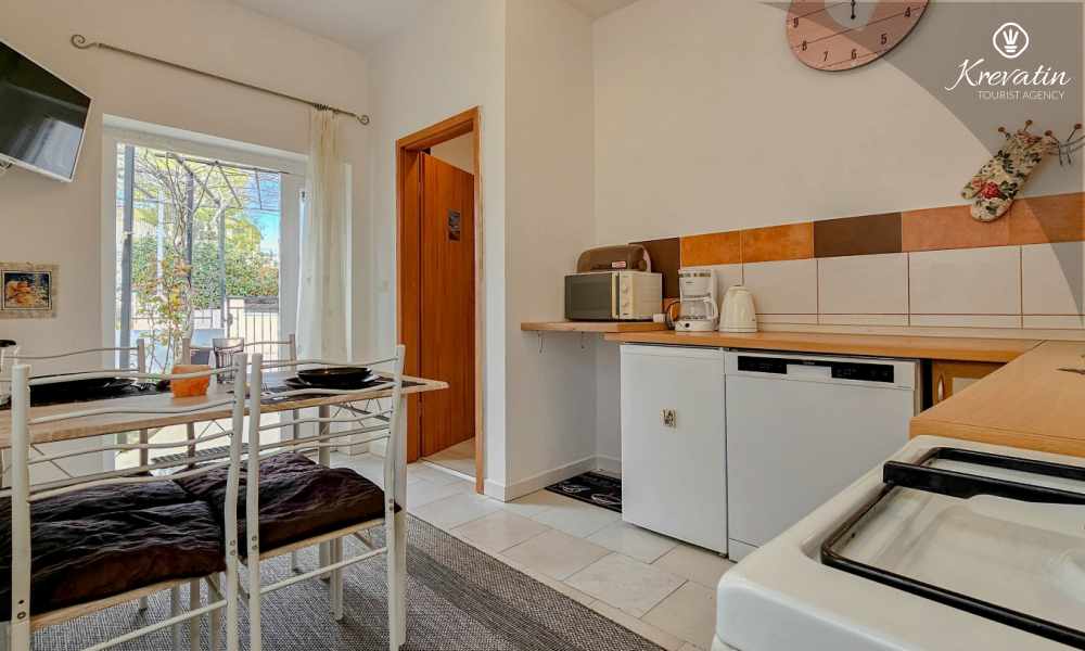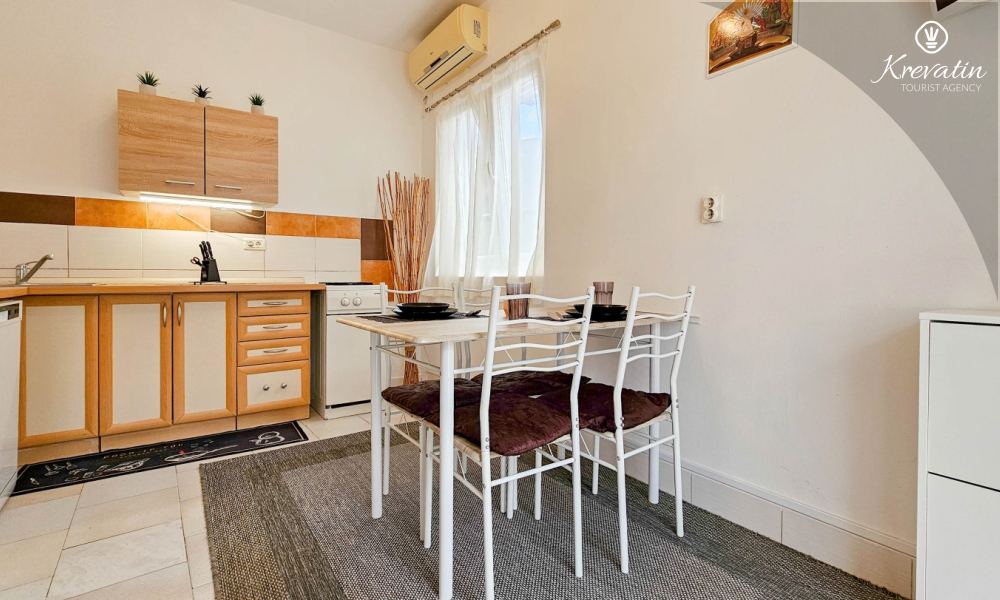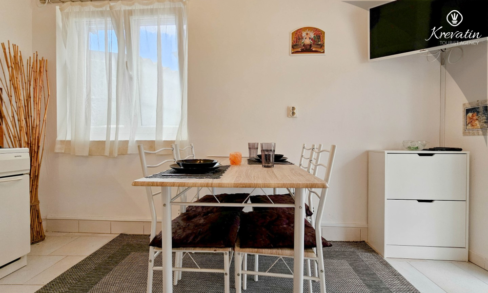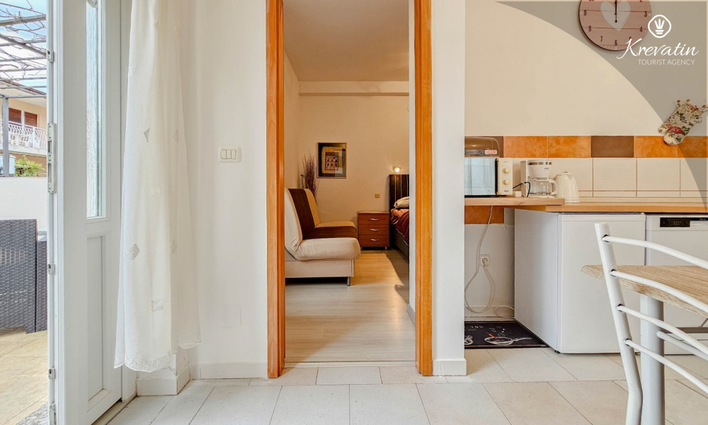 Apartman se sastoji od udobne spavaće sobe, kuhinje s blagovaonicom, opremljene osnovnim stvarima, praktične kupaonice s tušem i WC-om, te terase s vanjskim namještajem – idealne za opuštanje nakon dana provedenog na plaži.