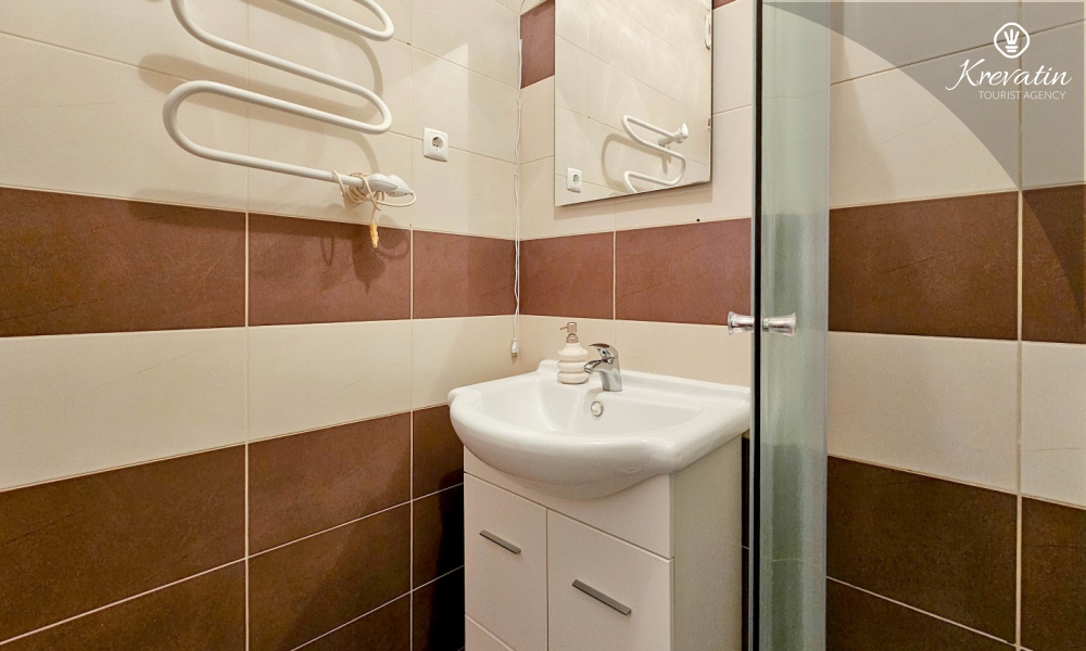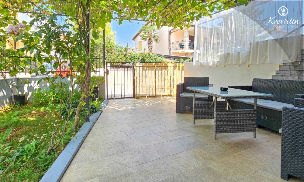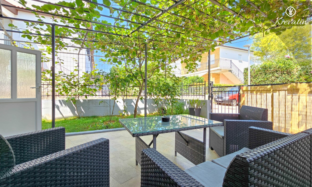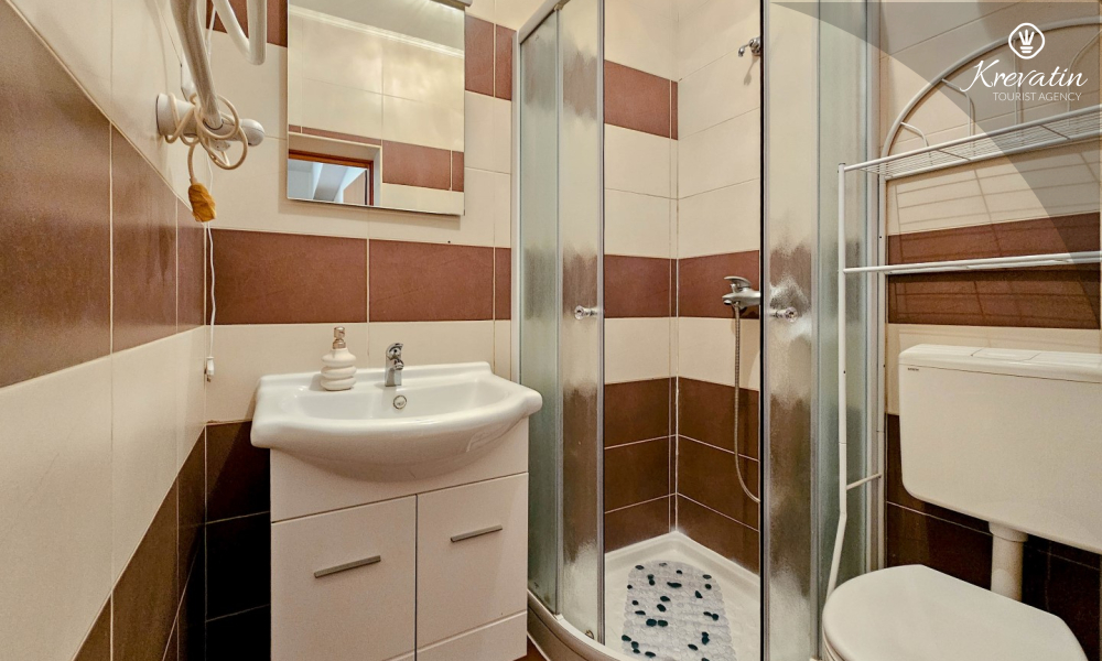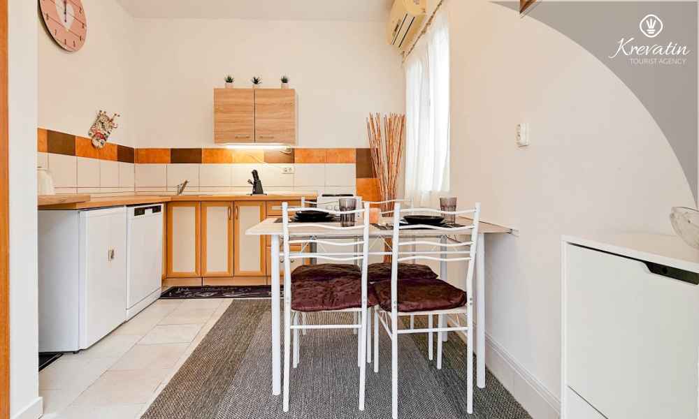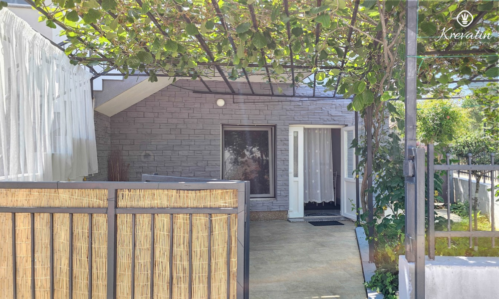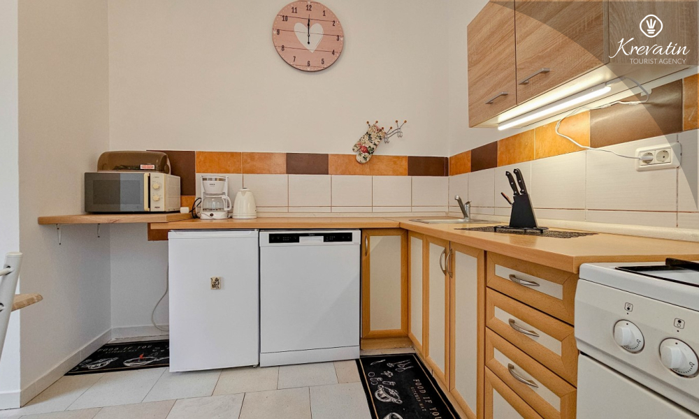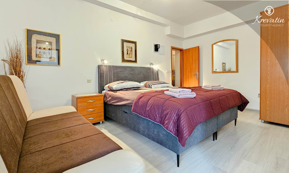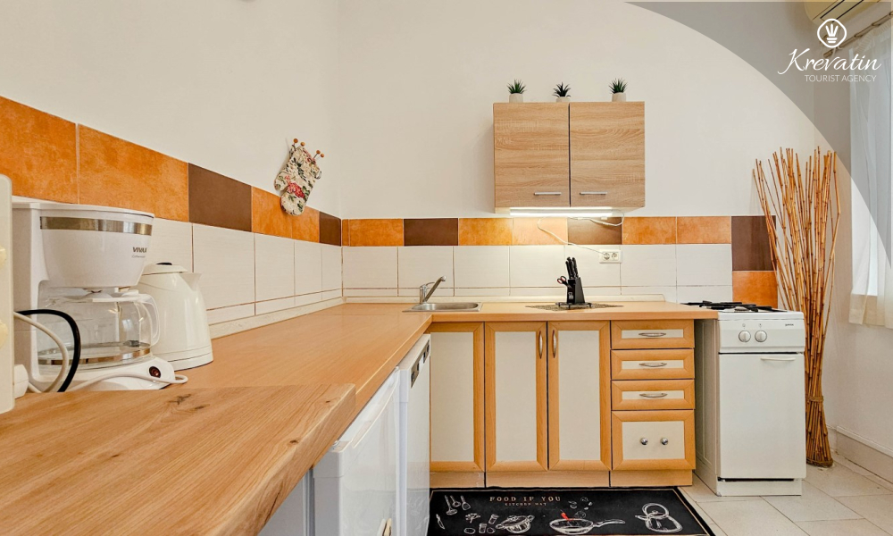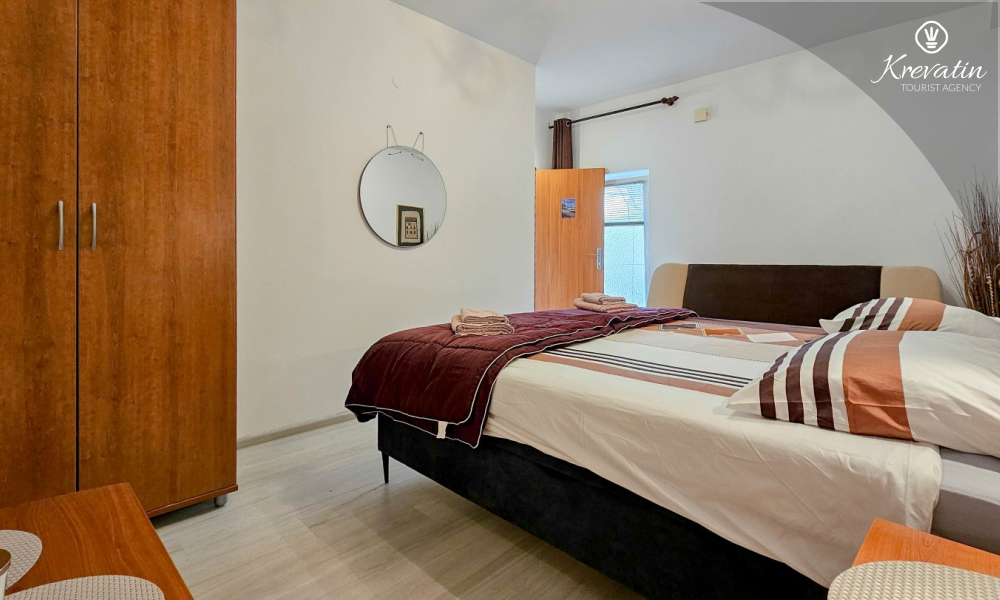 Apartman se sastoji od udobne spavaće sobe, kuhinje s blagovaonicom, opremljene osnovnim stvarima, praktične kupaonice s tušem i WC-om, te terase s vanjskim namještajem – idealne za opuštanje nakon dana provedenog na plaži.