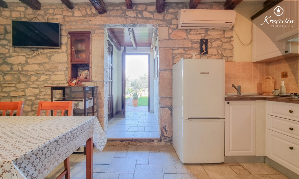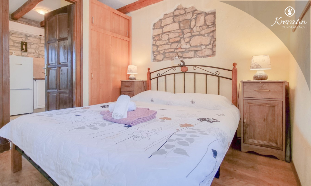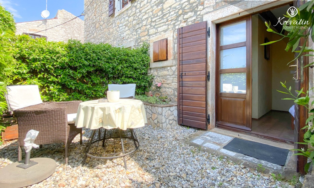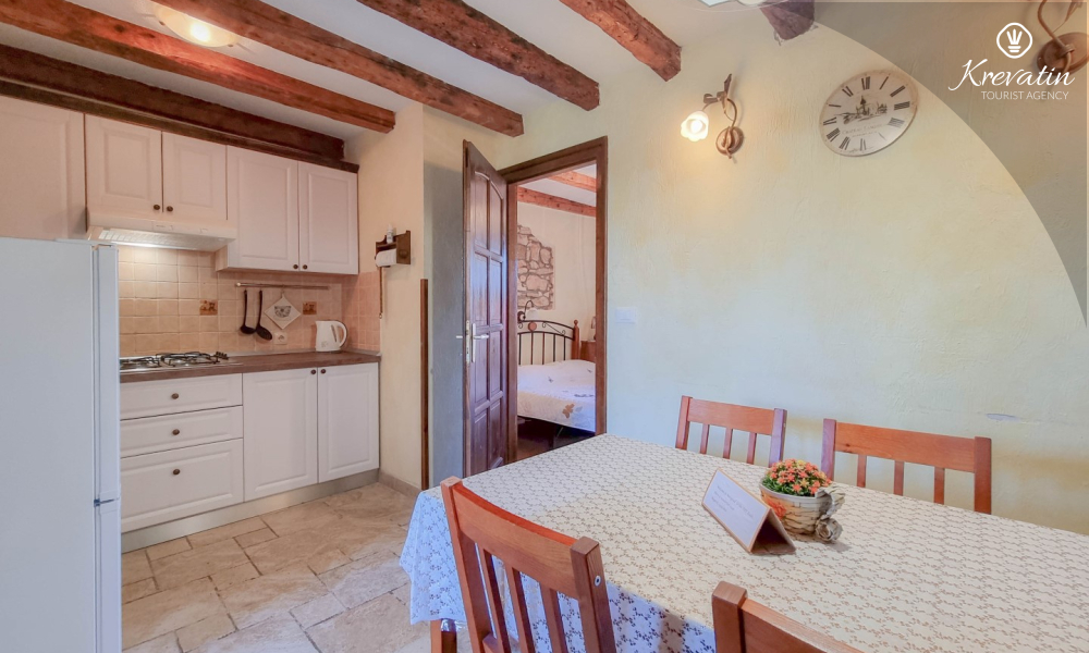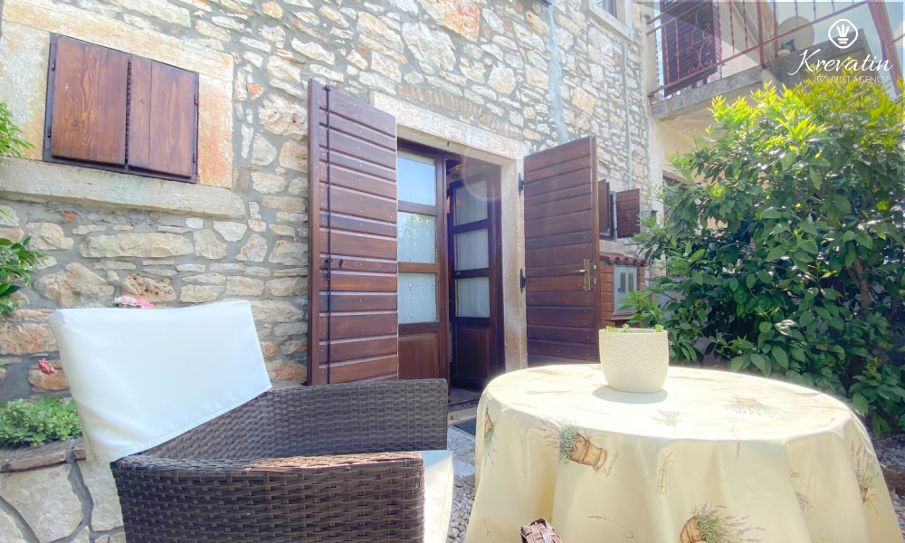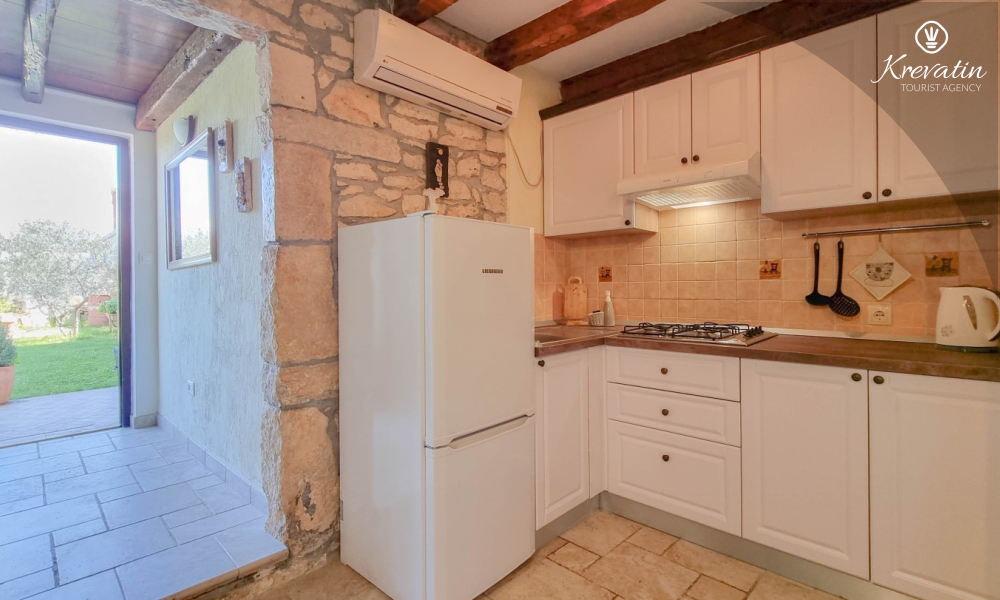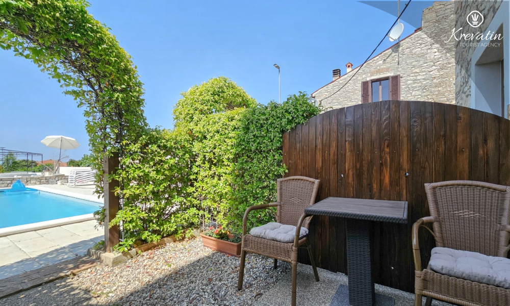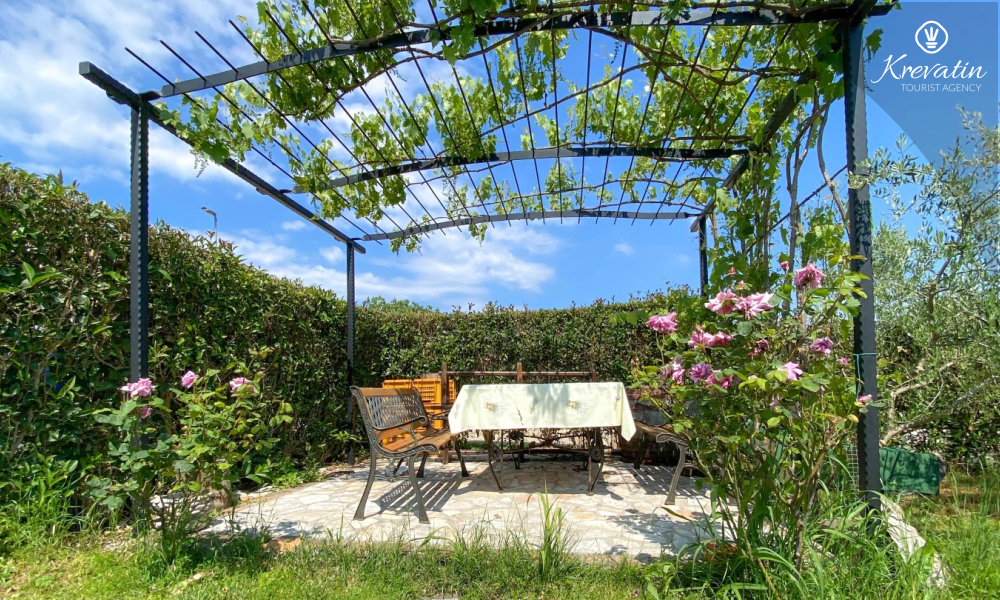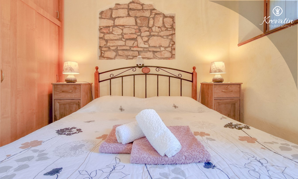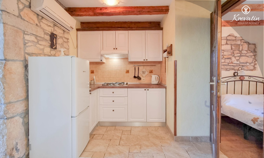 Apartman nudi udobnu spavaću sobu, kuhinju s blagovaonicom opremljenu osnovnim stvarima kao i praktičnu kupaonicu s tušem i WC-om. Na raspolaganju je natkrivena terasa s pogledom na zeleni zajednički vrt, te vanjski bazen koji je na raspolaganju svim gostima kuće.