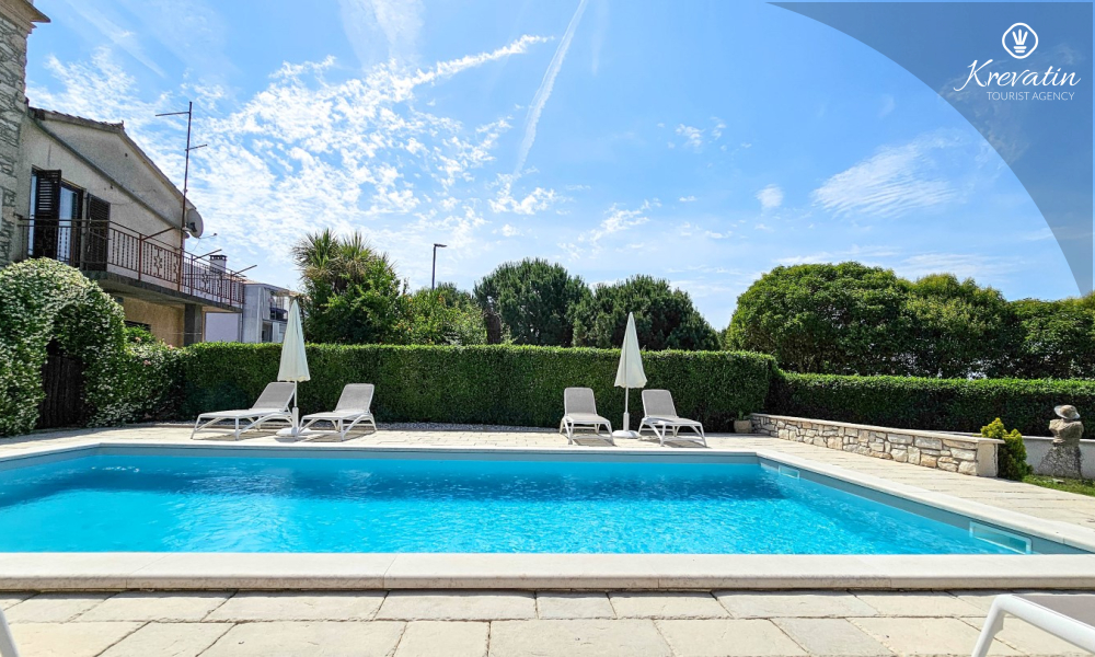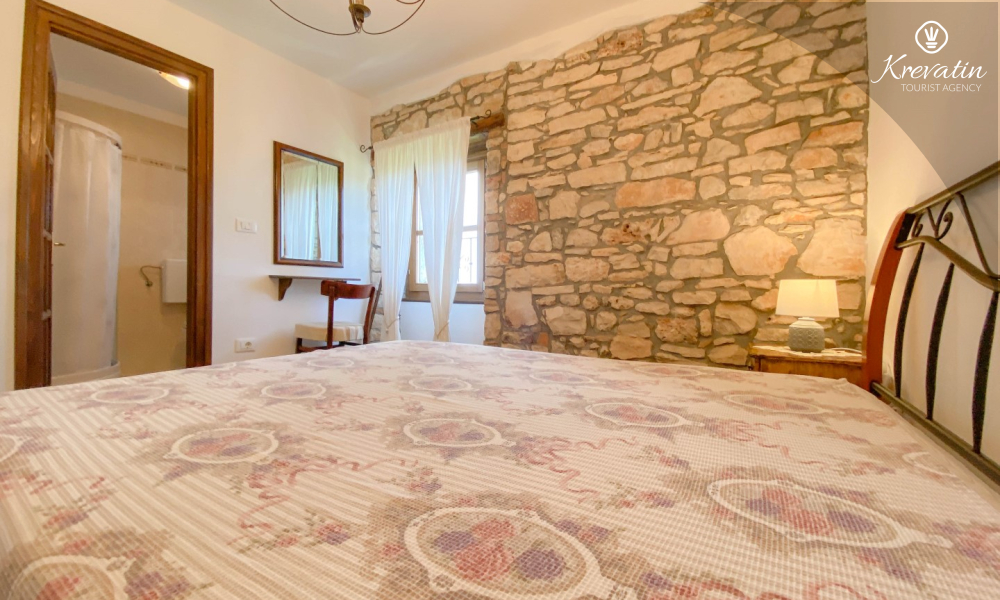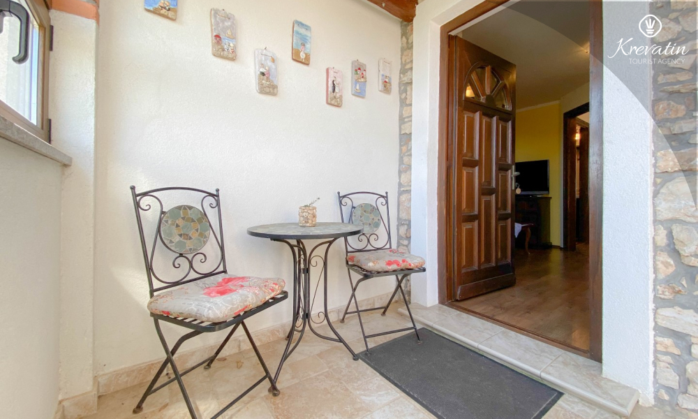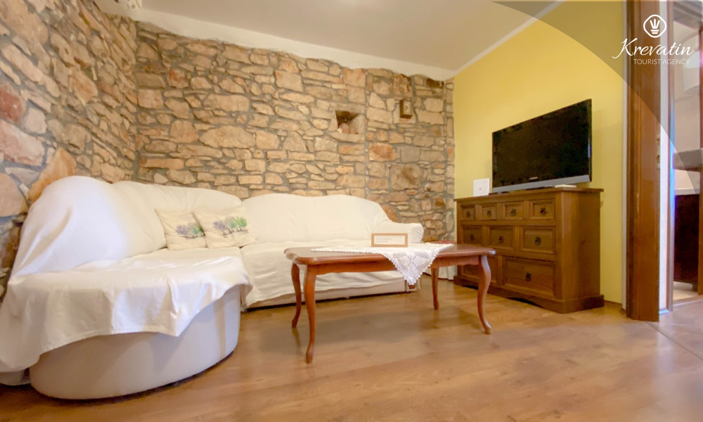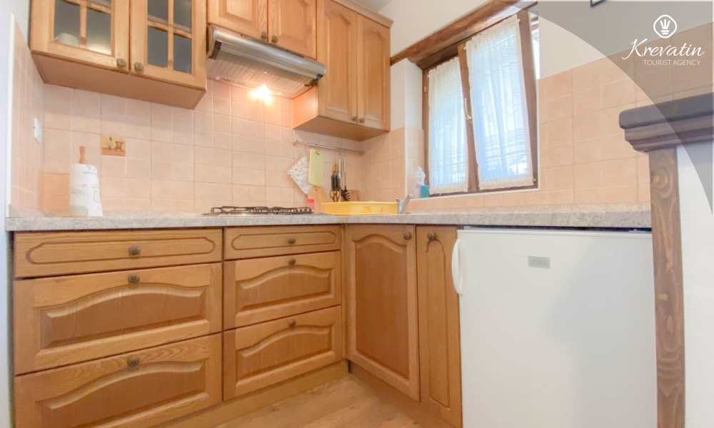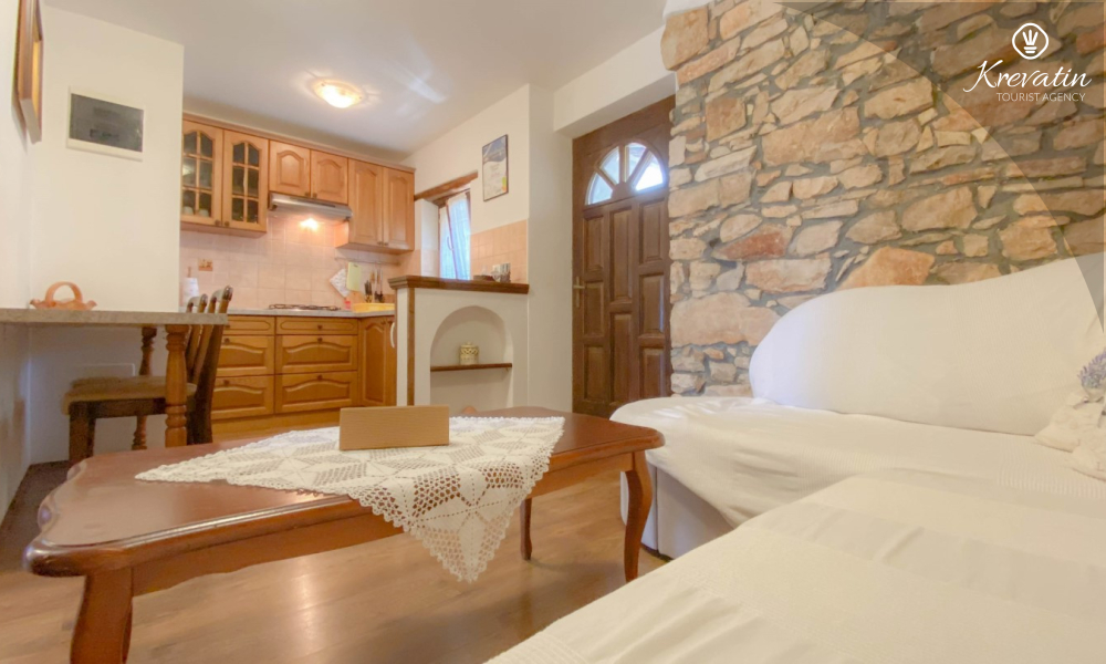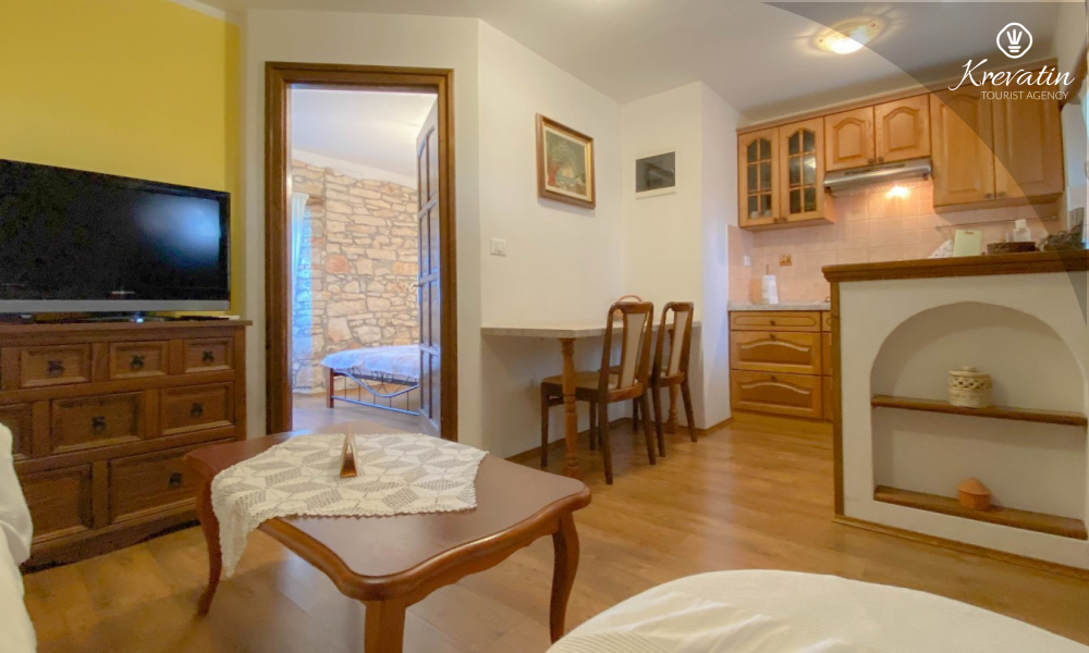 Apartman se sastoji od spavaće sobe, kuhinje s blagovaonom opremljene osnovnim stvarima, te kupaonice s tušem i WC-om. Gostima je na raspolaganju i zajednički vrt, te vanjski bazen za koji je na raspolaganju svim gostima kuće.