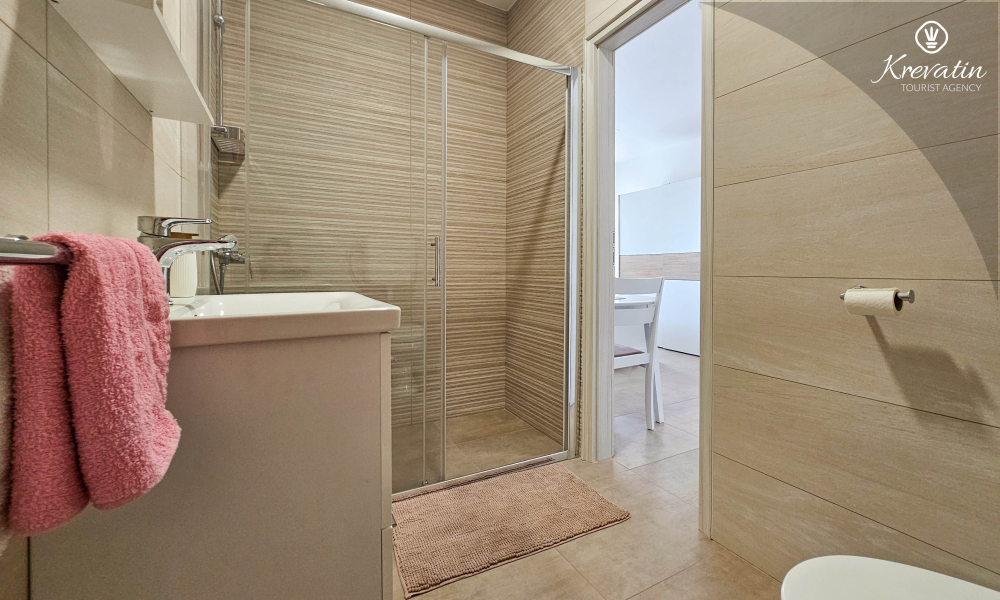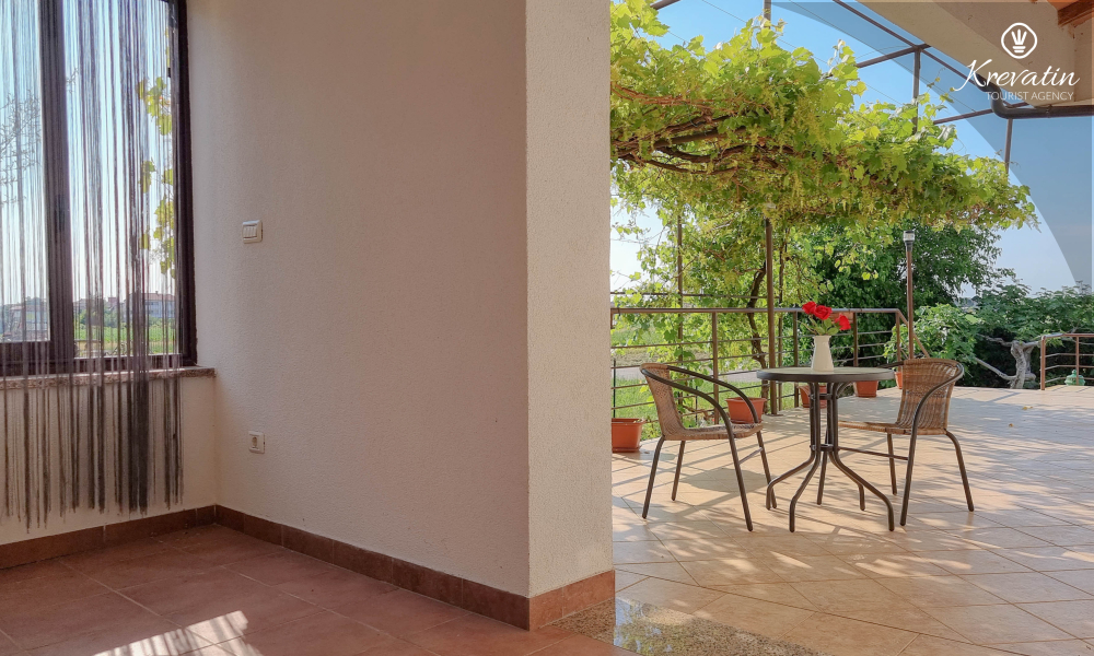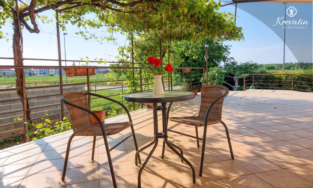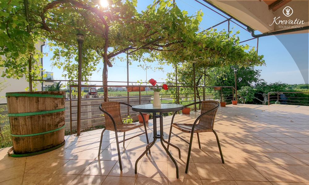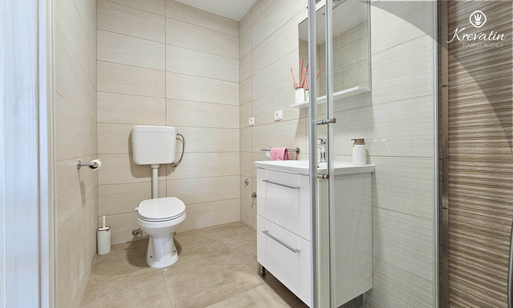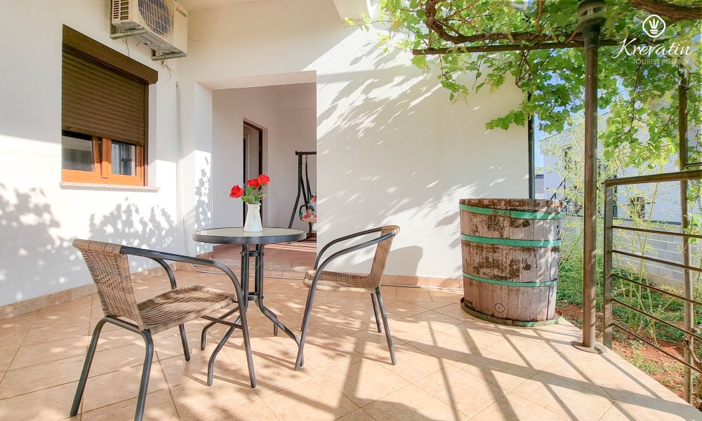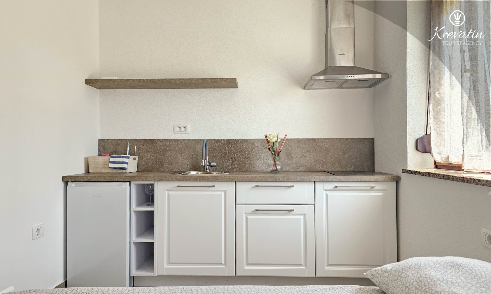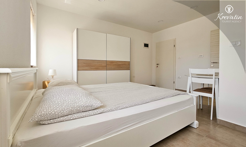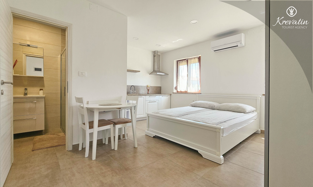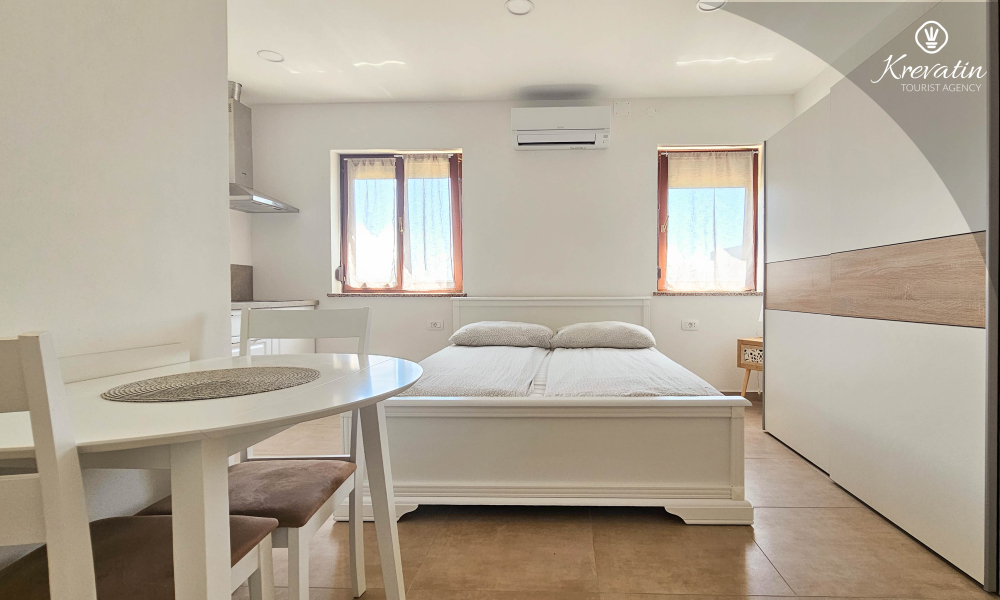 Unutar apartmana se nalazi spavaća soba s kuhinjom - opremljena osnovnim stvarima za pripremu laganih obroka te praktična kupaonica s tušem. Vanjska, zajednička terasa nudi vam idealno mjesto za opuštanje na otvorenom uz jutarnju kavu ili večernji aperitiv.
