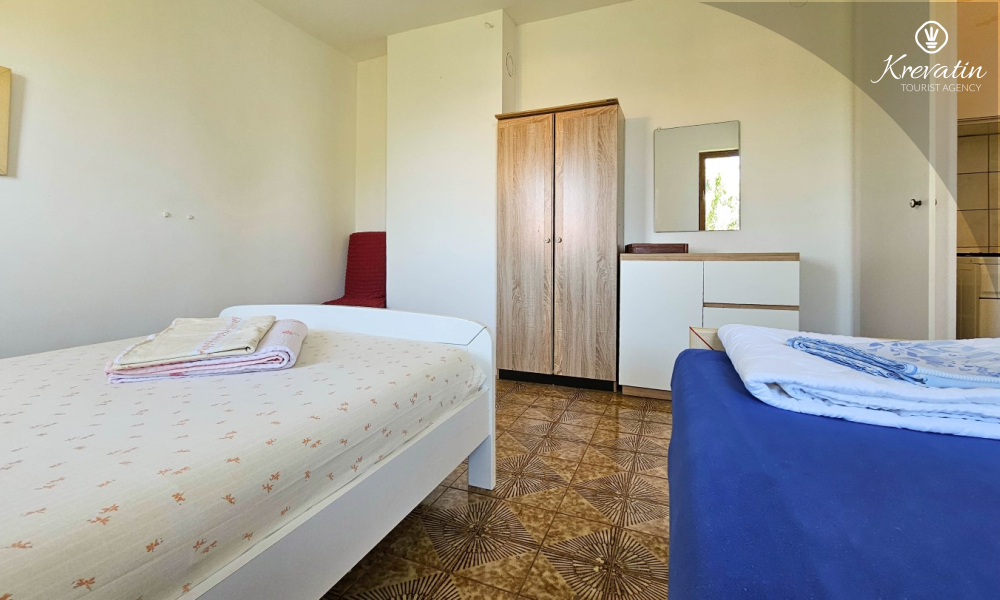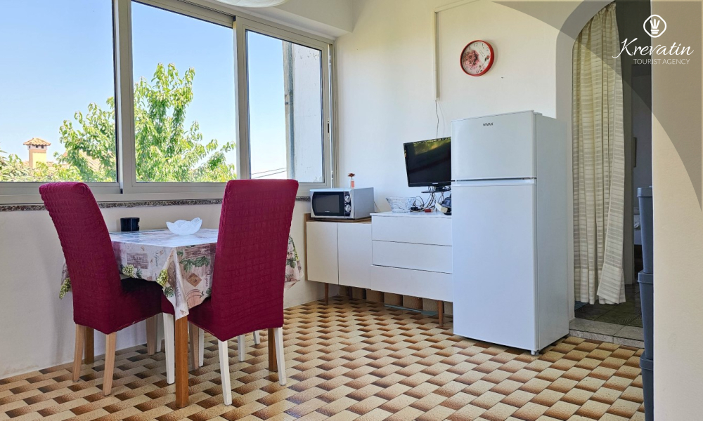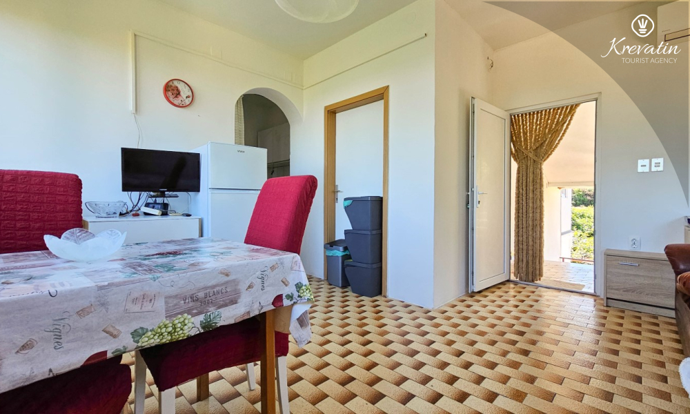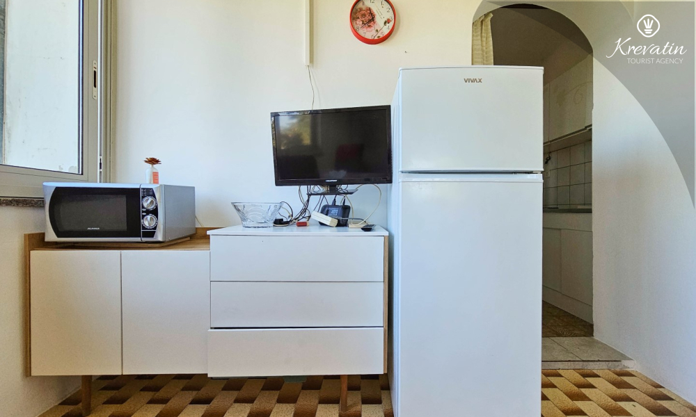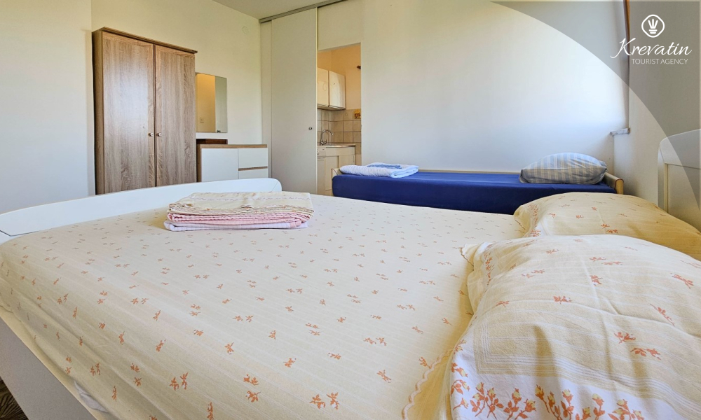 Sastoji se od udobne spavaće sobe, praktičnog dnevnog boravka s blagovaonicom i kuhinje opremljene osnovnim stvarima za pripremu jednostavnih obroka. Apartman ima praktičnu kupaonicu s tušem, WC-om i perilicom rublja.
