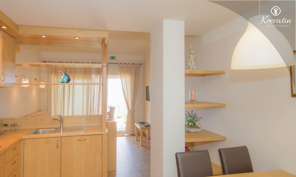 Smješten neposredno uz more, ovaj apartman za 2 do 5 osoba sastoji se od dvije spavaće sobe od kojih je jedna s bračnim krevetom, a druga s dva odvojena kreveta i smještena je na galeriji, dnevnog boravka s kaučem na razvlačenje za 1 osobu i kuhinje. Kuhinja je opremljena sa električnim štednjakom, hladnjakom i perilicom posuđa. Osim toga tu je i kupaonica s tušem i WC-om te lijepa terasa s garniturom i sa pogledom na more koja vodi izravno na plažu.