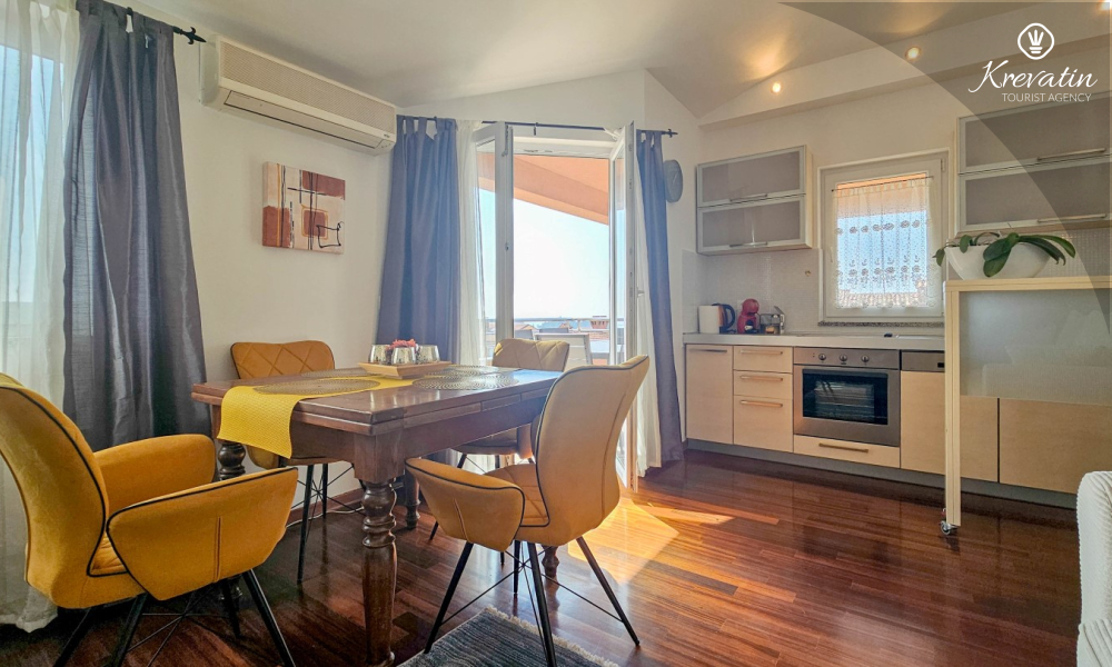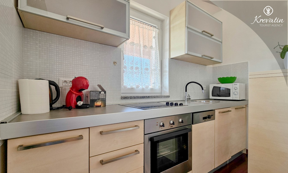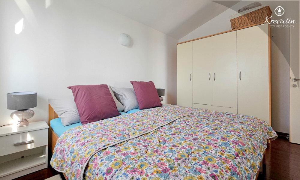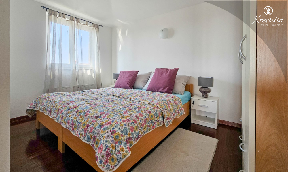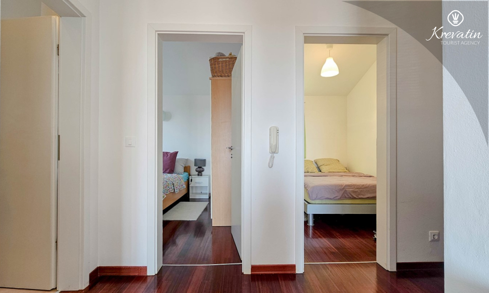 Apartman se sastoji od dvije spavaće sobe, obje opremljene bračnim krevetima, pružajući miran san nakon dana istraživanja. Kuhinja s dnevnim boravkom i blagovaonicom nudi funkcionalnost i udobnost, opremljena osnovnim potrepštinama za pripremu ukusnih obroka. Dnevni boravak je idealno mjesto za opuštanje uz televiziju ili druženje, a njegov izlaz na balkon omogućuje uživanje u svježem zraku i prekrasnom pogledu.