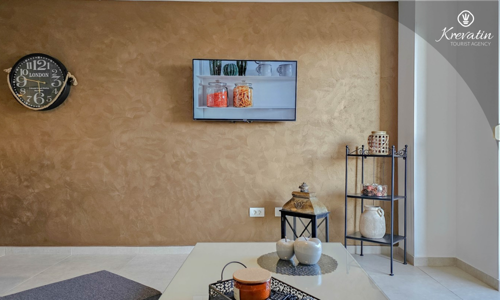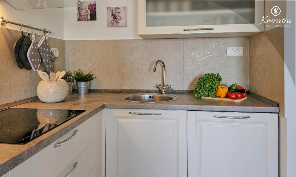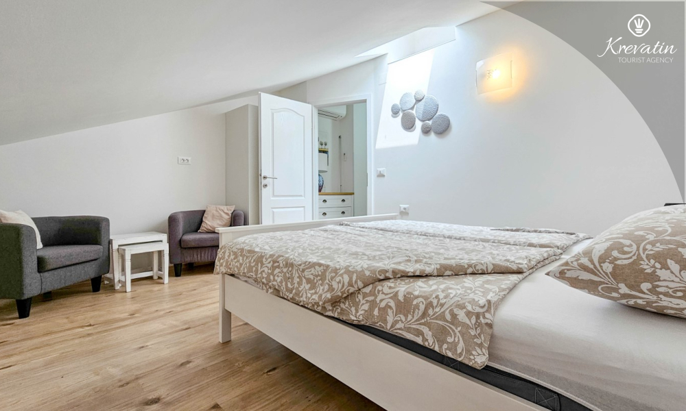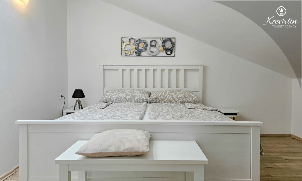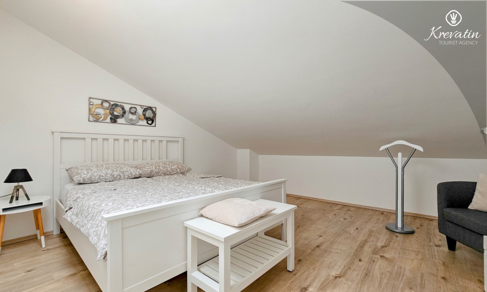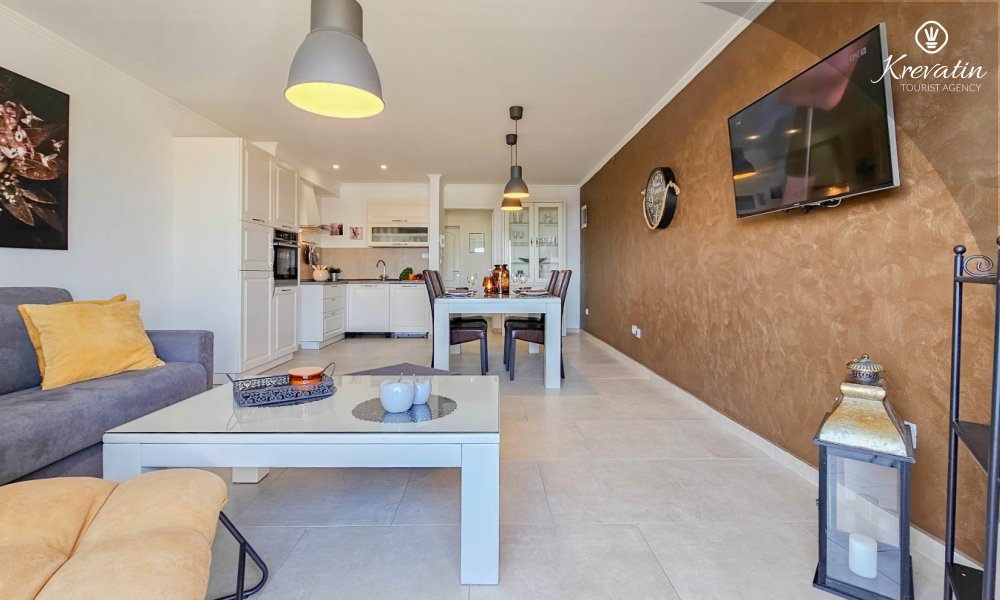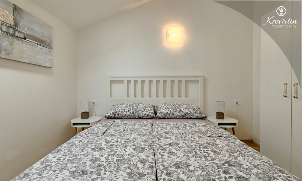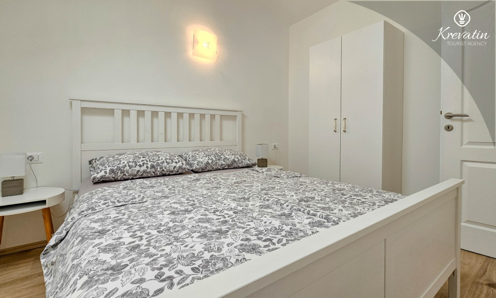 Sastoji se od dvije udobne spavaće sobe, dnevnog boravka i dobro opremljene kuhinje s blagovaonicom. Gostima je na raspolaganju kupaonica s tušem i WC-om te balkon sa stolom i stolicama, idealan za opuštanje i uživanje na otvorenom.
