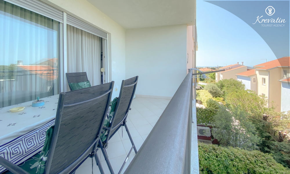 Ovaj apartman za maksimalno 4 osoba, smješten je na prvom katu i sastoji se od dviju spavaćih soba, dnevnog boravka i kuhinje. Kuhinja je opremljena sa električnim štednjakom, pećnicom, perilicom posuđa, mikrovalnom i hladnjakom. Nadalje tu je i kupaonica s tušem i WC-om te lijepa terasa sa stolom i stolicama i pogledom na more. SAT-TV, klima, WLAN, posteljina i ručnici su uključeni u cijenu. Kućni ljubimci su dozvoljeni uz nadoplatu.