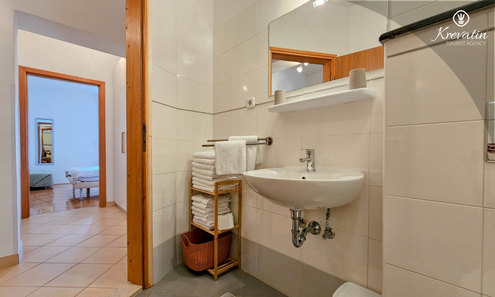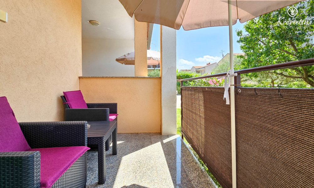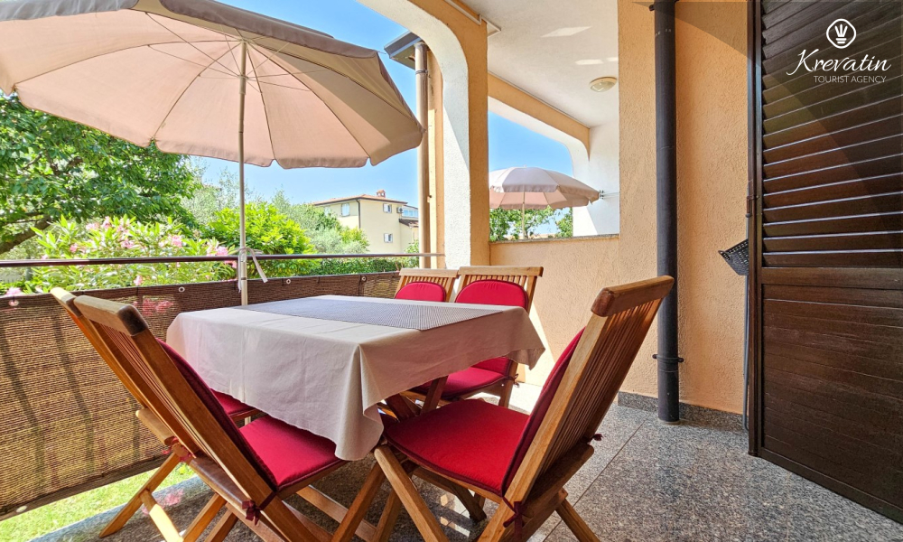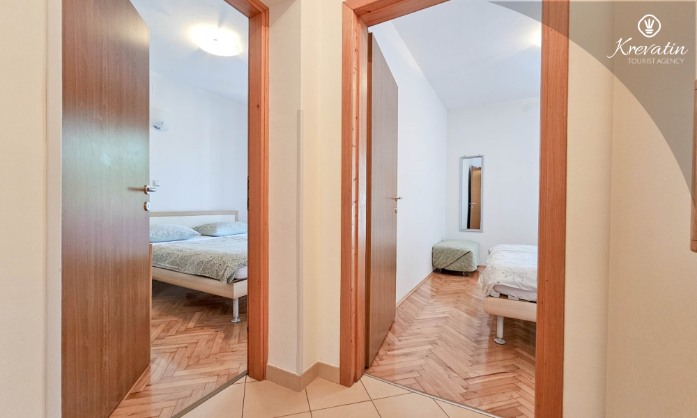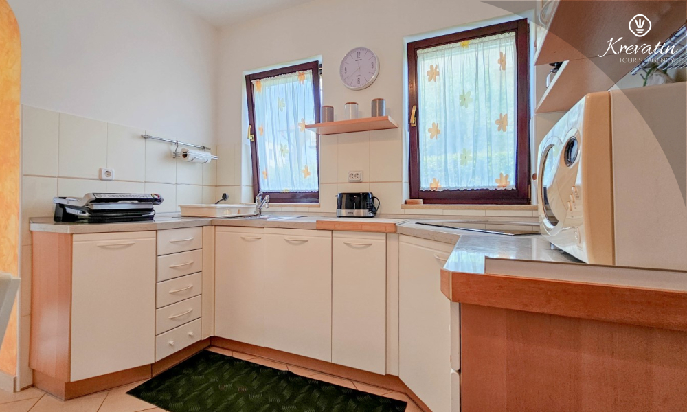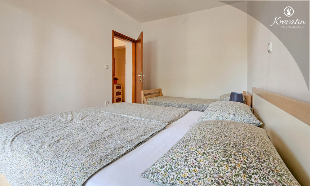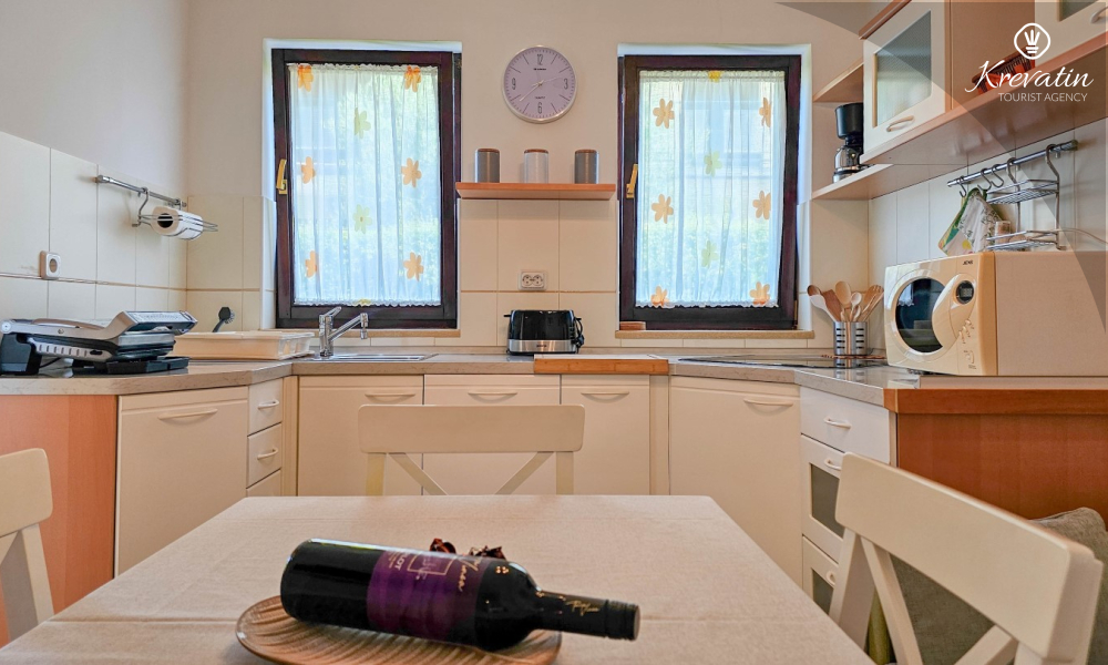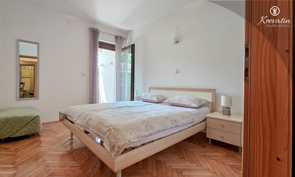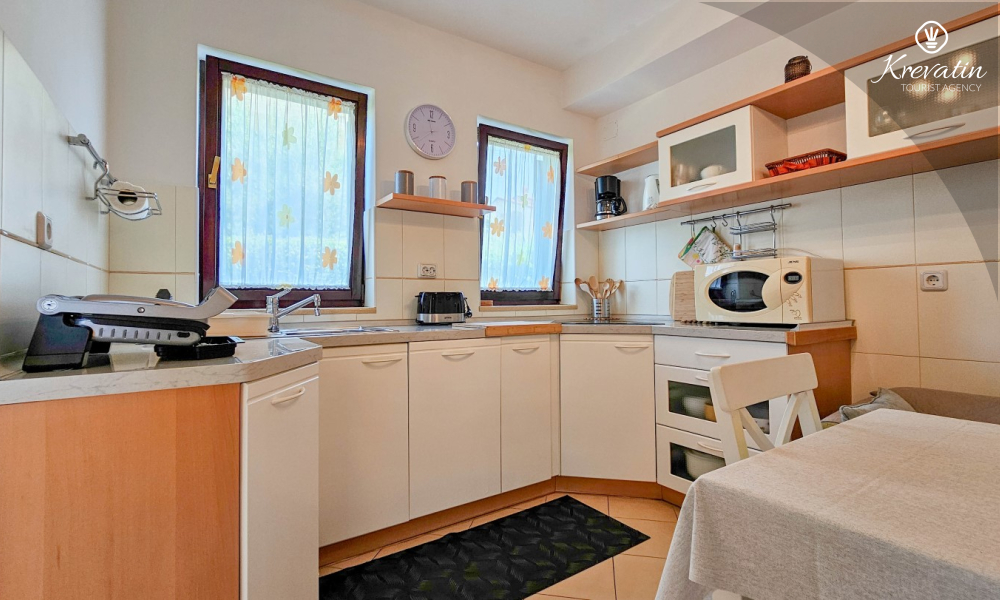 Apartman nudi dvije spavaće sobe, kuhinju opremljenu osnovnim stvarima za pripremu obroka, kupaonicu s tuš kabinom i WC-om te dvije natkrivene terase sa stolom i stolicama – savršene za opuštanje na svježem zraku. Također, na raspolaganju je zajednički vrt s roštiljem.