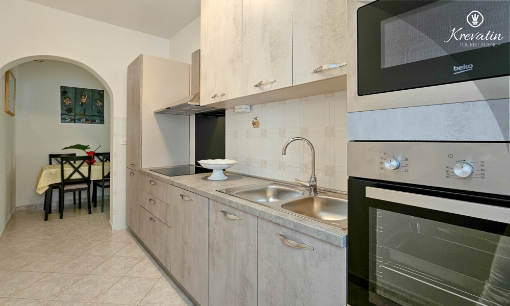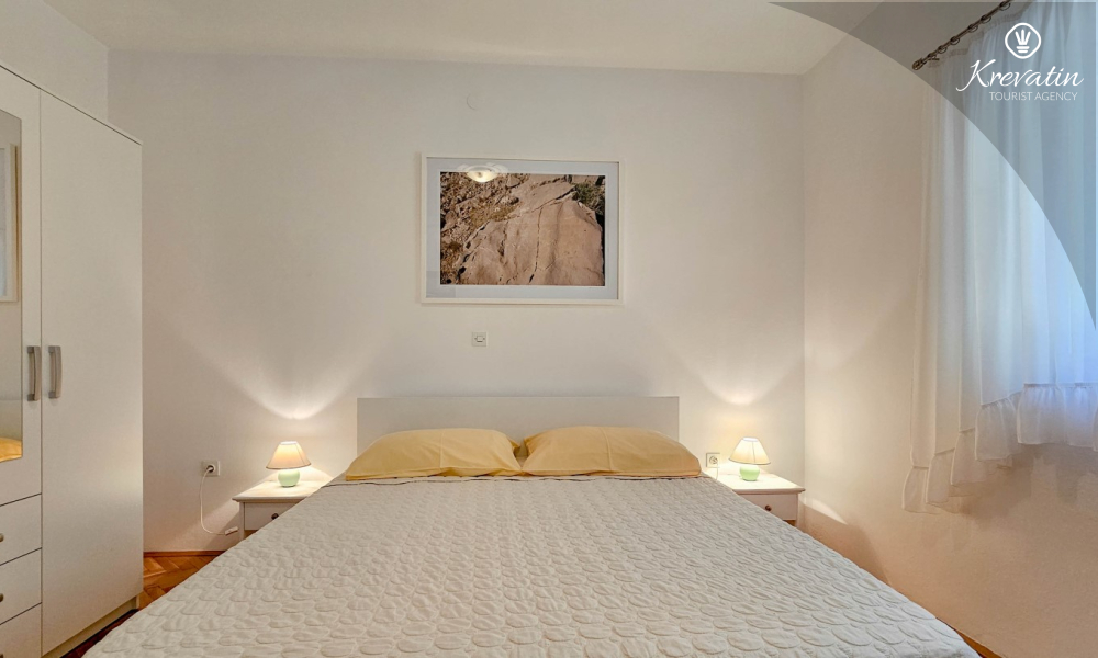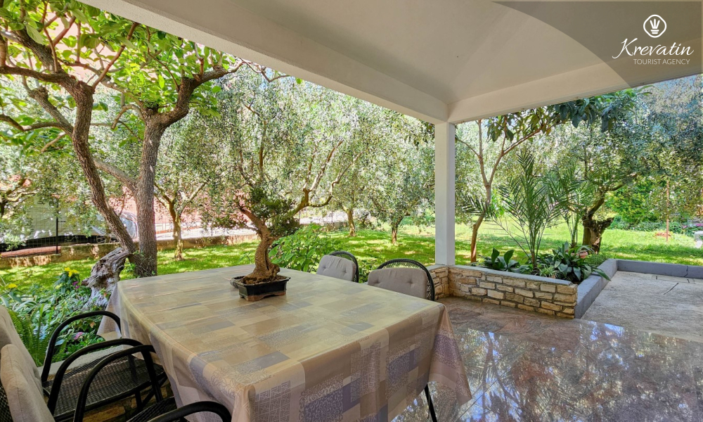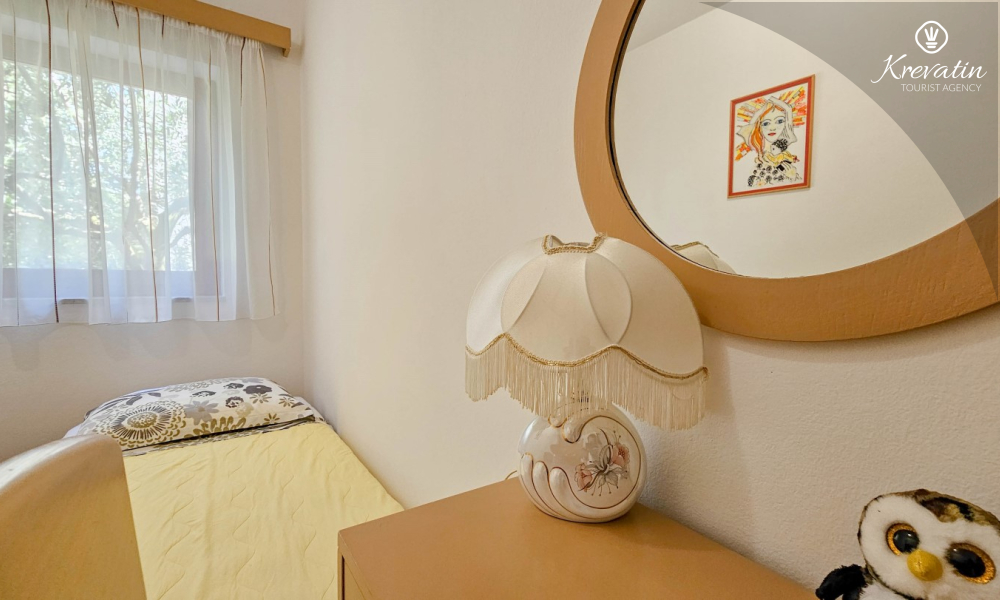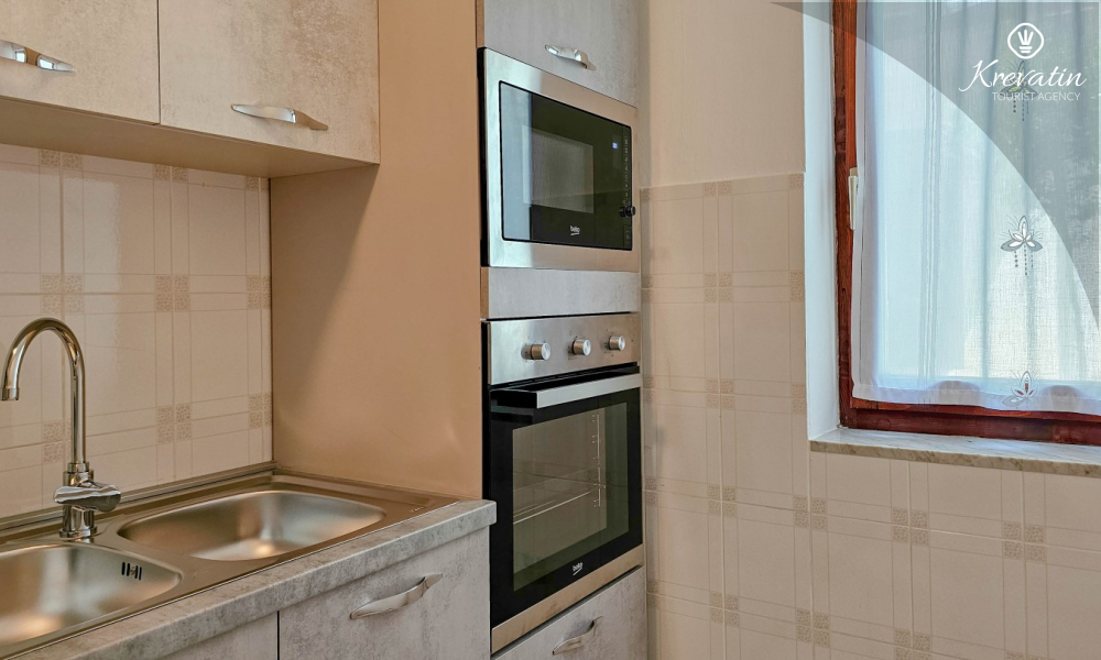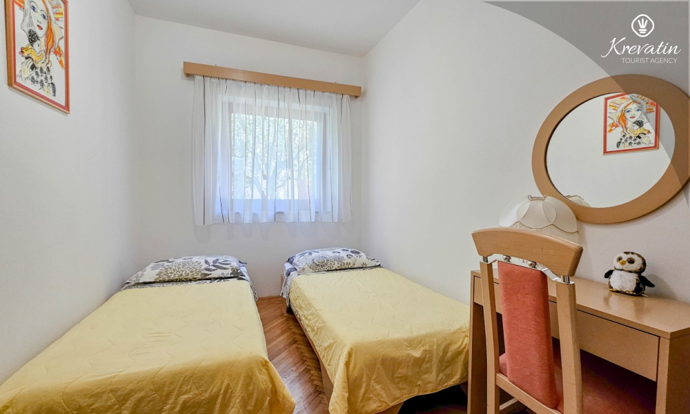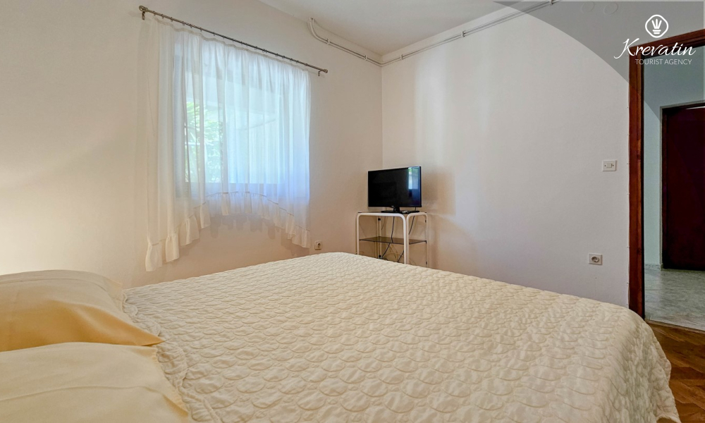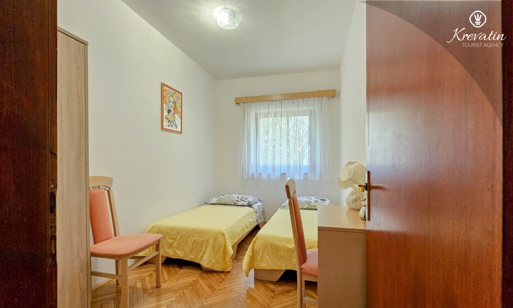 Nalazi se u prizemlju obiteljske kuće i sastoji se od dvije spavaće sobe, funkcionalne kuhinje s blagovaonicom opremljene osnovnim stvarima te kupaonice s tuš kabinom i WC-om. Apartmana raspolaže natkrivenom terasom s vrtnim namještajem, a gostima je na korištenje i zajednički vrt s roštiljem – savršeno za ljetna druženja u hladu.