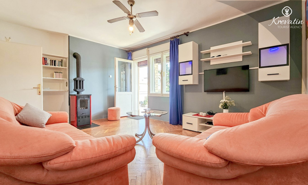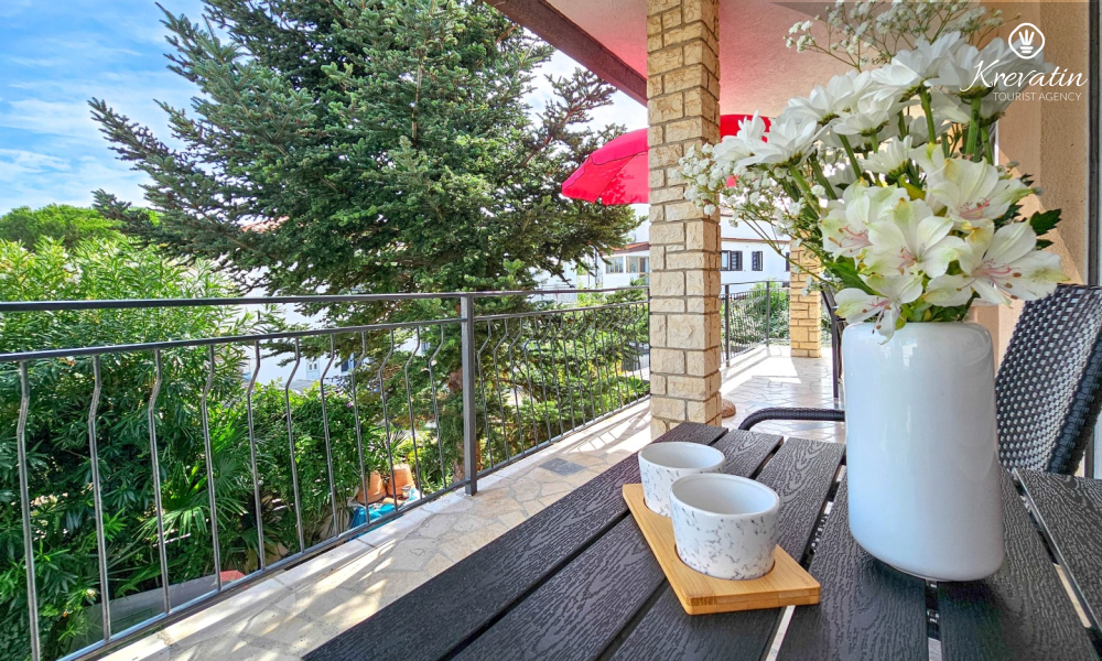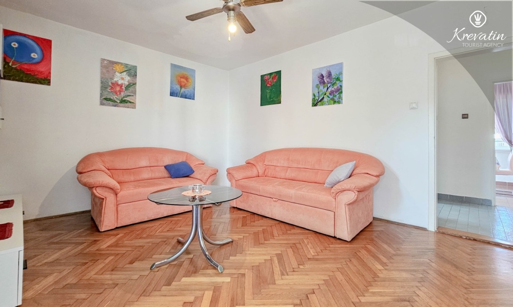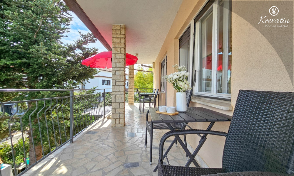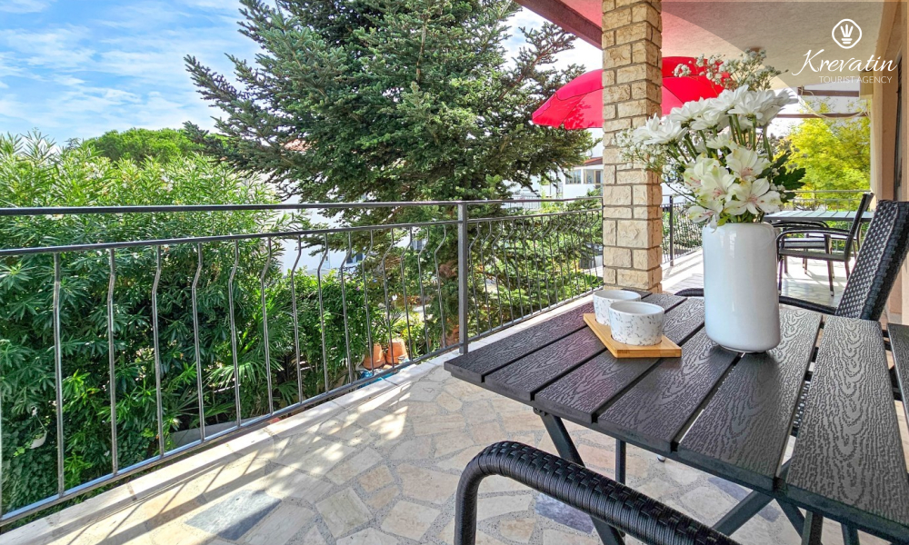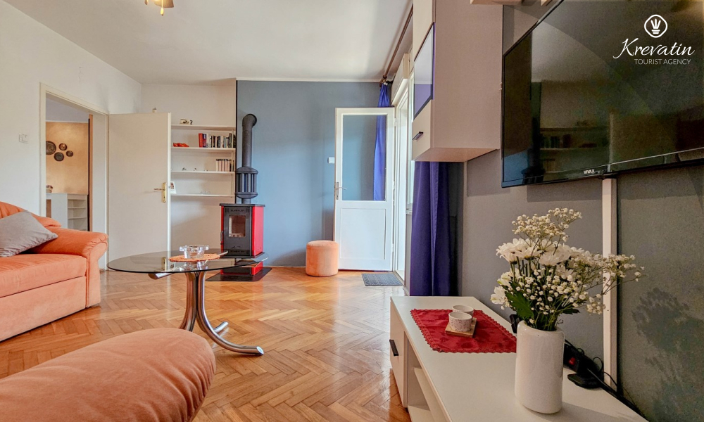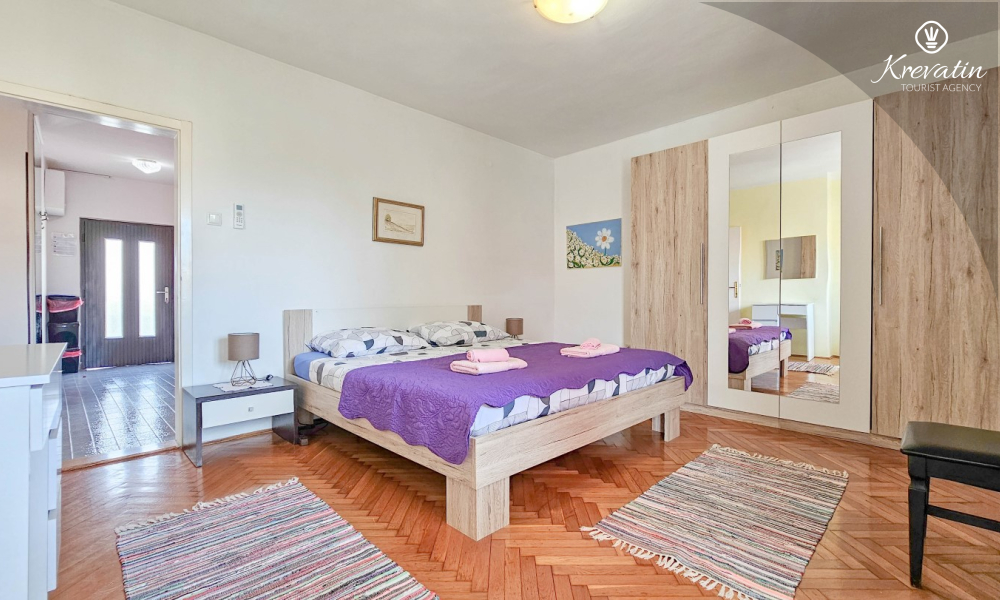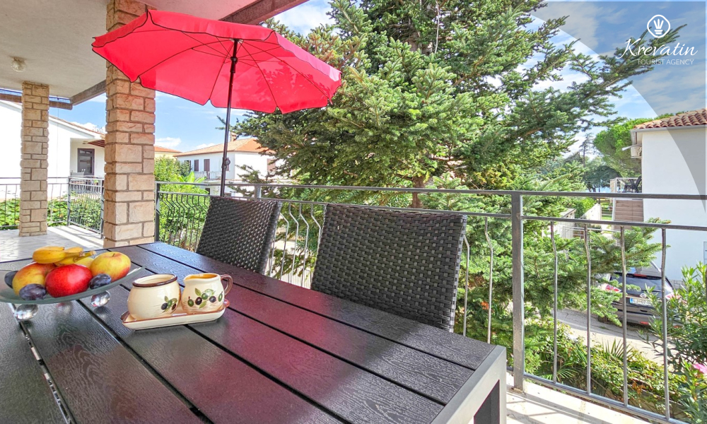 Nalazi se na prvom katu obiteljske kuće, a sastoji se od 2 spavaće sobe, prostranog dnevnog boravka, praktične kuhinje s blagovaonicom, kupaonice s tuš kabinom te ugodnog balkona s pogledom na mjesto – idealne za druženja na otvorenom.
