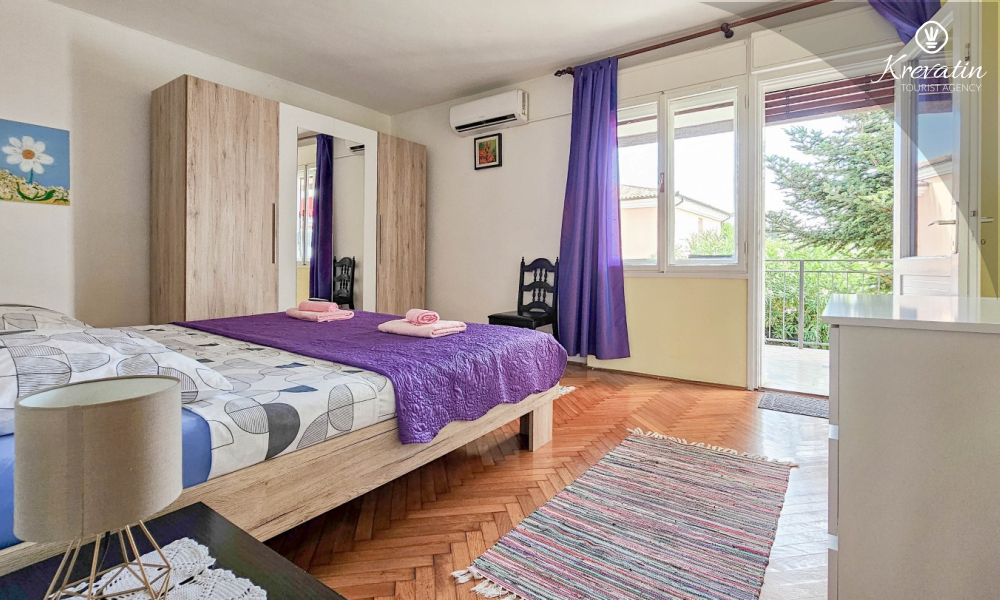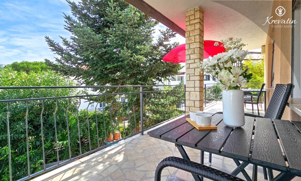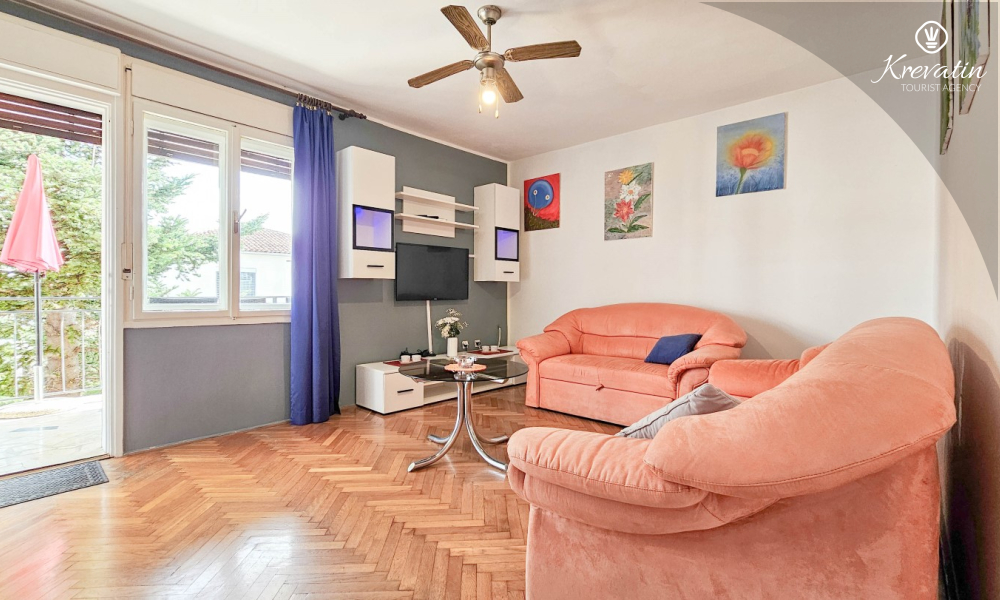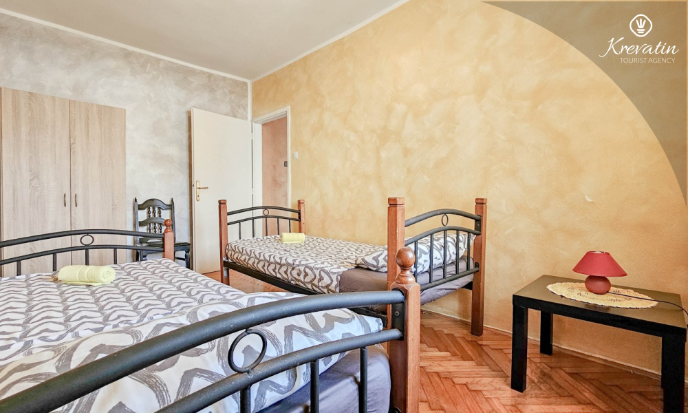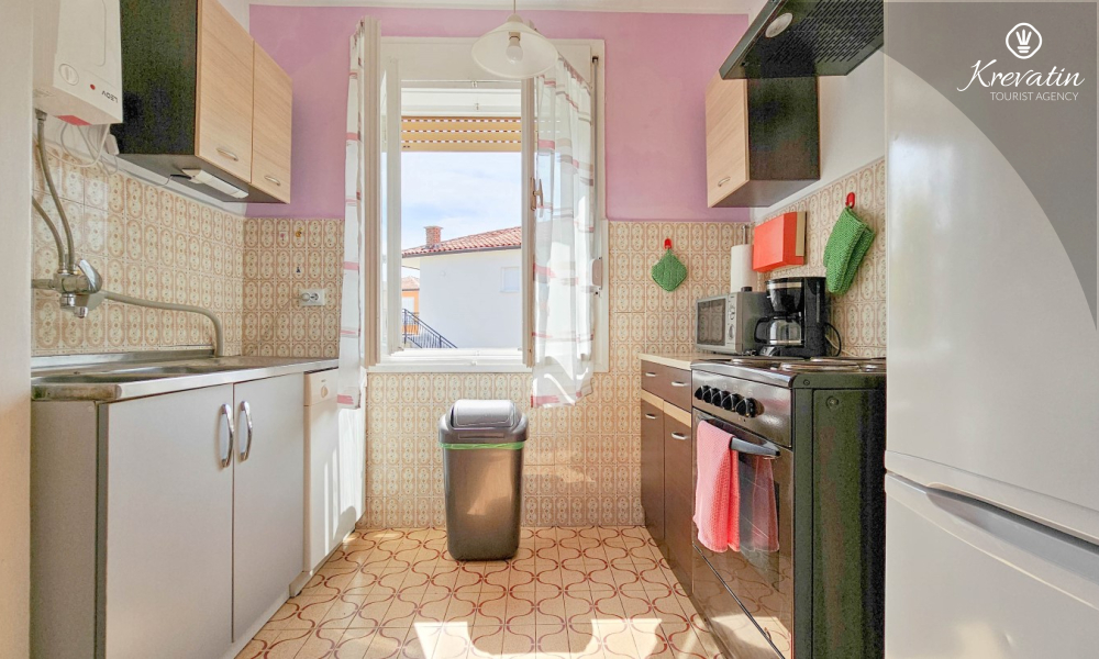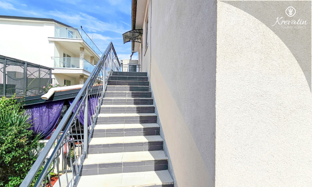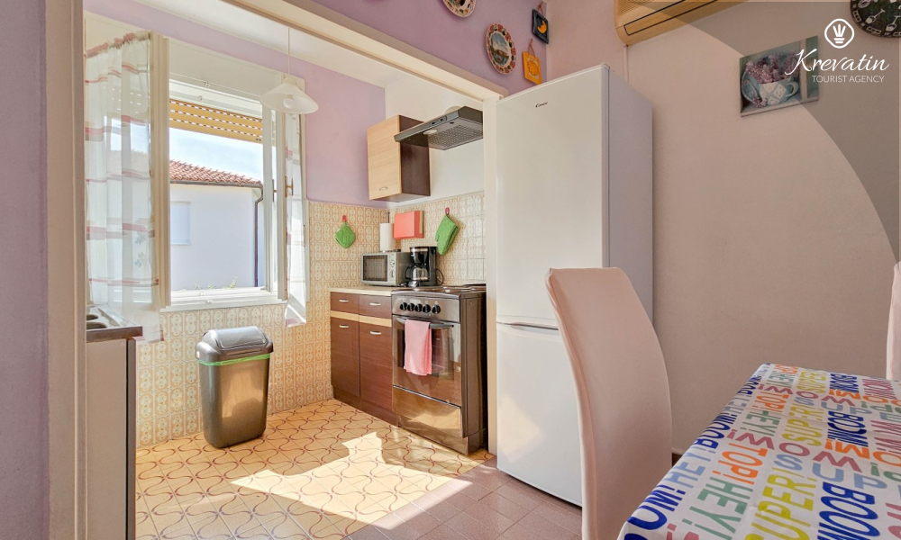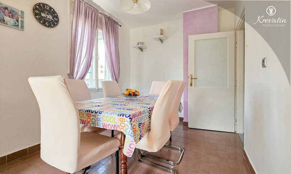Nalazi se na prvom katu obiteljske kuće, a sastoji se od 2 spavaće sobe, prostranog dnevnog boravka, praktične kuhinje s blagovaonicom, kupaonice s tuš kabinom te ugodnog balkona s pogledom na mjesto – idealne za druženja na otvorenom.