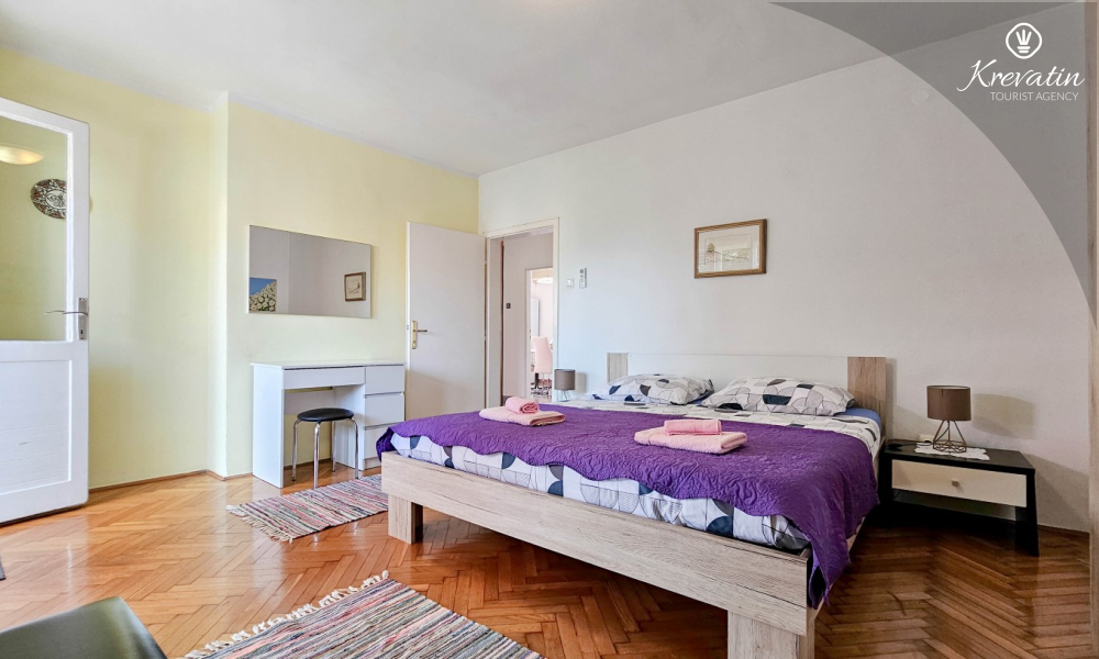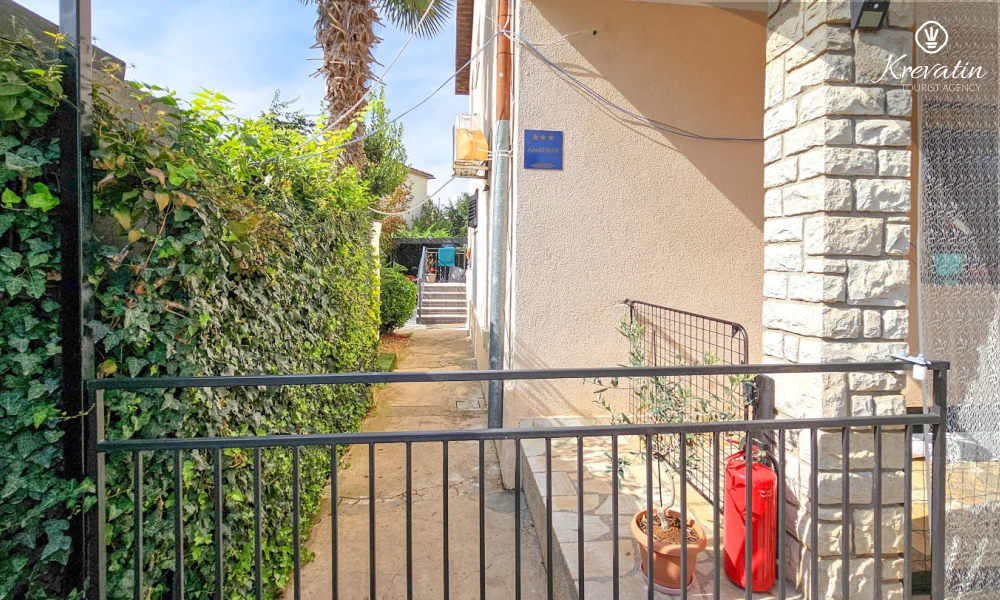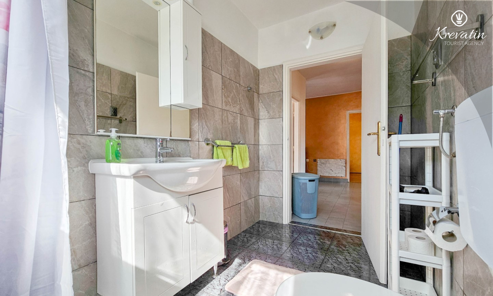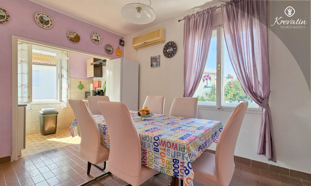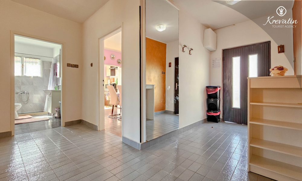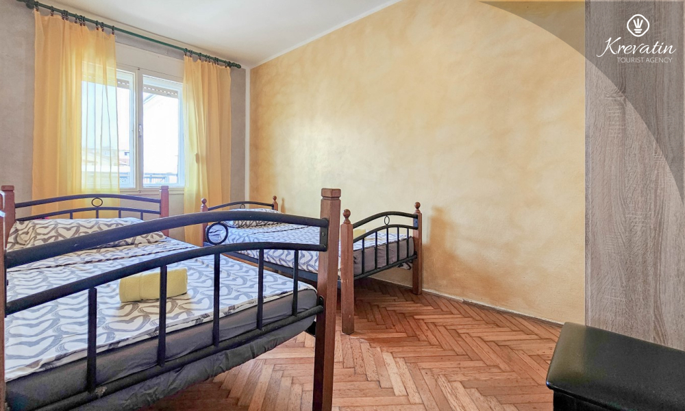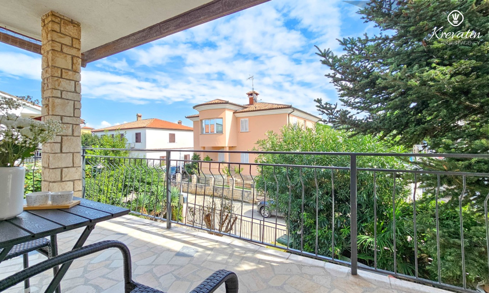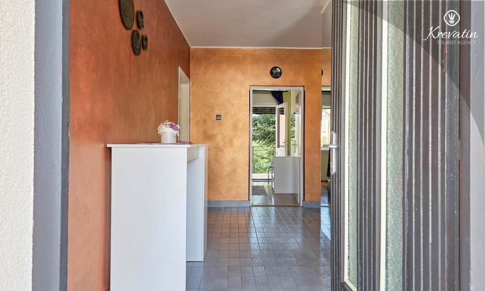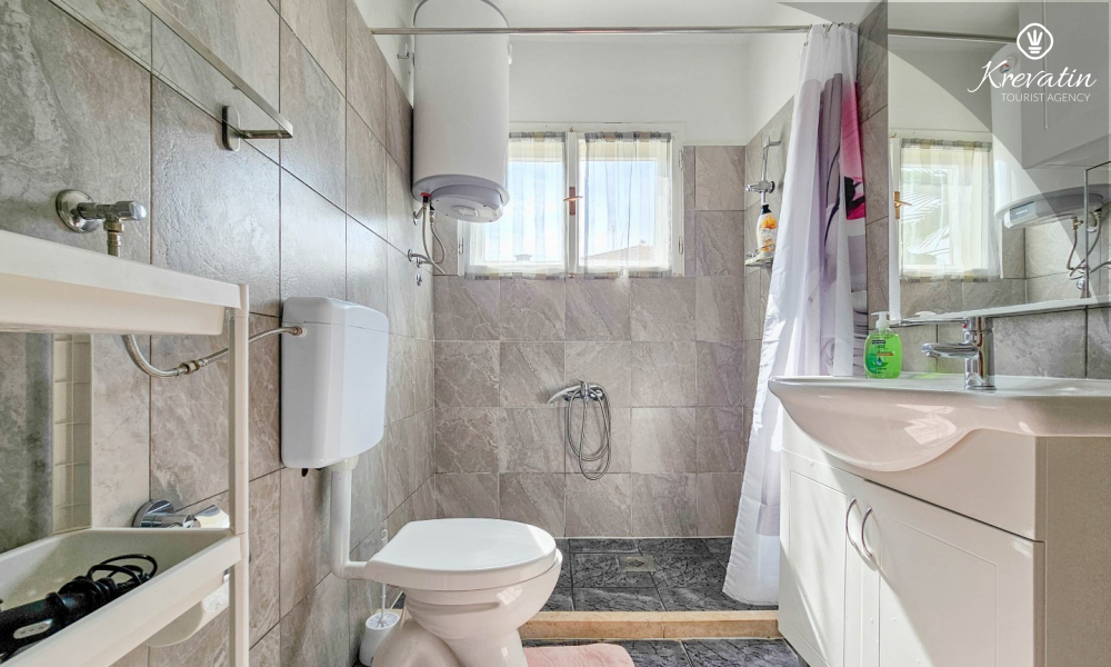 Nalazi se na prvom katu obiteljske kuće, a sastoji se od 2 spavaće sobe, prostranog dnevnog boravka, praktične kuhinje s blagovaonicom, kupaonice s tuš kabinom te ugodnog balkona s pogledom na mjesto – idealne za druženja na otvorenom.