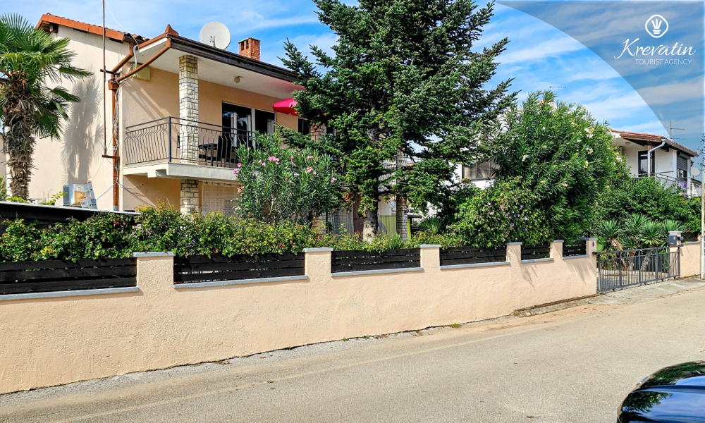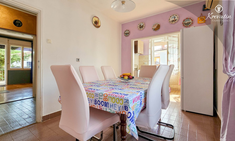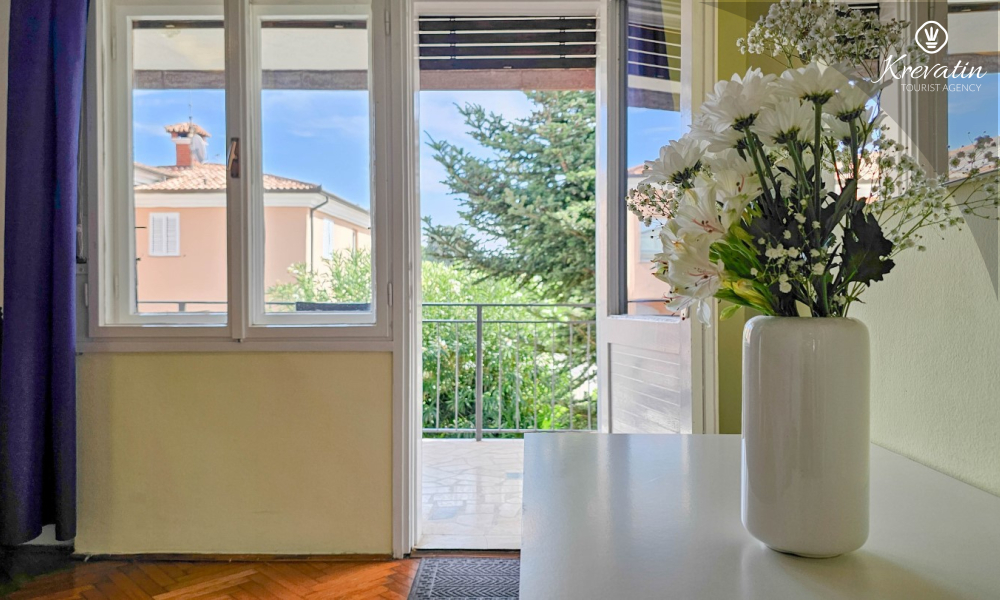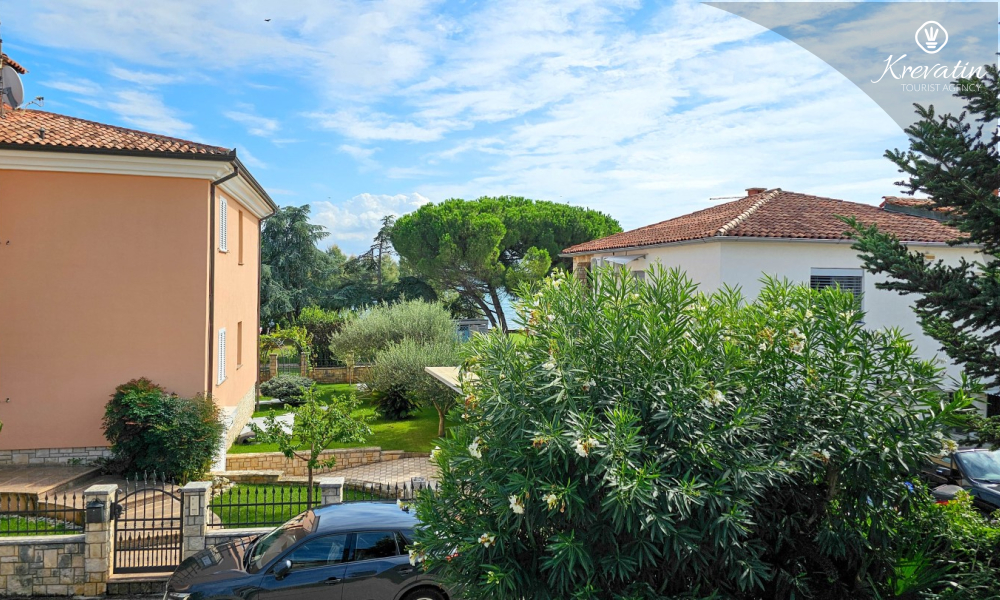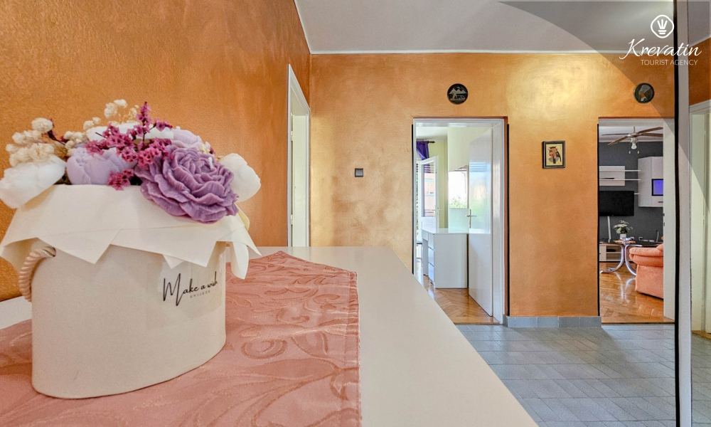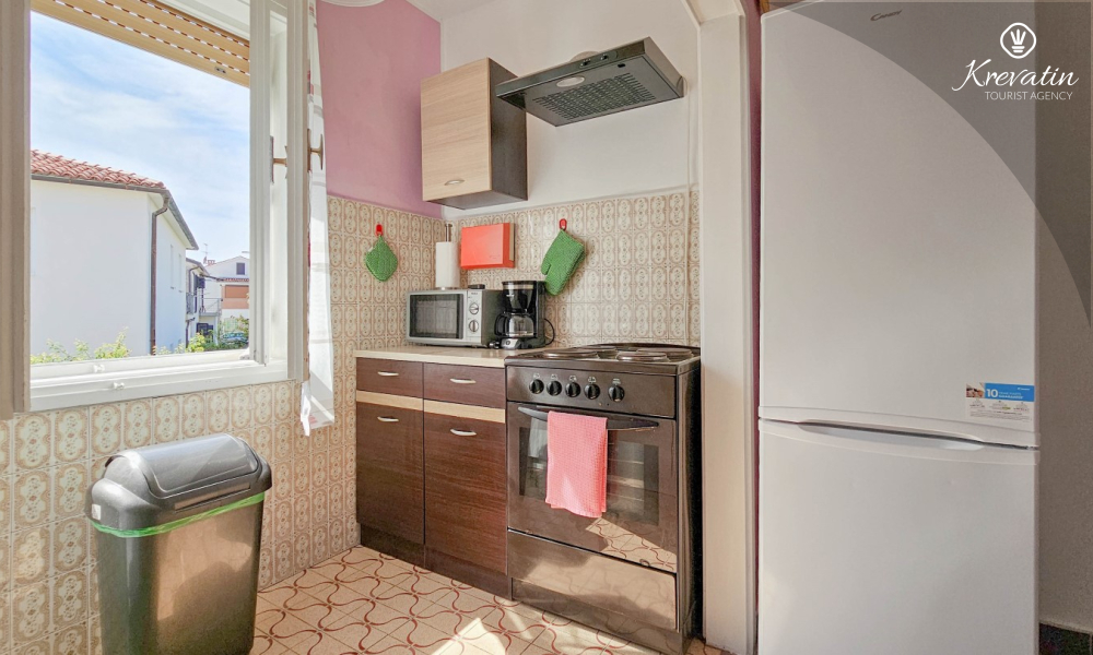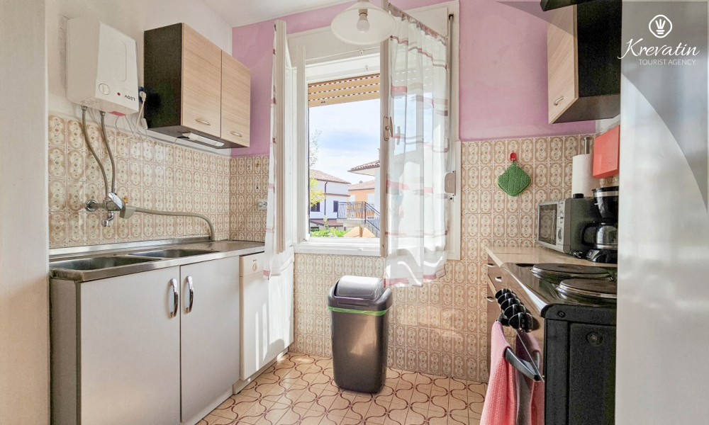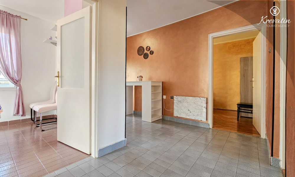 Nalazi se na prvom katu obiteljske kuće, a sastoji se od 2 spavaće sobe, prostranog dnevnog boravka, praktične kuhinje s blagovaonicom, kupaonice s tuš kabinom te ugodnog balkona s pogledom na mjesto – idealne za druženja na otvorenom.