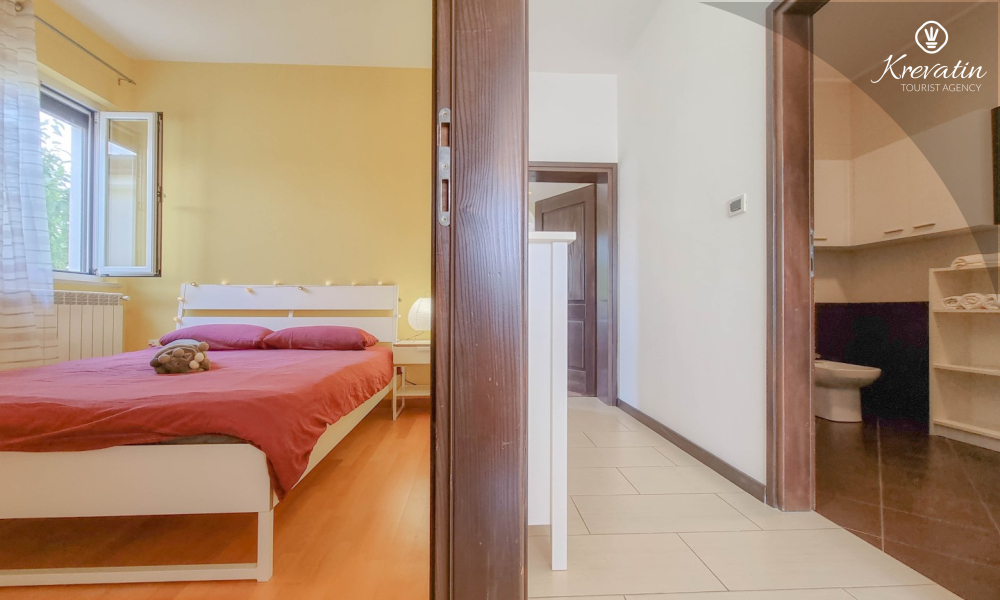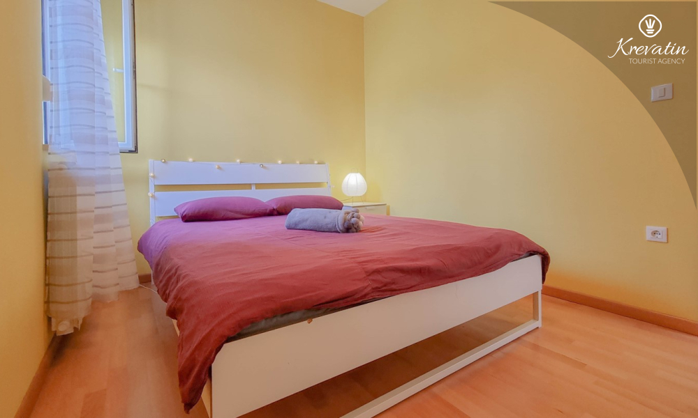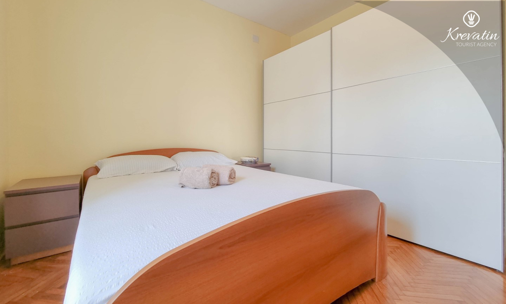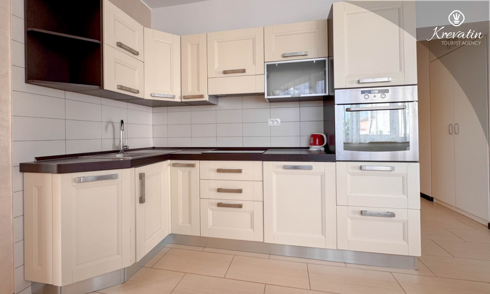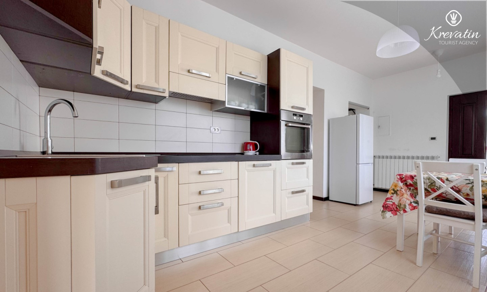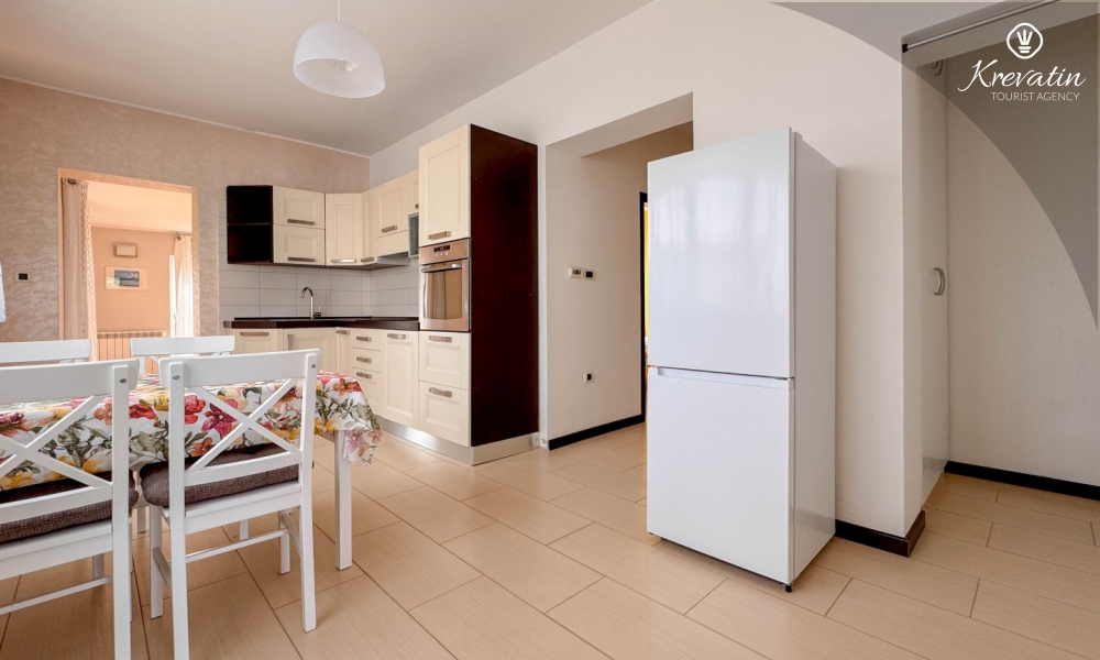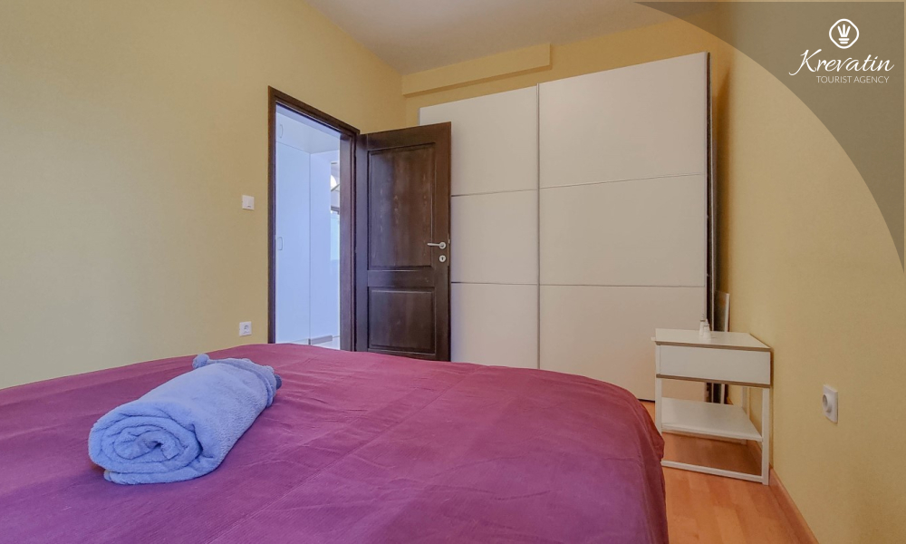Sastoji se od dvije spavaće sobe s bračnim krevetima, dnevnog boravka i kuhinje opremljene svime što vam treba za pripremu domaćih obroka. Tu je i kupaonica s tušem i WC-om, te prostrana terasa s vrtnim namještajem, idealna za jutarnju kavu ili večernje druženje.