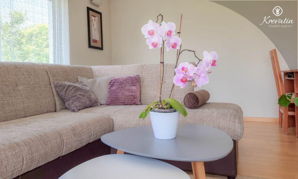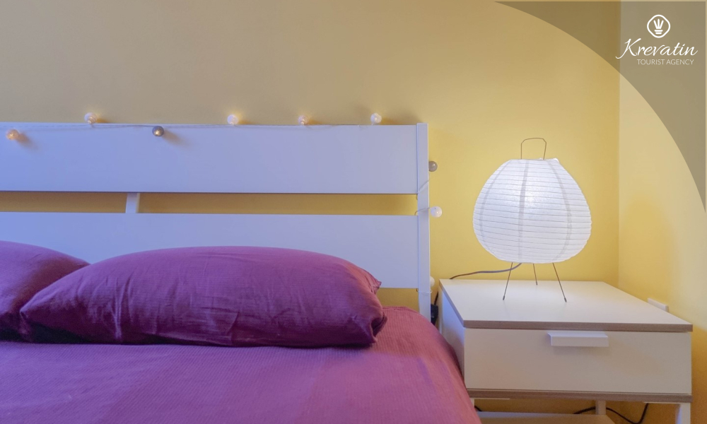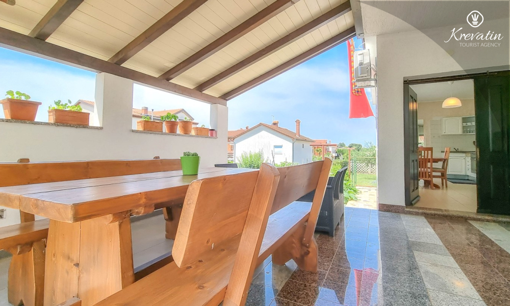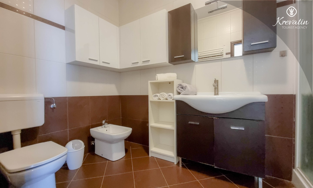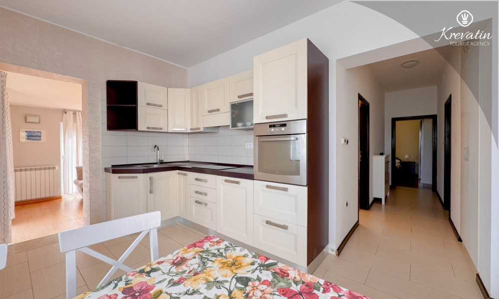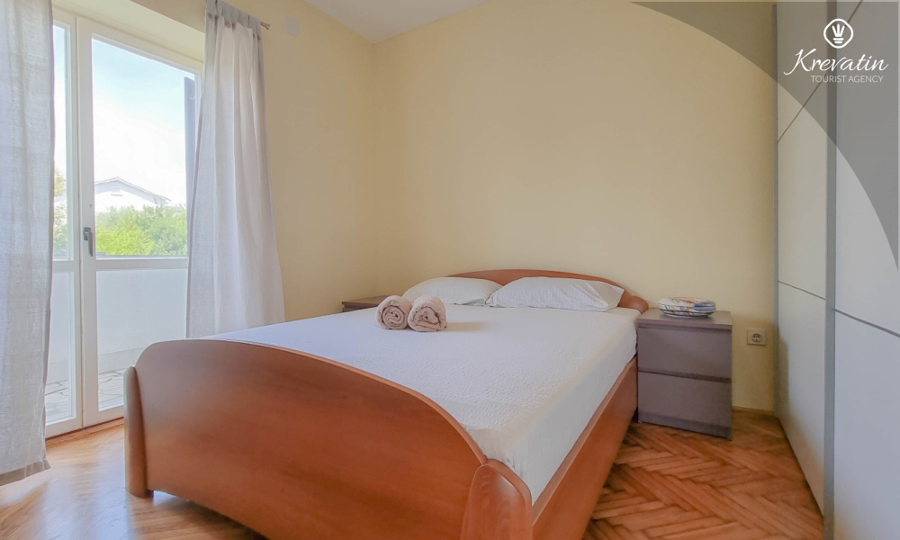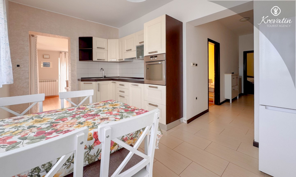 Sastoji se od dvije spavaće sobe s bračnim krevetima, dnevnog boravka i kuhinje opremljene svime što vam treba za pripremu domaćih obroka. Tu je i kupaonica s tušem i WC-om, te prostrana terasa s vrtnim namještajem, idealna za jutarnju kavu ili večernje druženje.