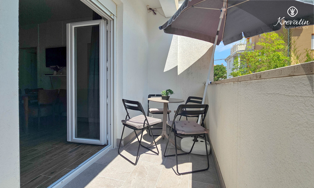 Apartman ima dvije udobne spavaće sobe, kuhinju s osnovnom opremom za pripremu obroka te balkon koji pruža ugodan prostor za opuštanje, iako ne gleda na bazen. Gosti imaju pristup zajedničkom bazenu unutar objekta – savršenom za osvježenje tijekom sunčanih dana.