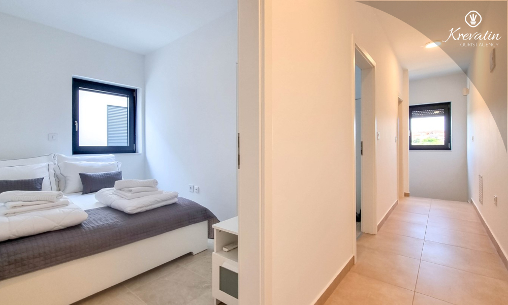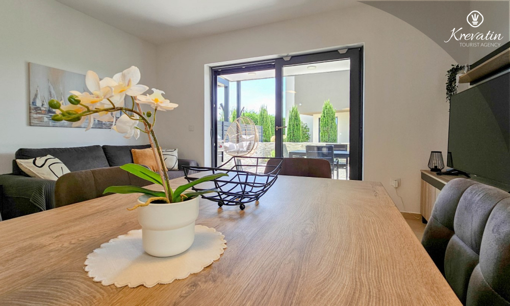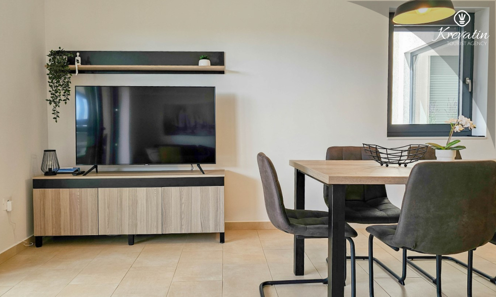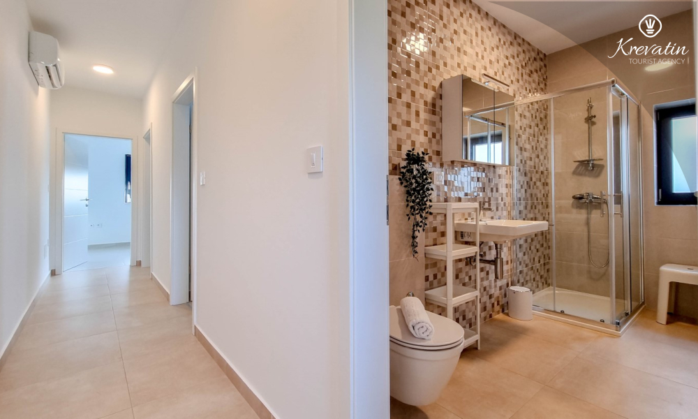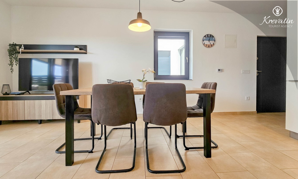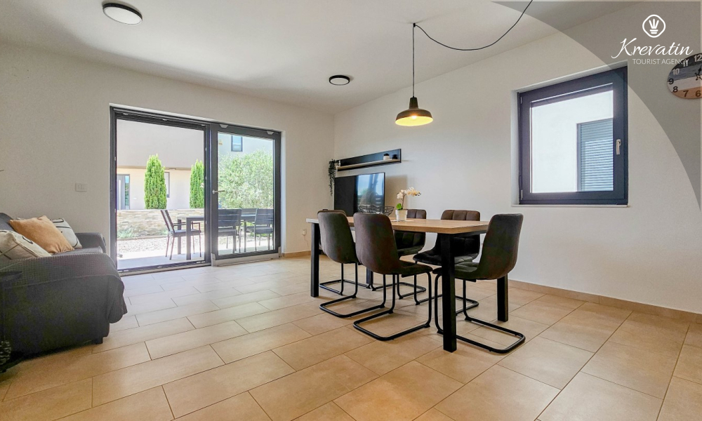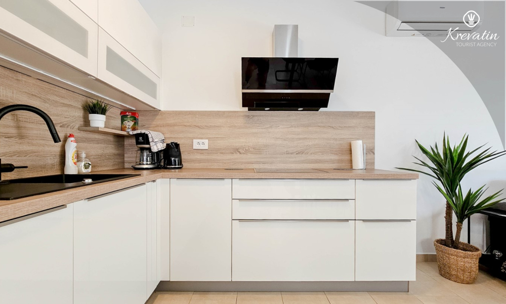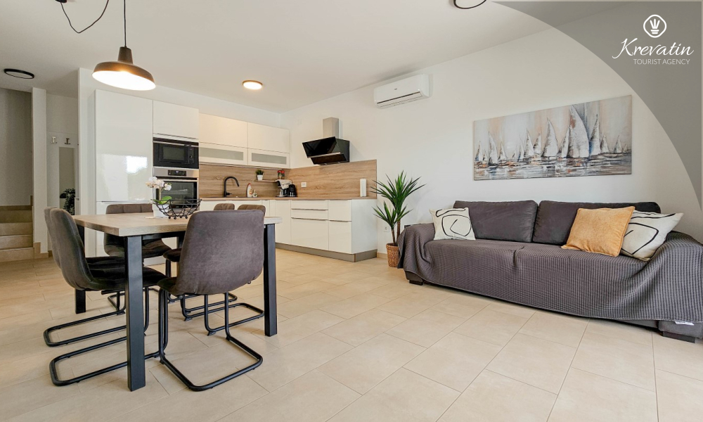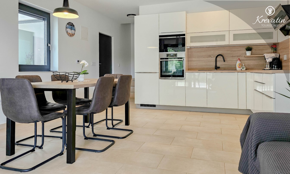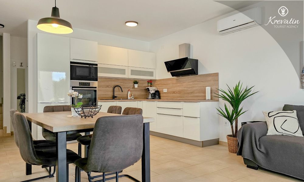 U prizemlju se nalazi prostrana kuhinja s blagovaonicom, udoban dnevni boravak s izlazom na terasu opremljenu stolom, stolicama i roštiljem, te jedna moderna kupaonica. Kuhinja je potpuno opremljena osnovnim stvarima za pripremu obroka. Na prvom katu nalaze se tri udobne spavaće sobe i još jedna kupaonica.