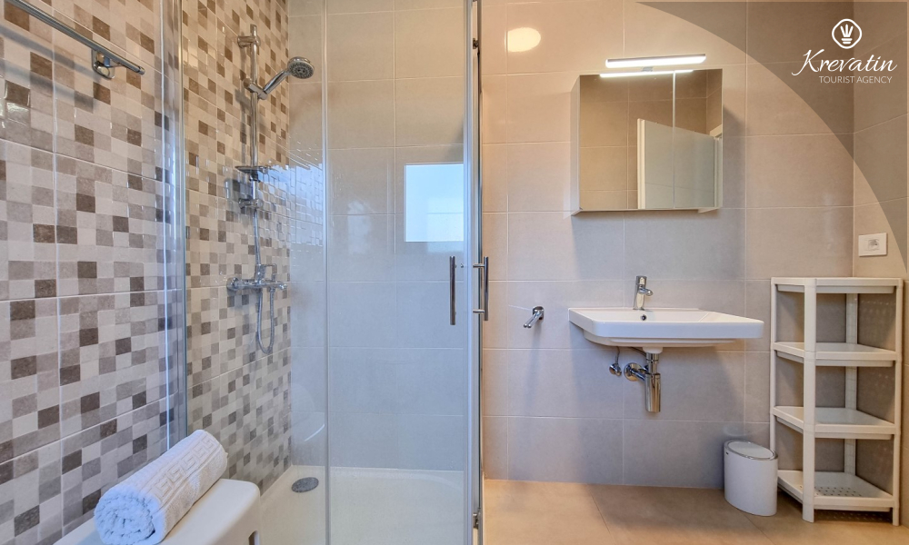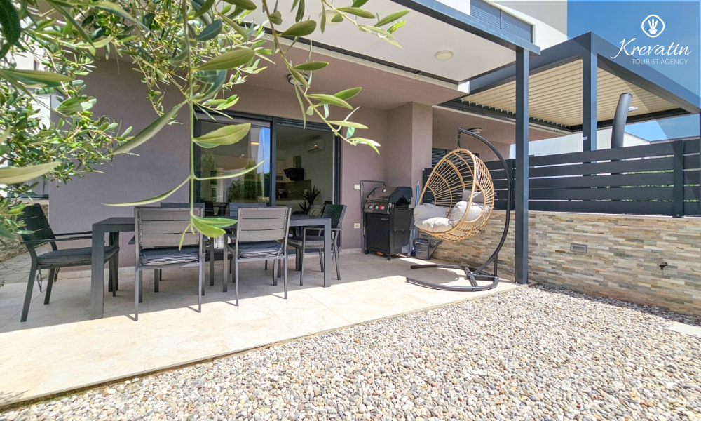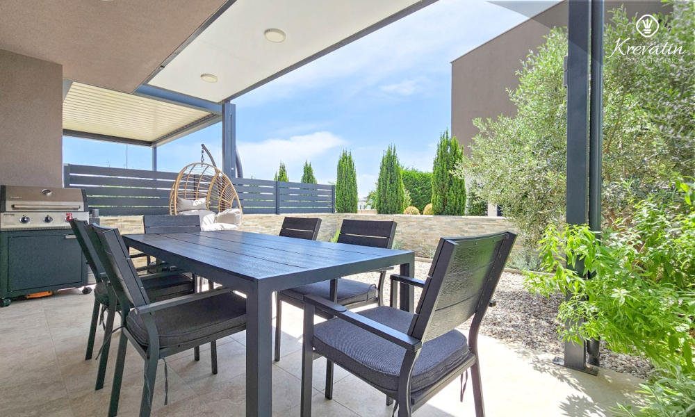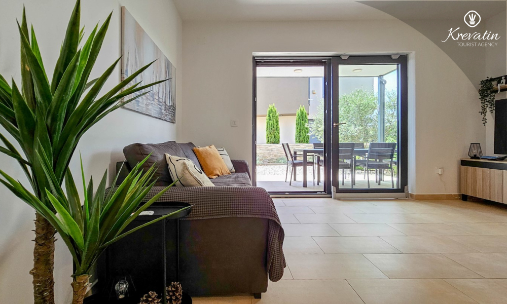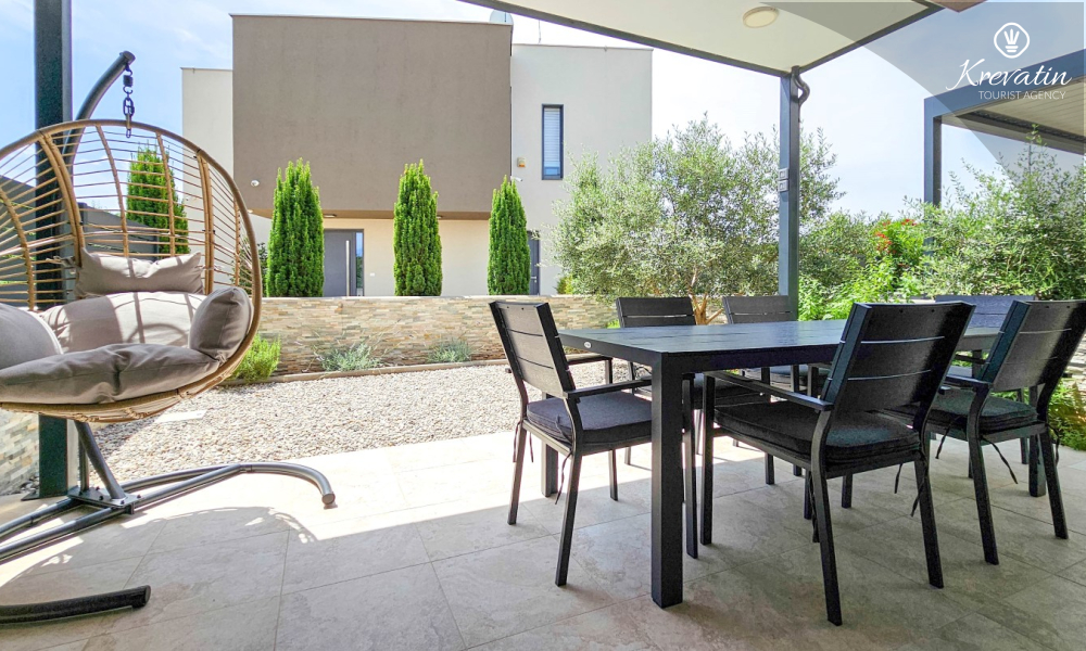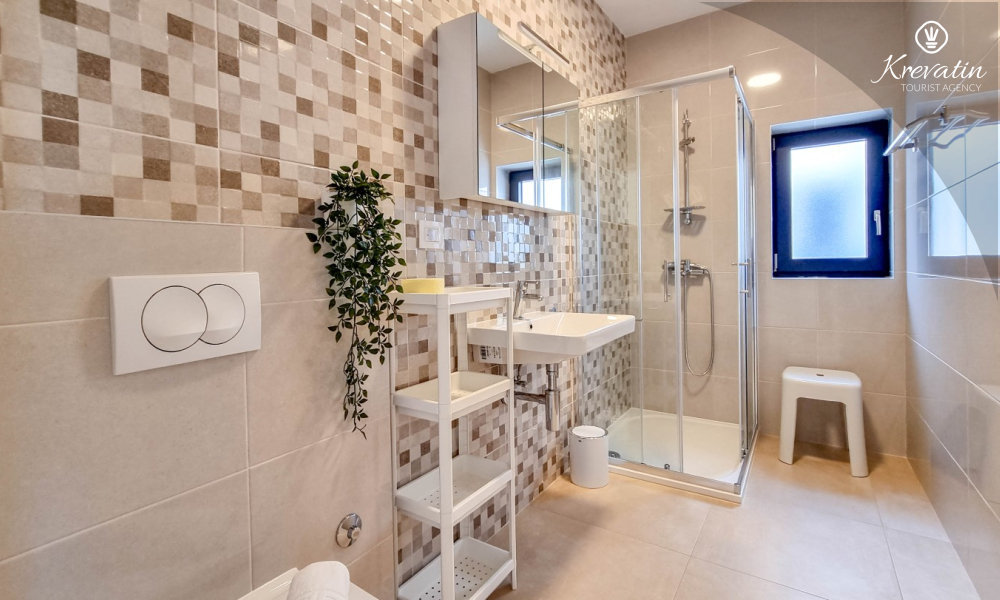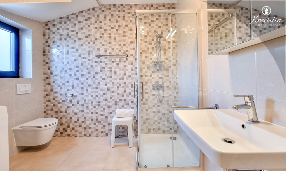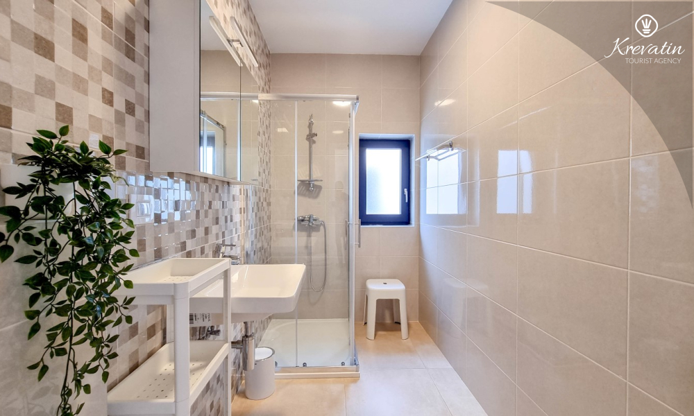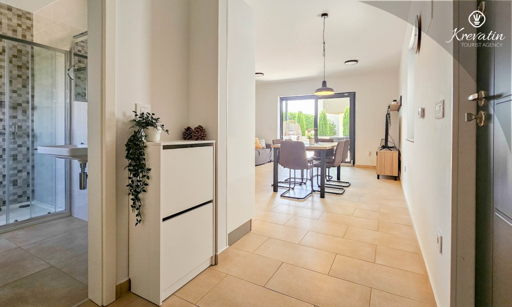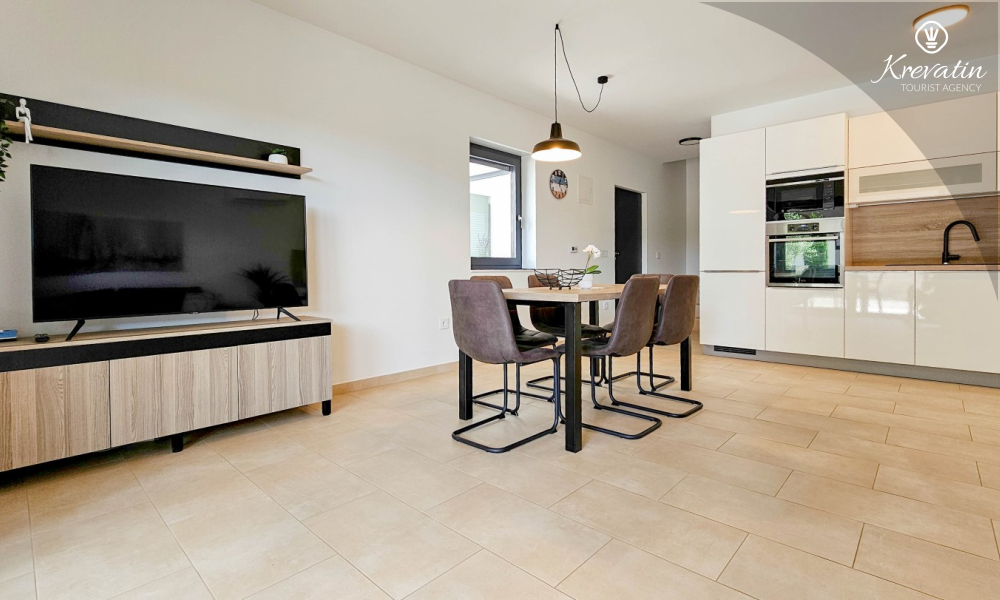 U prizemlju se nalazi prostrana kuhinja s blagovaonicom, udoban dnevni boravak s izlazom na terasu opremljenu stolom, stolicama i roštiljem, te jedna moderna kupaonica. Kuhinja je potpuno opremljena osnovnim stvarima za pripremu obroka. Na prvom katu nalaze se tri udobne spavaće sobe i još jedna kupaonica.