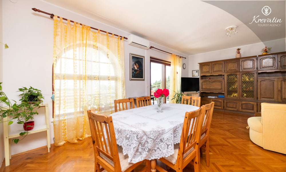 Ovaj apartman za 6 do 8 osoba, smješten je na prvom katu obiteljske kuće i sastoji se od tri spavaće sobe s bračnim krevetom, dnevnog boravka s kaučem za spavanje (za dvije osobe) te kuhinje s blagovaonicom. Kuhinja je opremljena sa električnim štednjakom, pećnicom, hladnjakom i aparatom za kavu. Nadalje tu su četiri kupaonice s tušem i WC-om te balkon sa stolom i stolicama i s pogledom na more. SAT-TV, klima, WLAN, posteljina i ručnici su uključeni u cijenu. Kućni ljubimci su dozvoljeni uz nadoplatu.