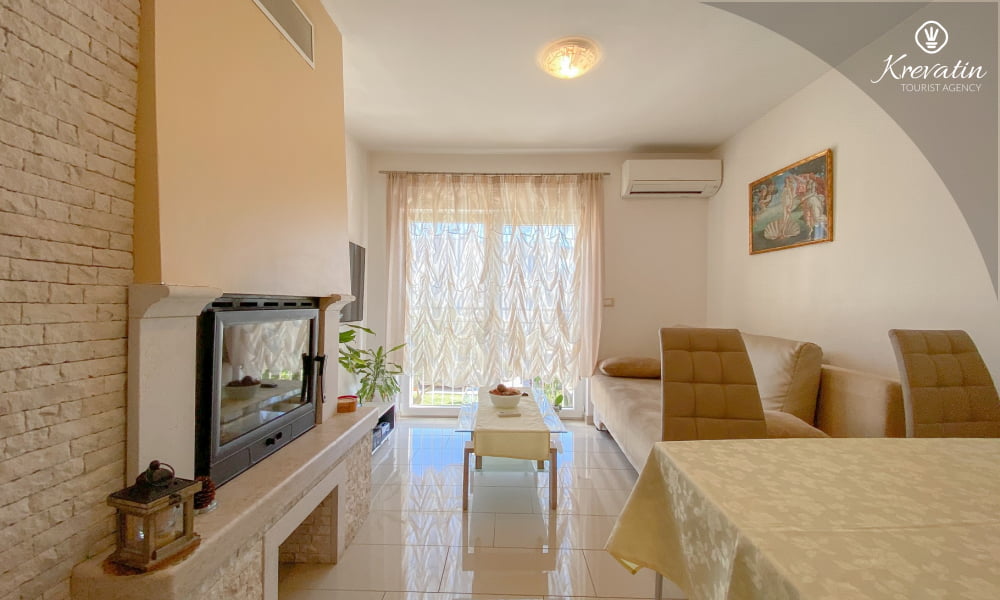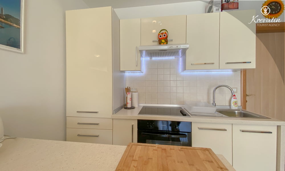 Apartman se sastoji od dvije udobne spavaće sobe s bračnim krevetima, dnevnog boravka sa sofom koja može poslužiti kao dodatni ležaj za dvije osobe, te kuhinje s blagovaonicom. Kuhinja je potpuno opremljena svim osnovnim stvarima. Apartman ima praktičnu kupaonicu s tušem i WC-om, te balkon s namještajem gdje možete uživati u boravku na otvorenom.