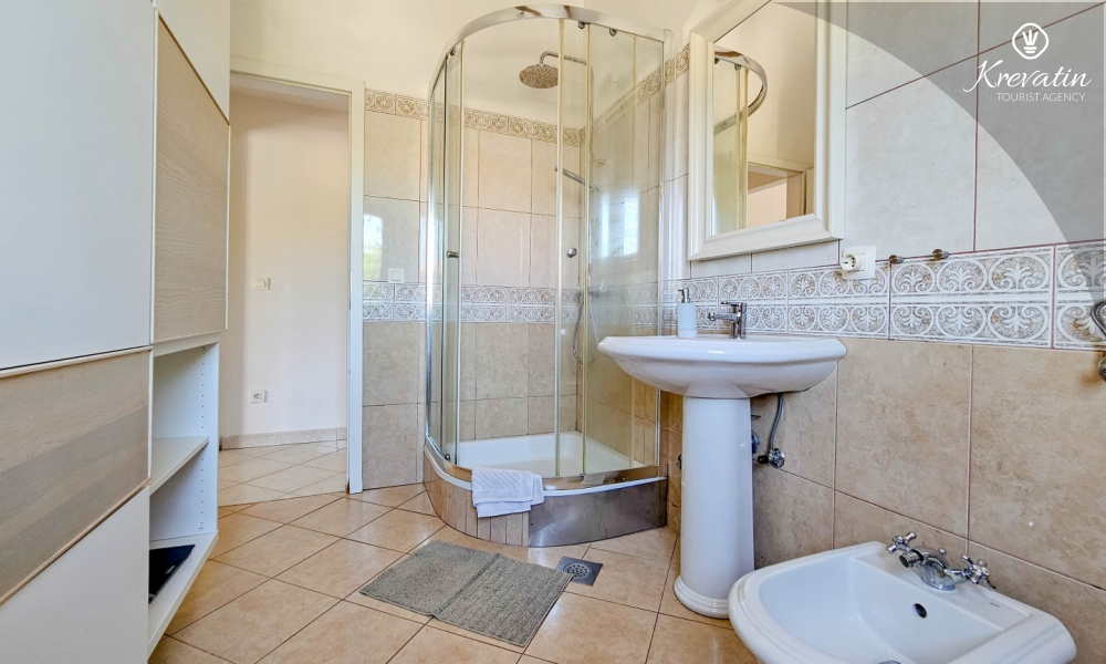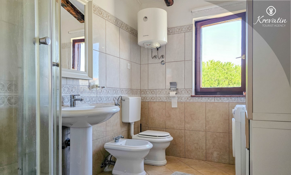 Kupatilo je praktično i funkcionalno, opremljeno tušem za osvježavajući početak dana te perilicom rublja koja vam omogućava da ostanete praktični čak i tijekom odmora.