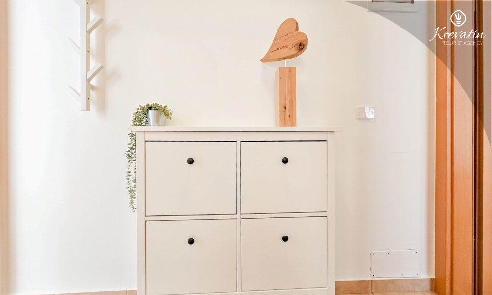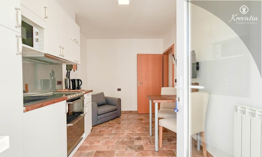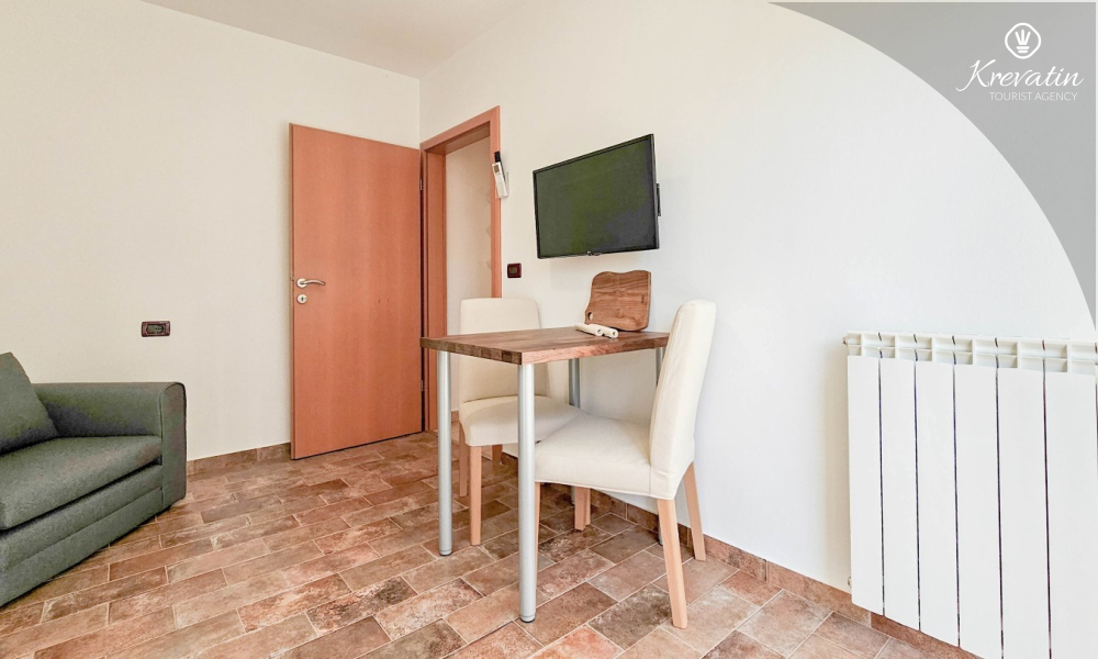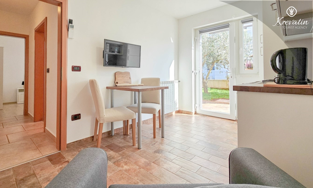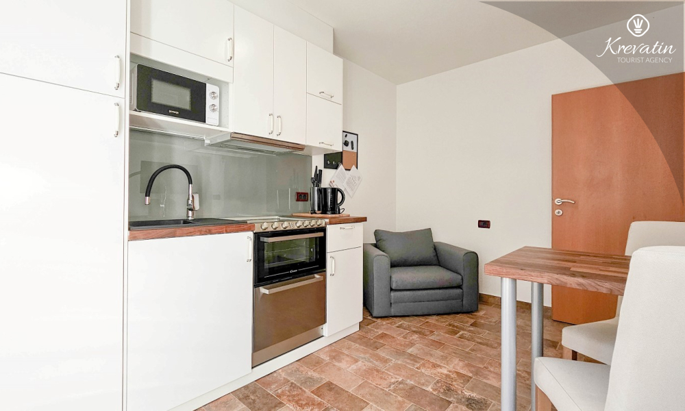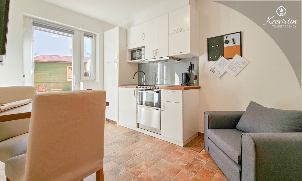Smješten je u prizemlju obiteljske kuće i sastoji se od spavaće sobe, kuhinje opremljene osnovnim stvarima za pripremu jednostavnih obroka te praktične kupaonice s tušem i WC-om. Ispred apartmana je vlastita mala terasa za jutarnje kave ili večernje čašice vina. Na raspolaganju je i velika zajednička terasa za ugodno druženje s ostalim gostima.