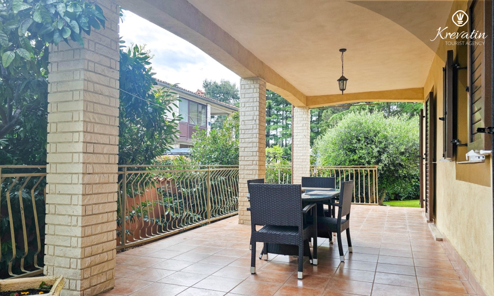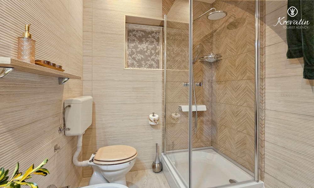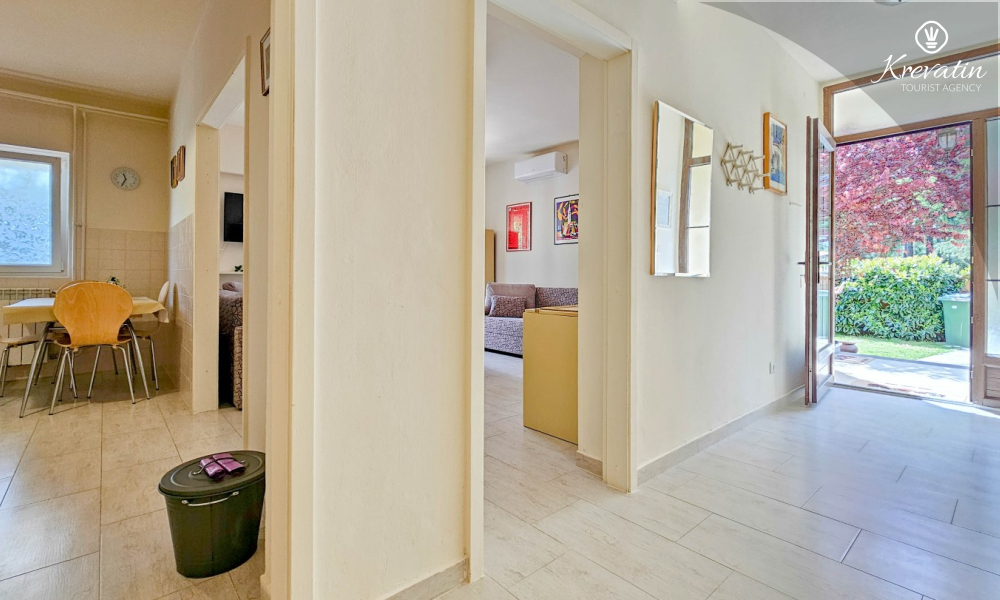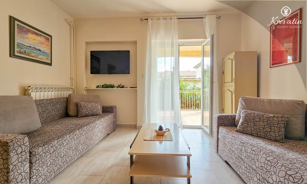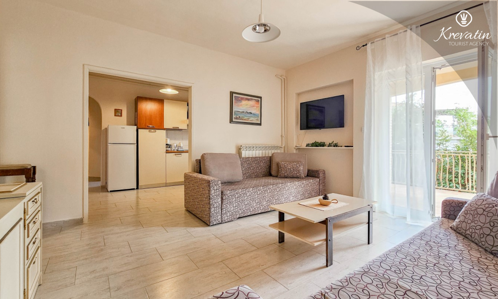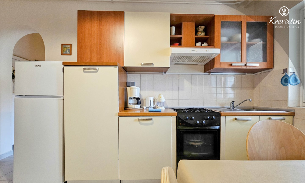 Apartman se sastoji od jedne spavaće sobe s bračnim krevetom, dnevnog boravka s dva kauča na razvlačenje te funkcionalne kuhinje opremljene osnovnim stvarima. Tu je i kupaonica s tušem i WC-om te natkrivena terasa s vrtnim namještajem – idealna za jutarnju kavu ili opuštene večeri.