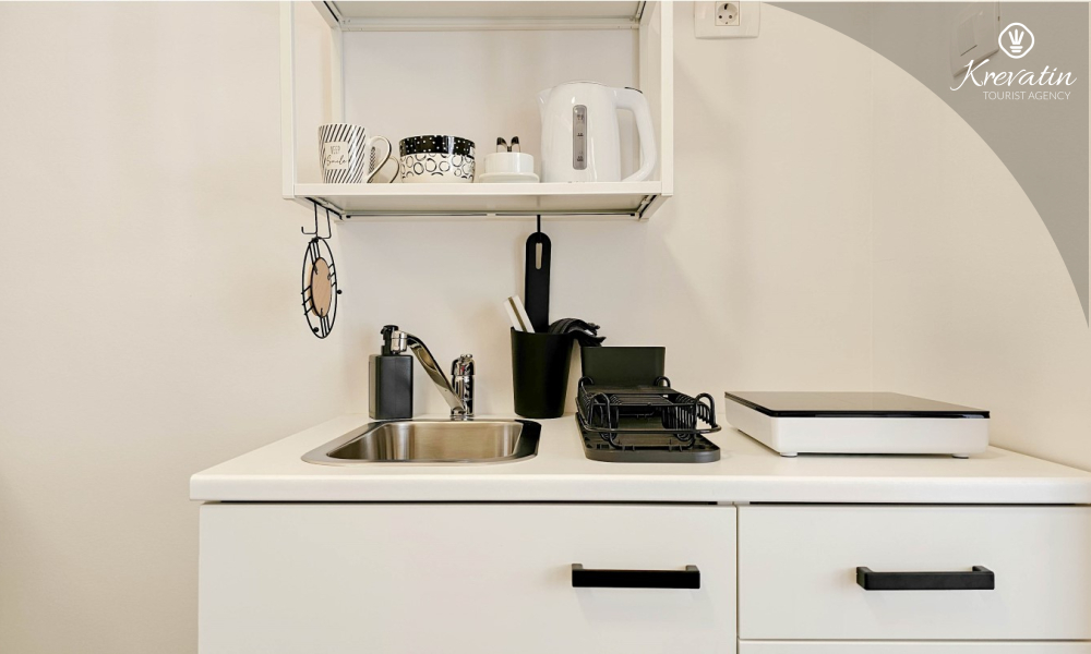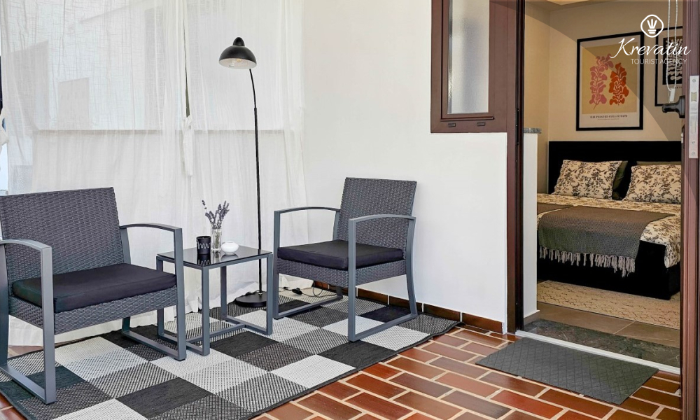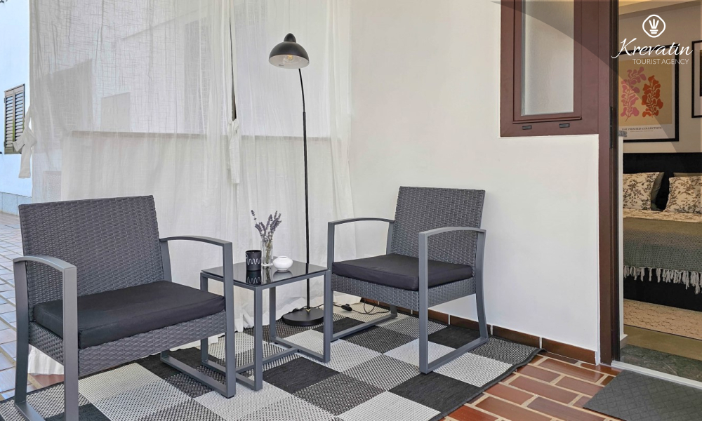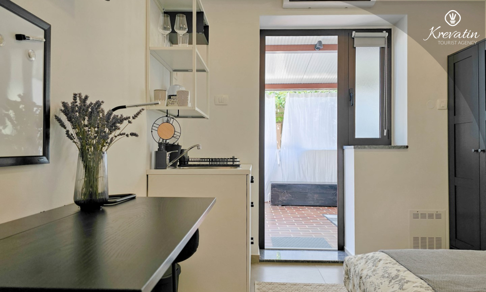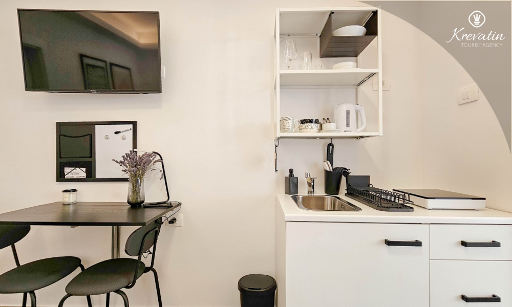 Studio ima udoban bračni krevet, mali kutak za kuhanje s osnovnom opremom te kupaonicu opremljena tušem i WC-om. Na raspolaganju je i terasa sa stolom i stolicama za uživanje na otvorenom.
