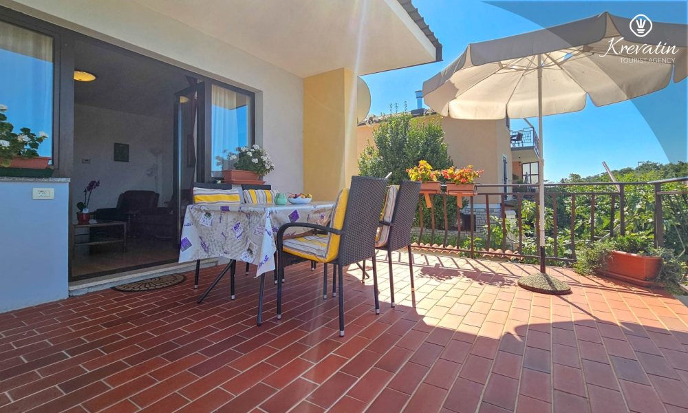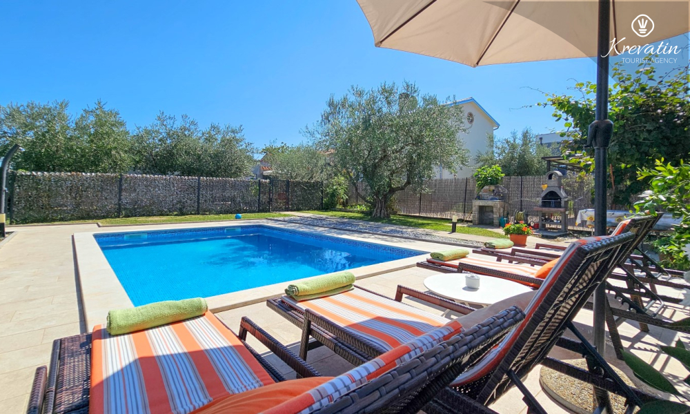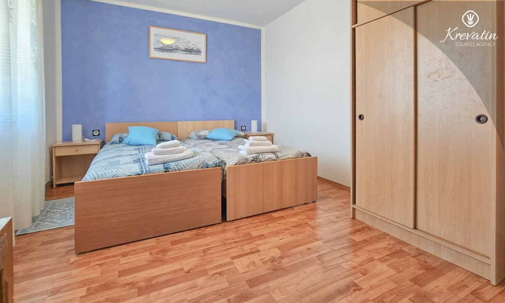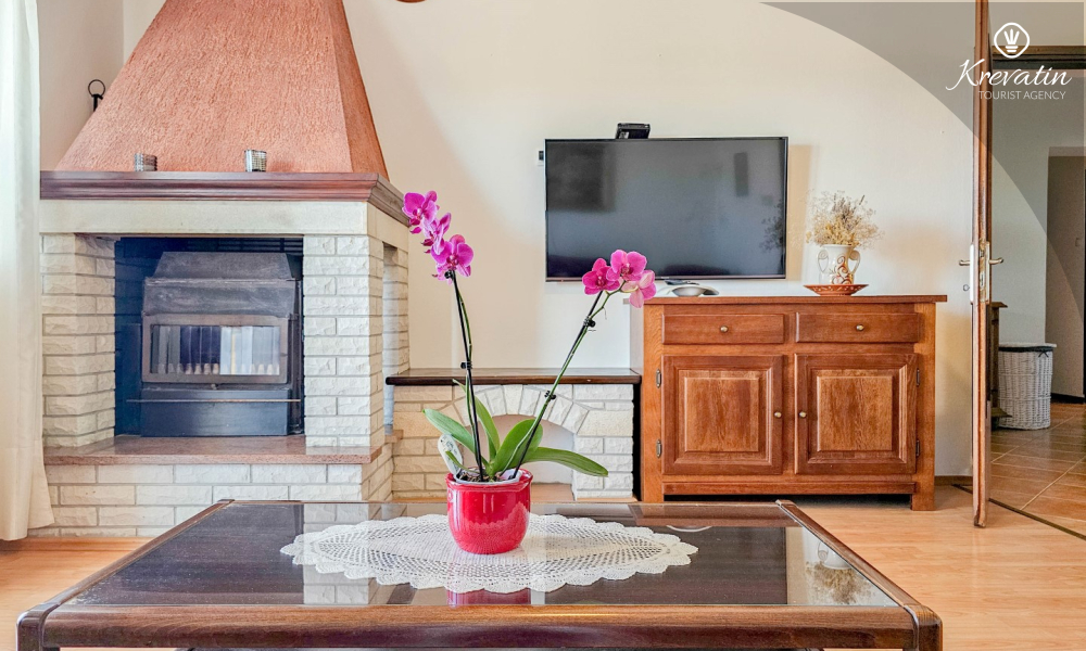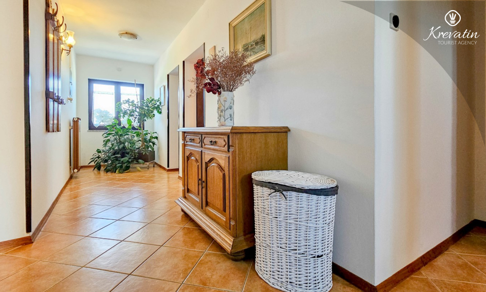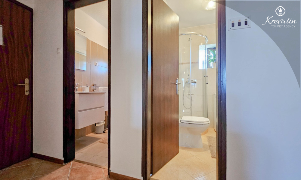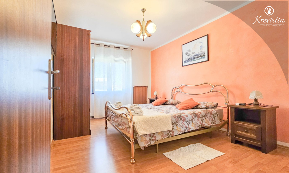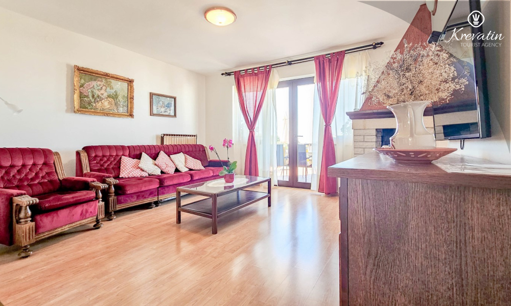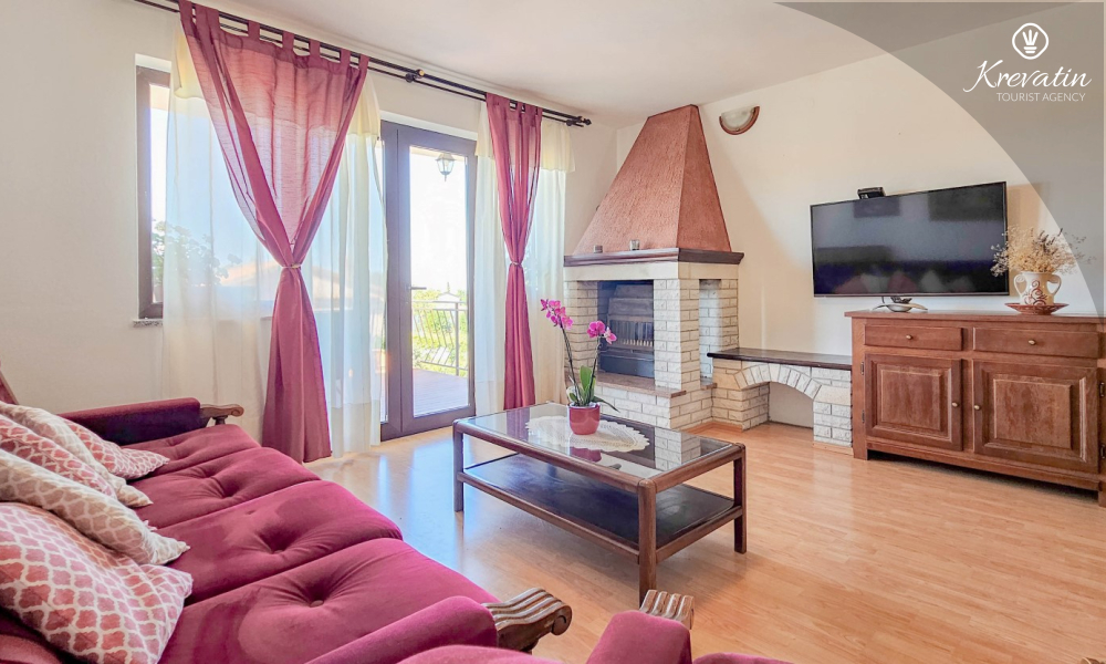 Na ulazu u apartman očekuje vas predsoblje s prostorom za sjedenje, idealno mjesto za opuštanje. Dnevni boravak povezan s prostranom kuhinjom ima izlaz na balkon s prekrasnim pogledom na okolno mjesto. Kuhinja je opremljena svim osnovnim stvarima za pripremu jednostavnih obroka. Apartman ima 2 udobne spavaće sobe te kupatilo s tušem. Također, tu je i zaseban WC s umivaonikom za dodatnu udobnost. Dva dodatna mjesta za spavanje nalaze se u dnevnom boravku na udobnom kauču.Na raspolaganju je veliki vrt s privatnim bazenom i ležaljkama te prostor za sjedenje gdje možete uživati na otvorenom. Parkirno mjesto osigurano je u dvorištu.