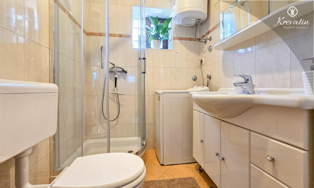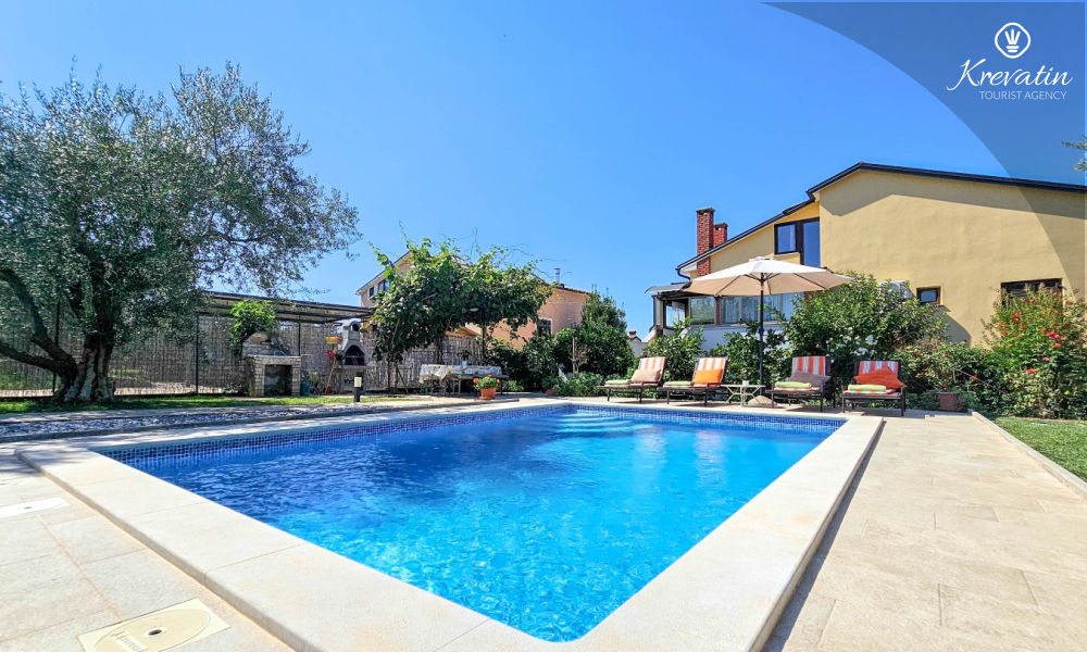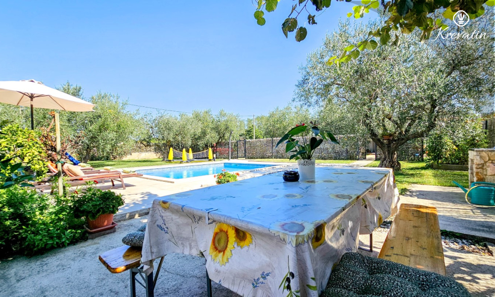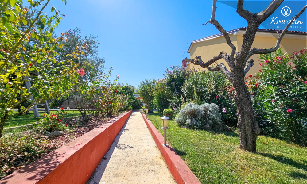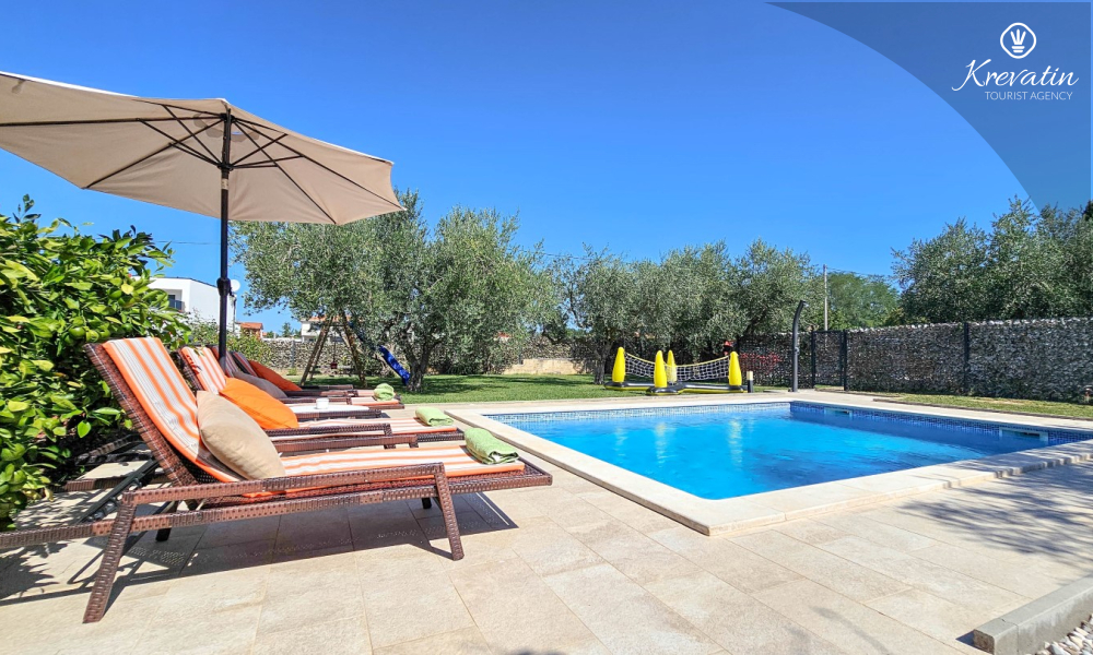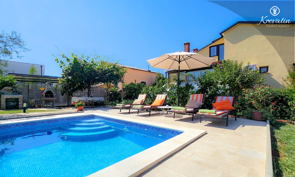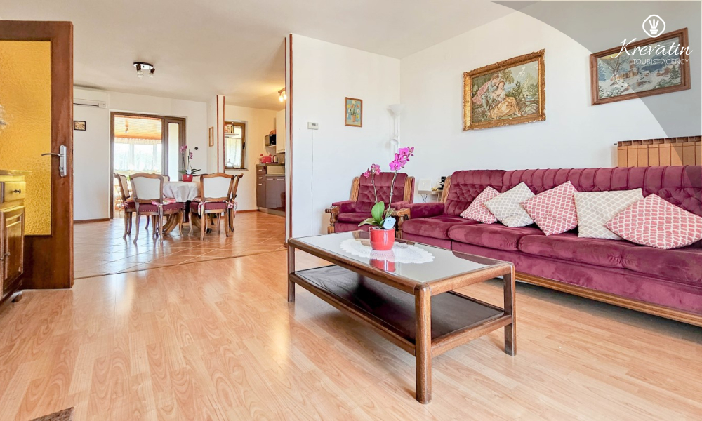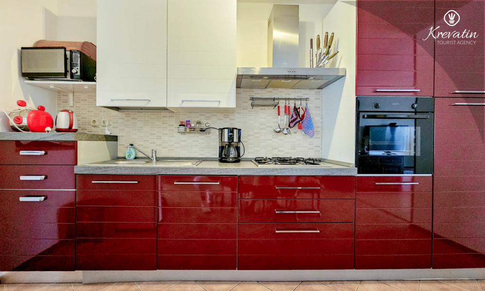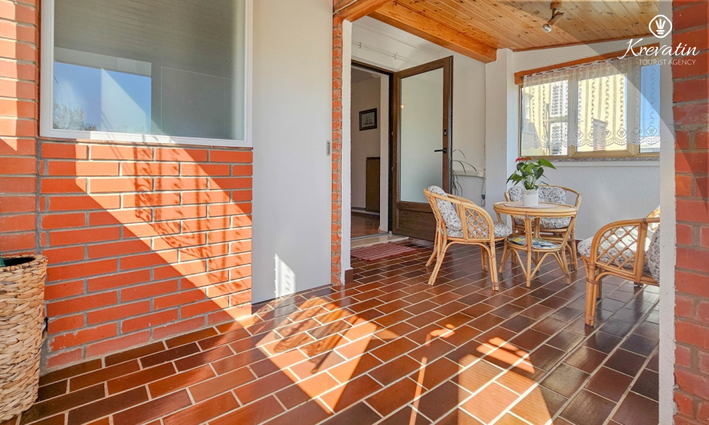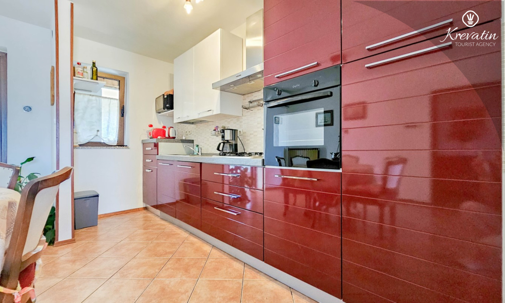 Na ulazu u apartman očekuje vas predsoblje s prostorom za sjedenje, idealno mjesto za opuštanje. Dnevni boravak povezan s prostranom kuhinjom ima izlaz na balkon s prekrasnim pogledom na okolno mjesto. Kuhinja je opremljena svim osnovnim stvarima za pripremu jednostavnih obroka. Apartman ima 2 udobne spavaće sobe te kupatilo s tušem. Također, tu je i zaseban WC s umivaonikom za dodatnu udobnost. Dva dodatna mjesta za spavanje nalaze se u dnevnom boravku na udobnom kauču.Na raspolaganju je veliki vrt s privatnim bazenom i ležaljkama te prostor za sjedenje gdje možete uživati na otvorenom. Parkirno mjesto osigurano je u dvorištu.