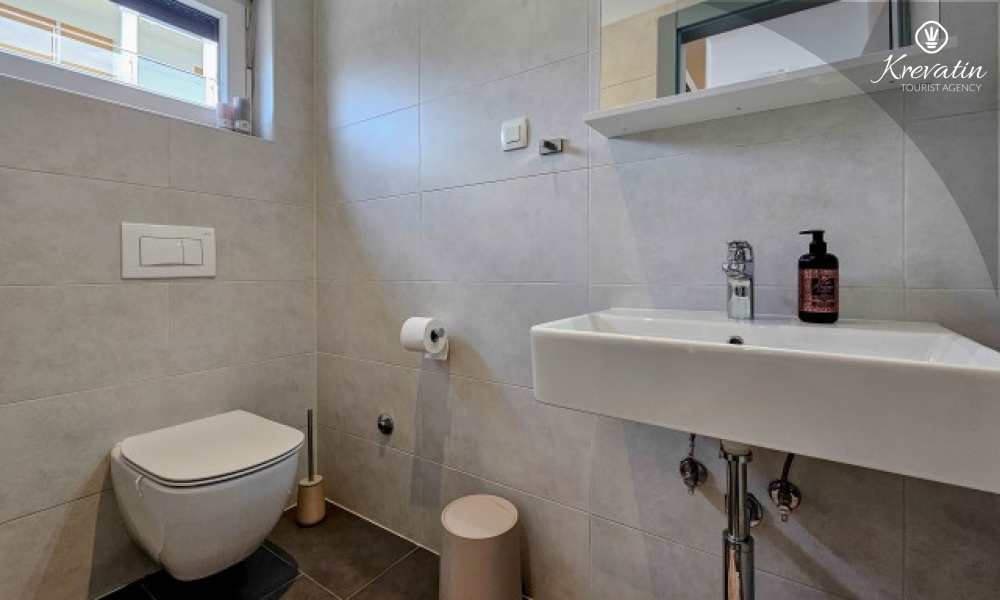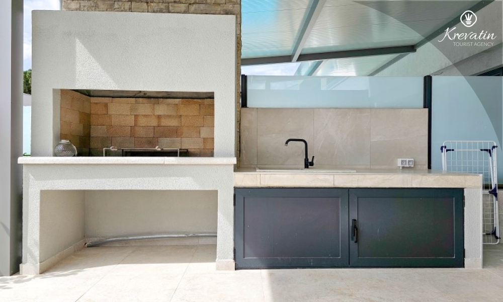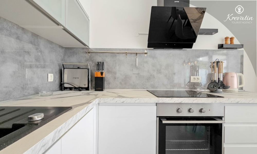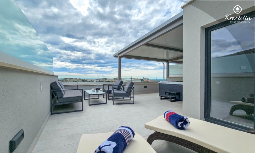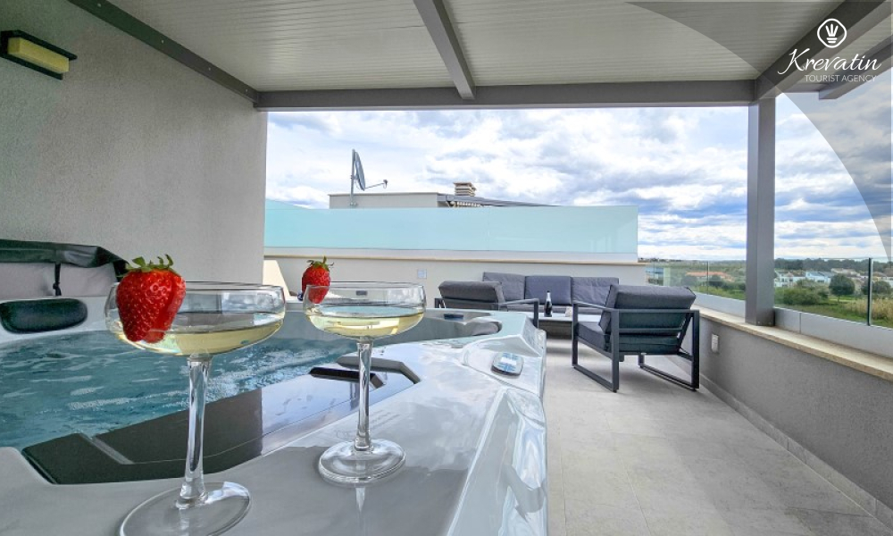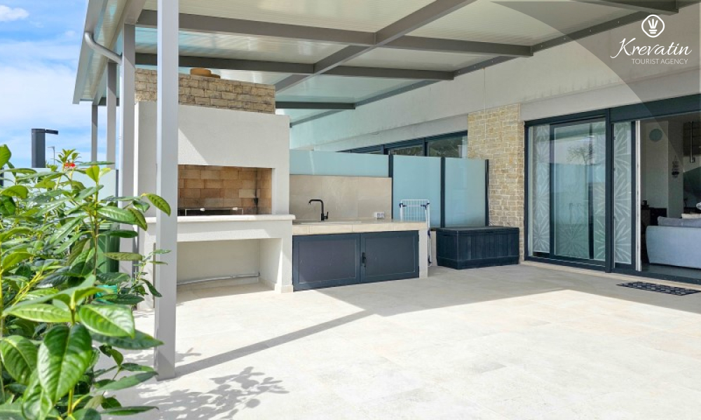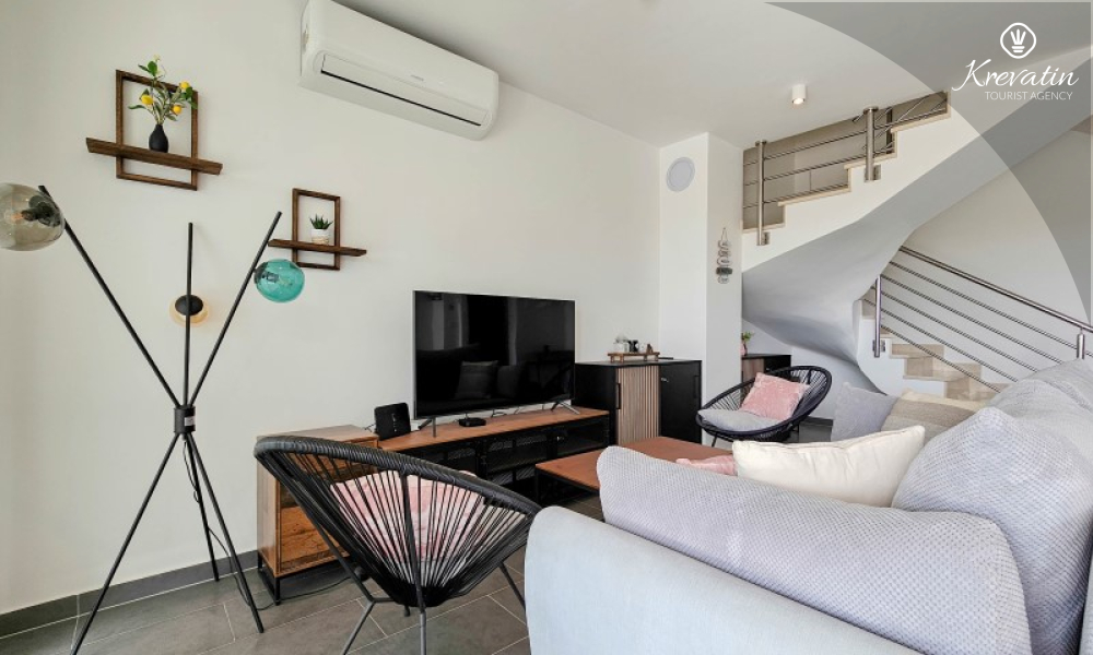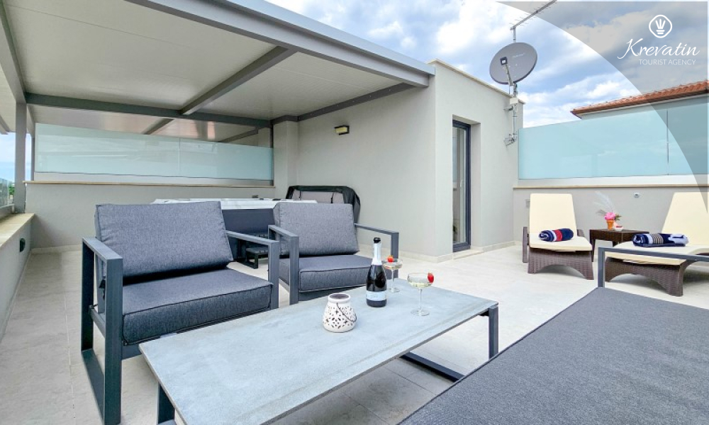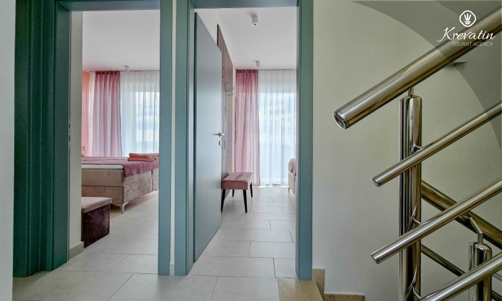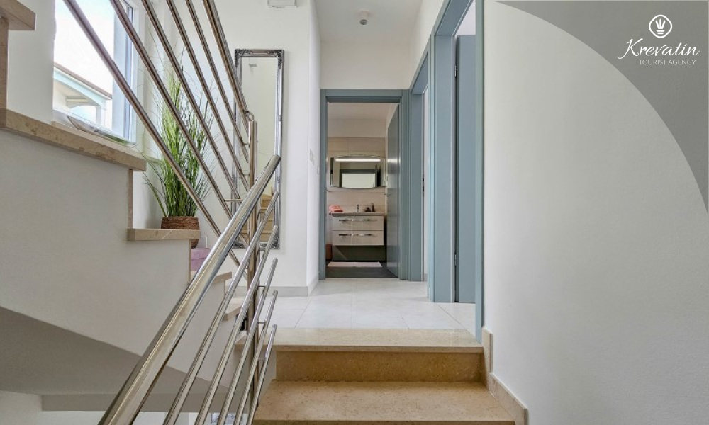 U prizemlju se nalazi prostrani dnevni boravak povezan s blagovaonicom i kuhinjom – opremljenom svim osnovnim stvarima za pripremu obroka, te kupaonica s tušem i WC-om. Na katu su dvije spavaće soba s bračnim krevetima i balkonom, te dodatna kupaonica, a dodatne dvije osobe mogu udobno spavati u dnevnom boravku. Na krovnoj terasi se nalazi jacuzzi i vrtni namještaj, a u prizemlju se nalazi prostrana terasa za opuštanje i roštilj.